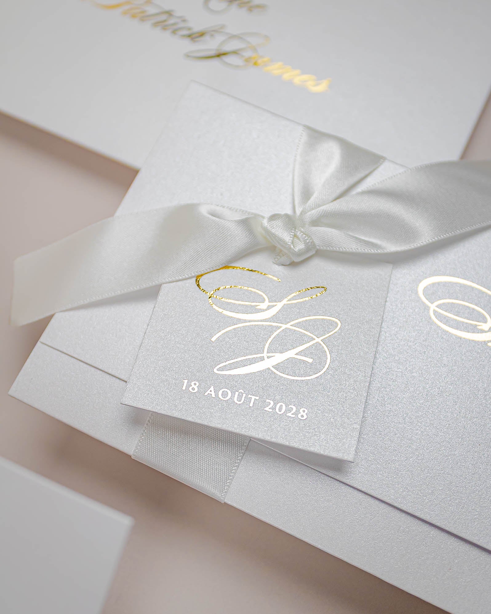 Faire-part simple et élégant fermé par un beau ruban en satin orné d'une étiquette personnalisée.