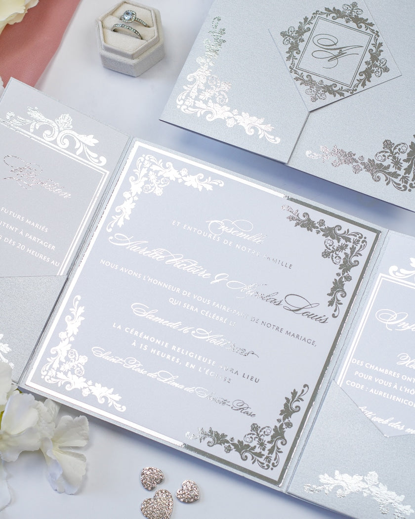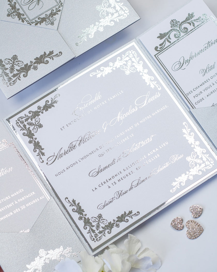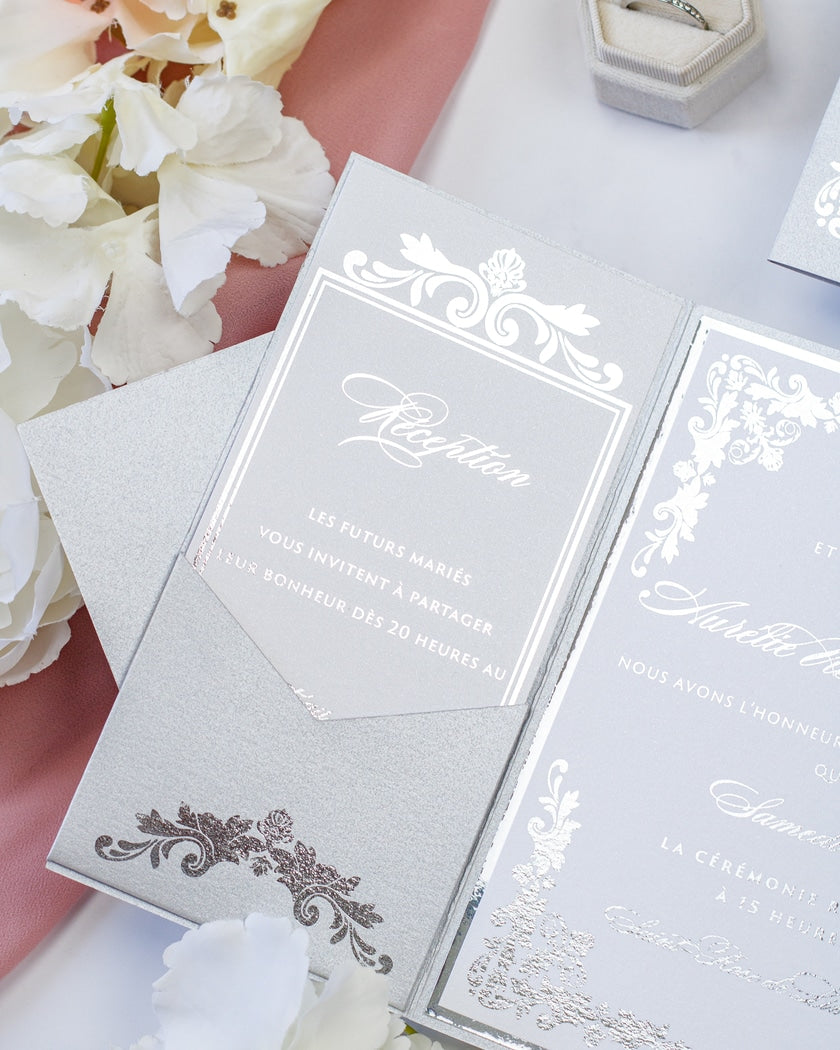 Magnifique faire-part de mariage chic et luxueux, sublimé par la finition dorure.