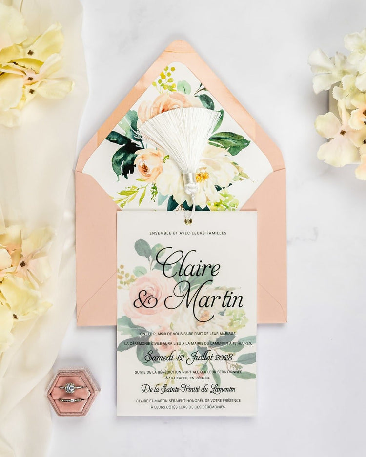 Faire-part romantique imprimé sur du papier calque avec un motif floral sur la carte, le tout maintenu par un œillet en métal.