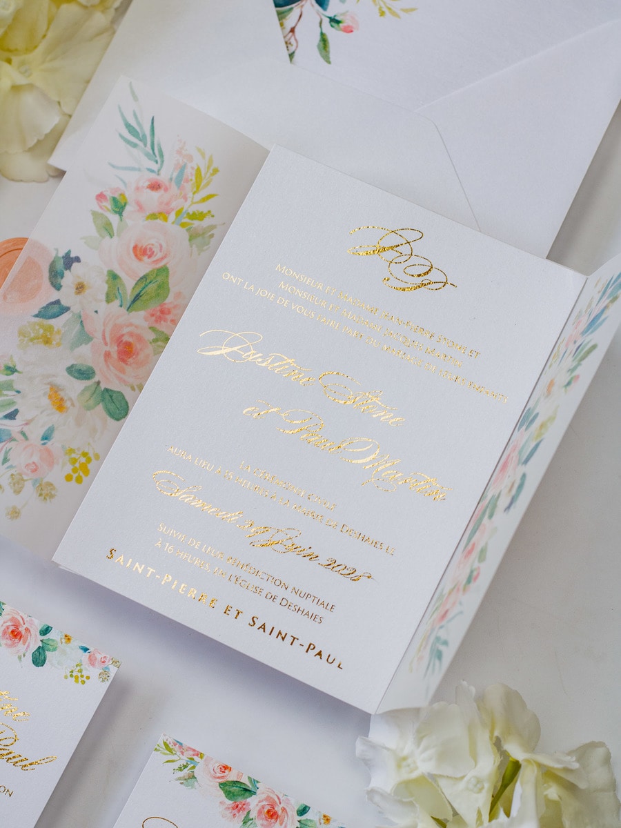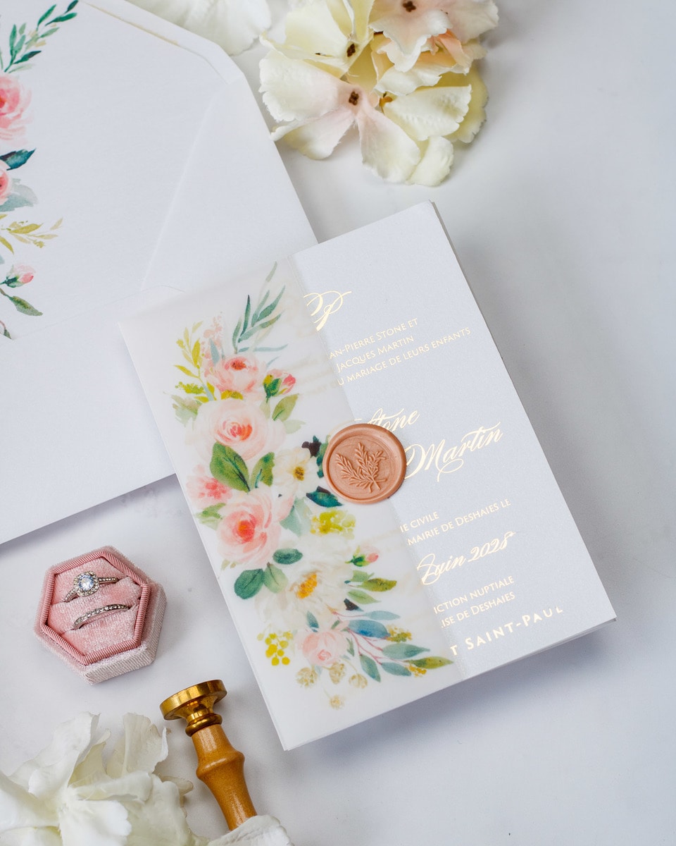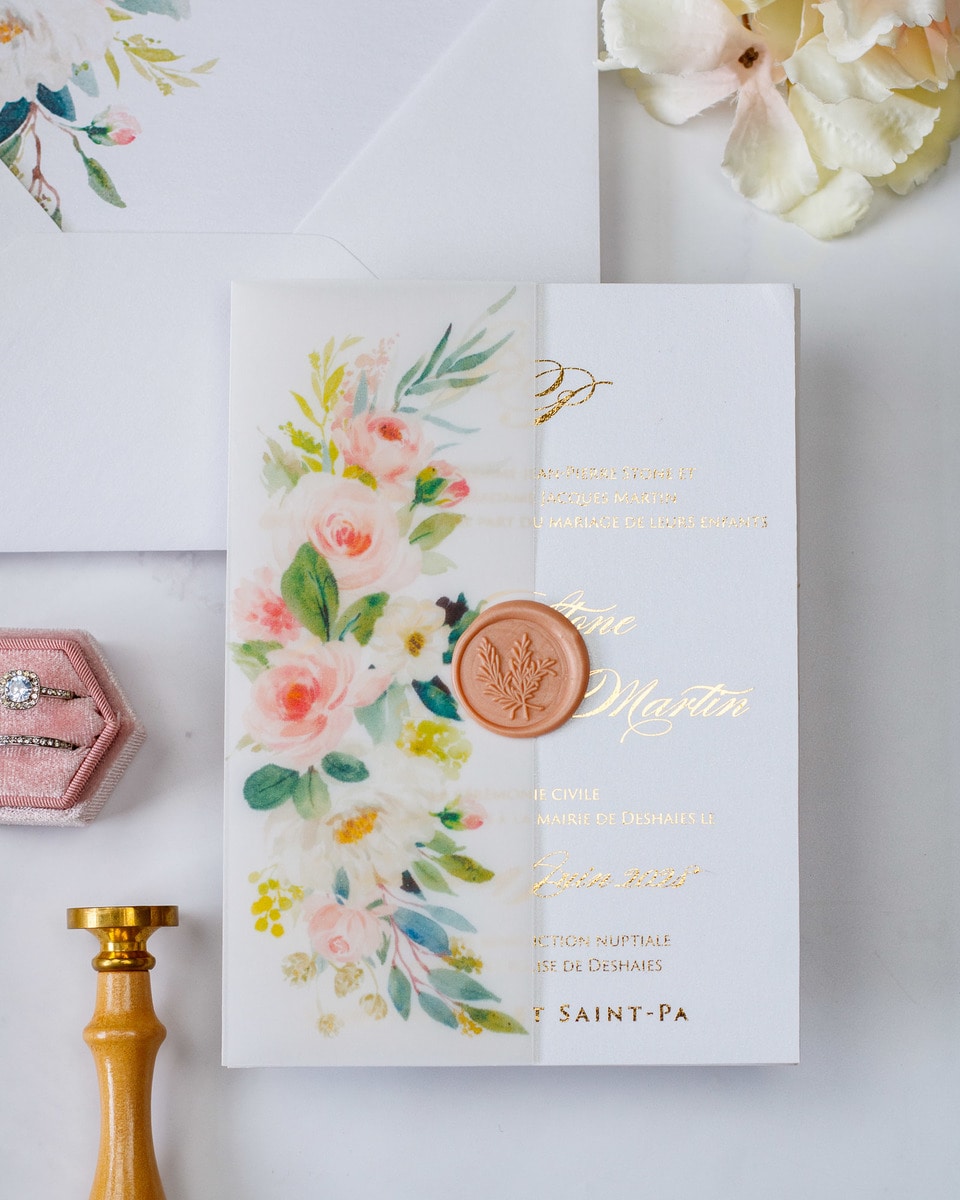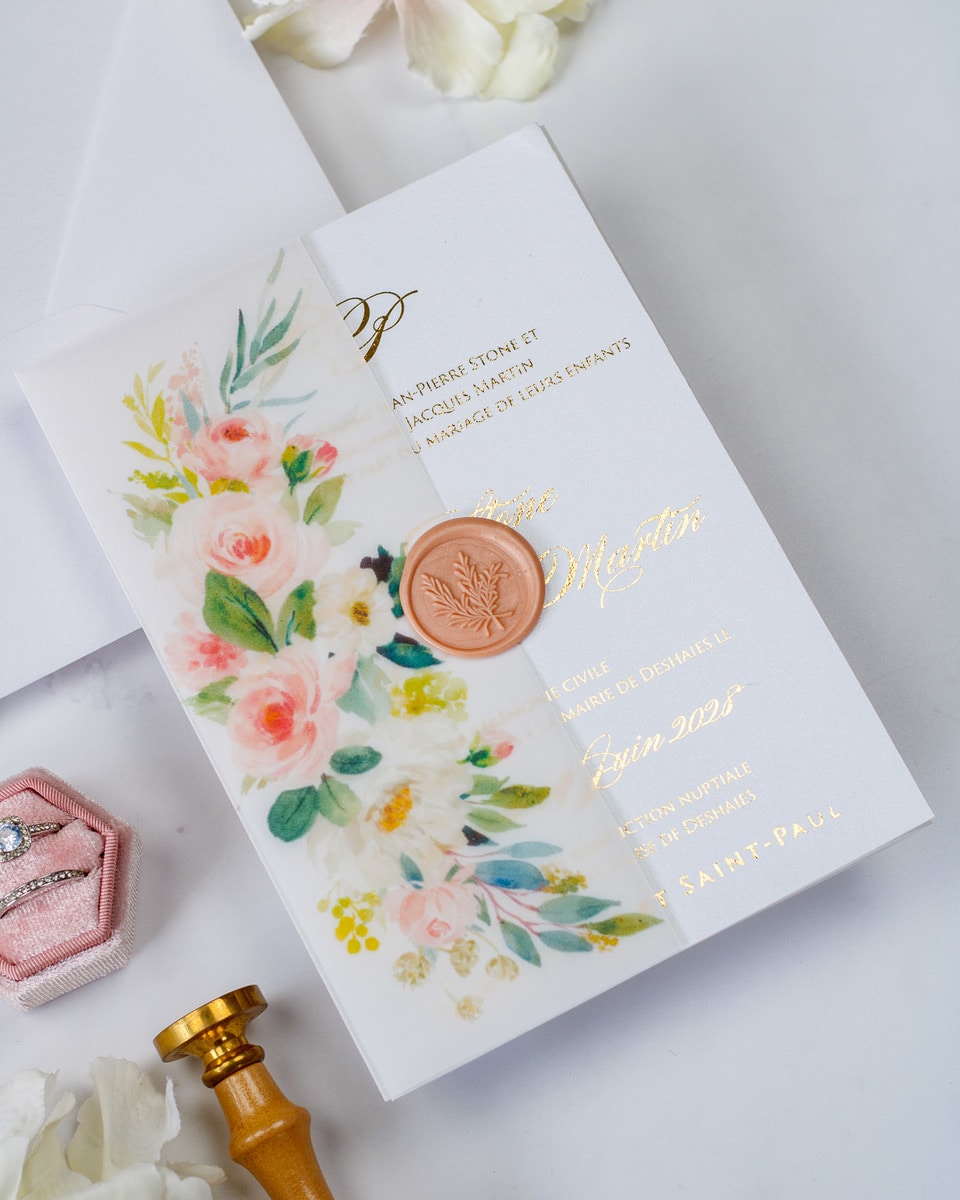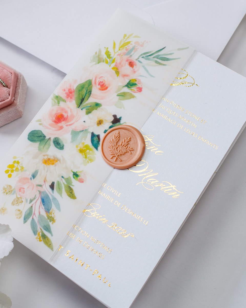 Elégant faire-part de mariage sublimé par une finition or,imprimé de motifs floraux et fermé par un cachet de cire.