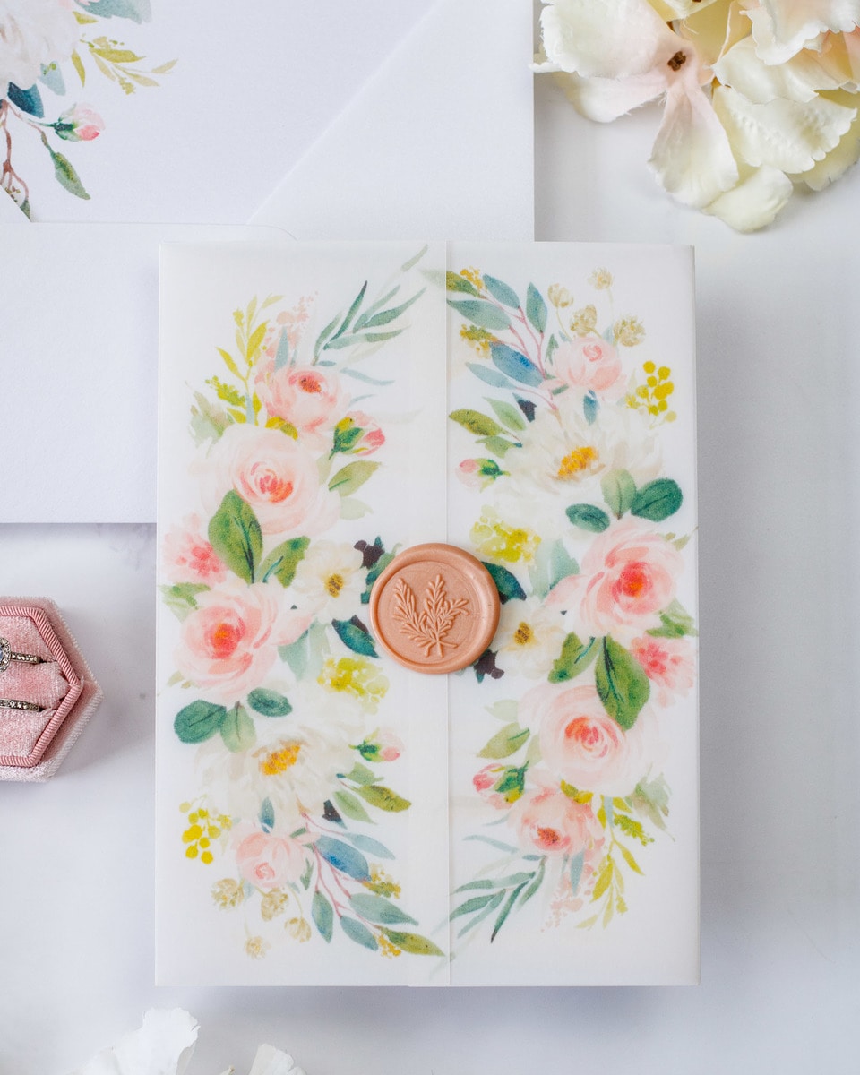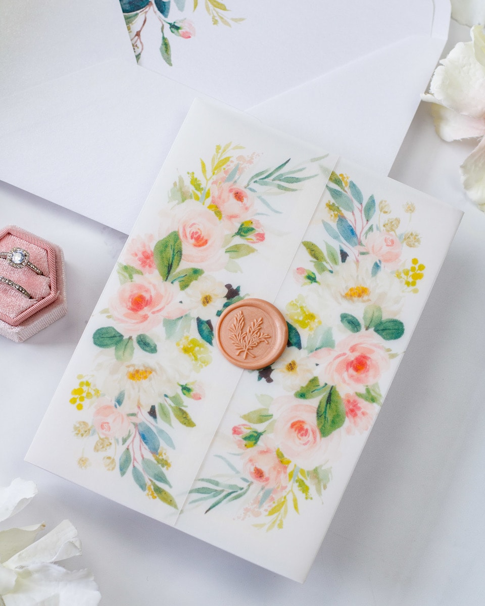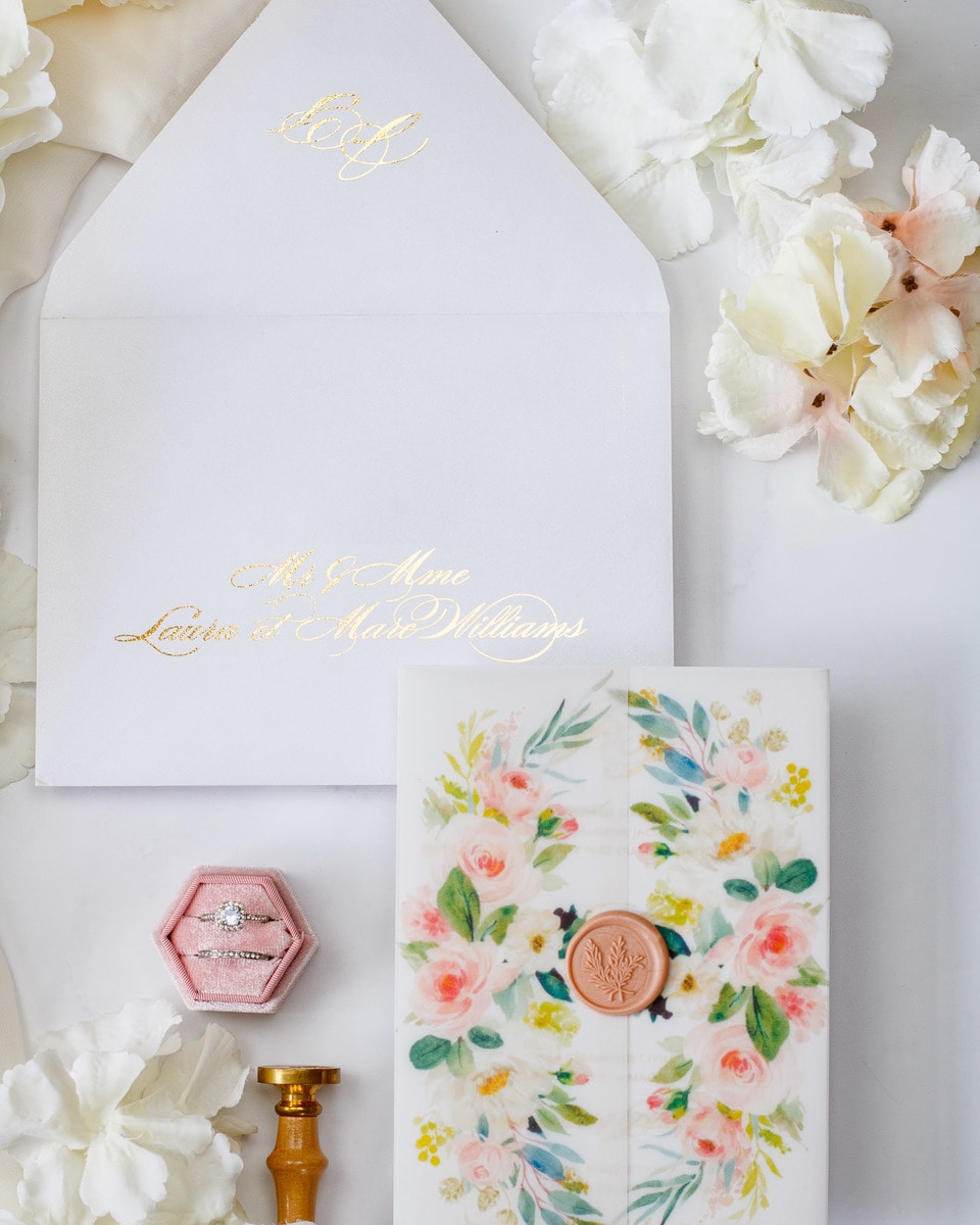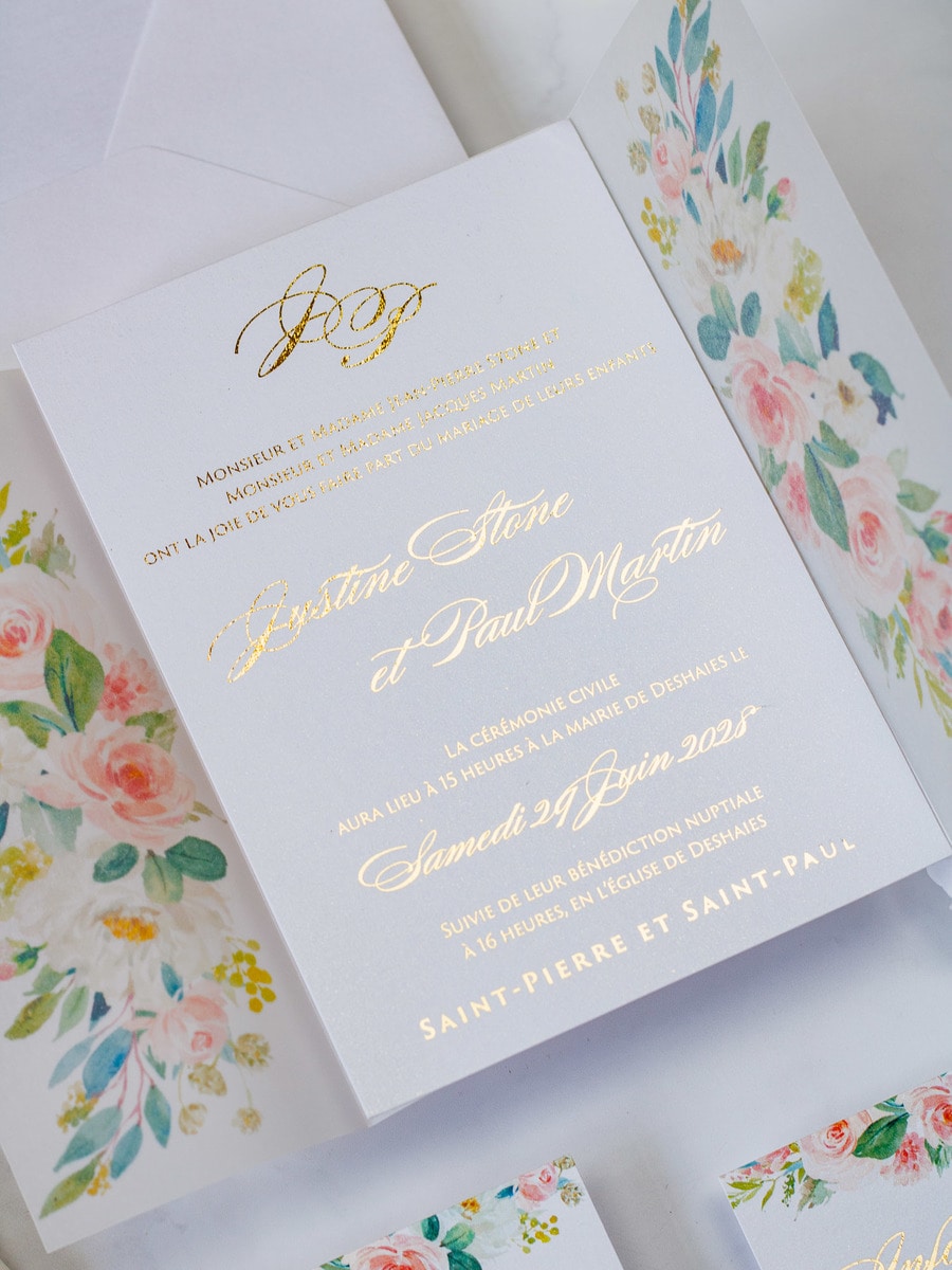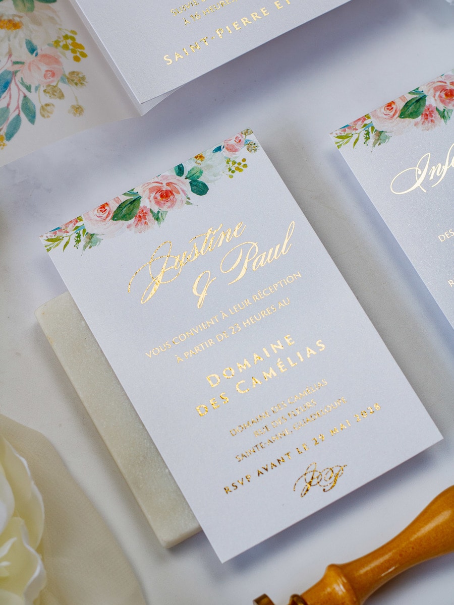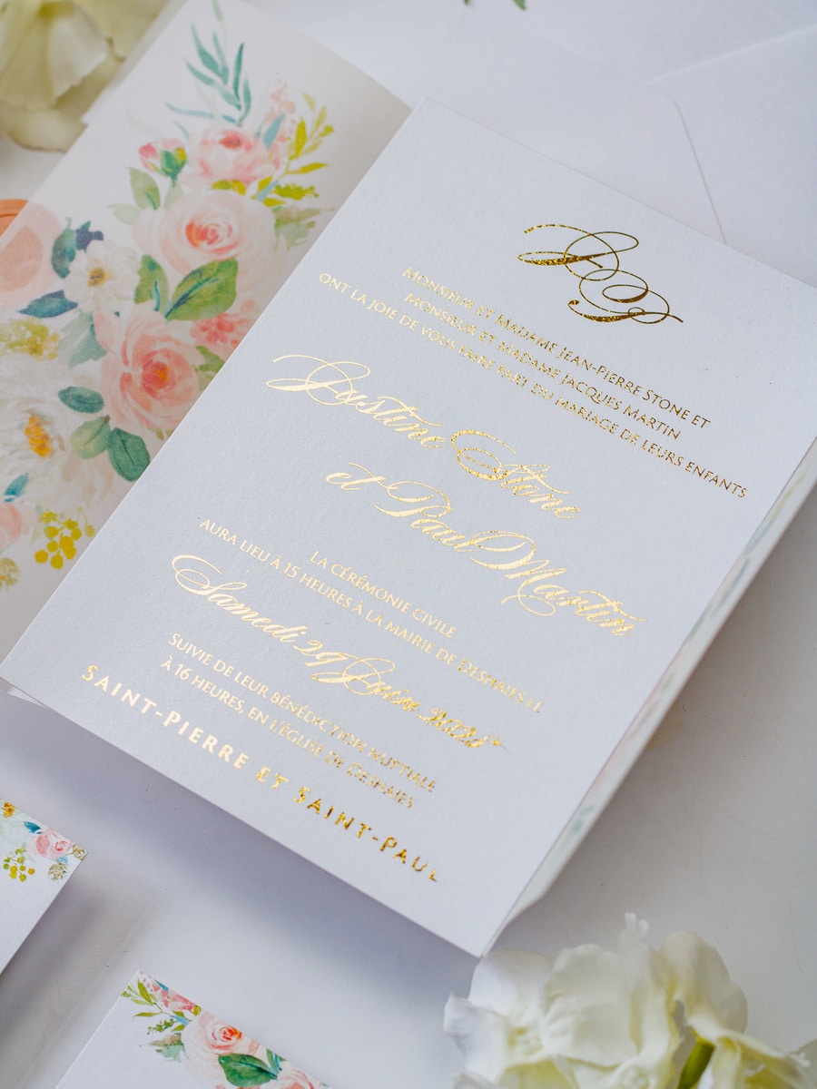 Elégant faire-part de mariage sublimé par une finition or,imprimé de motifs floraux et fermé par un cachet de cire.
