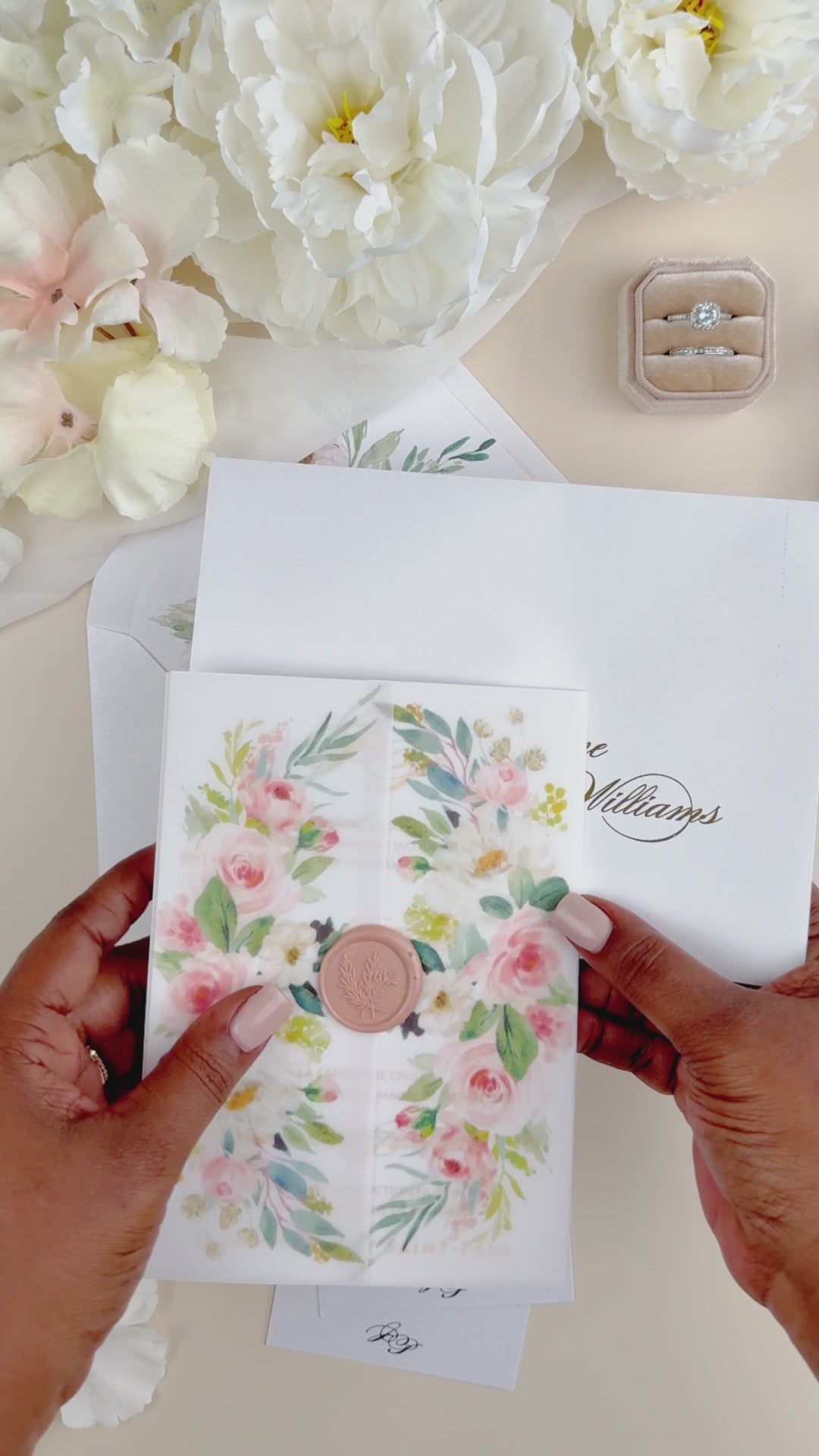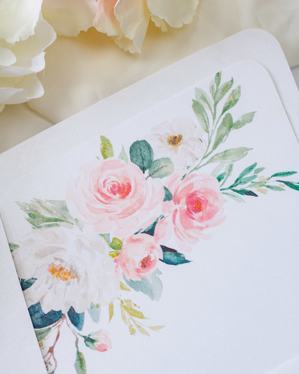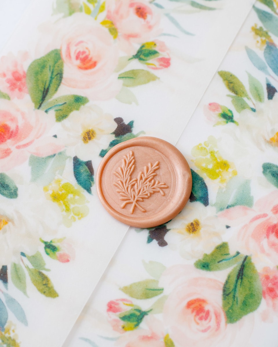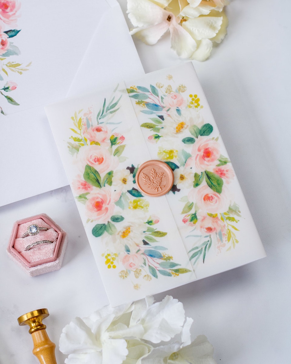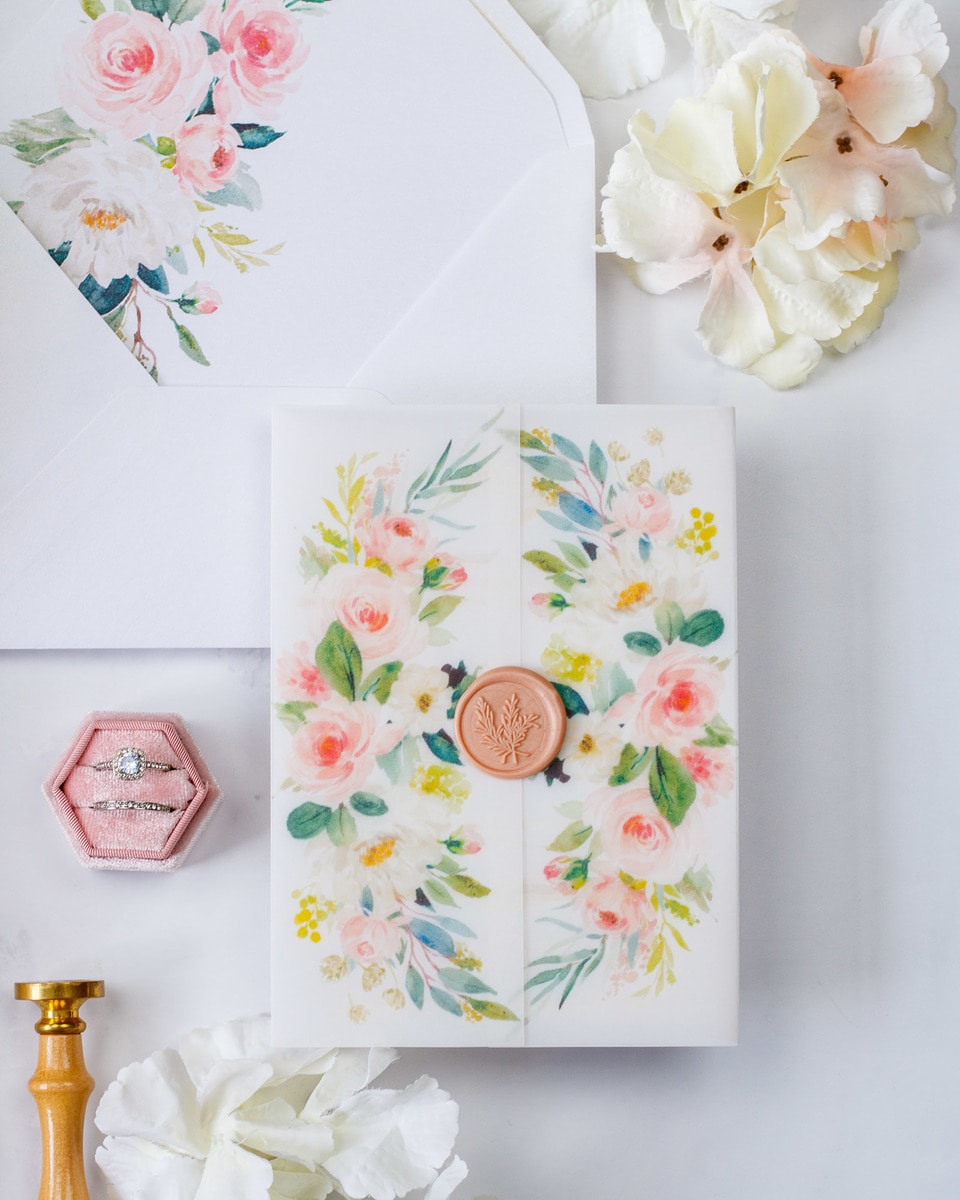 Elégant faire-part de mariage sublimé par une finition or,imprimé de motifs floraux et fermé par un cachet de cire.