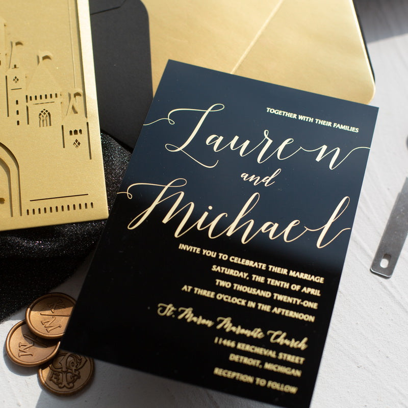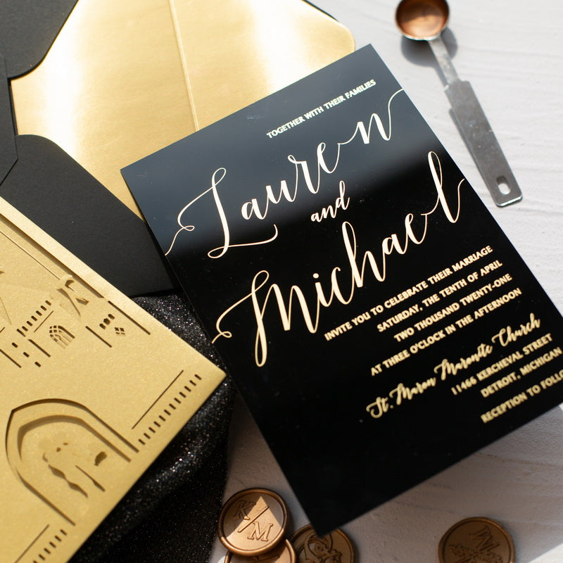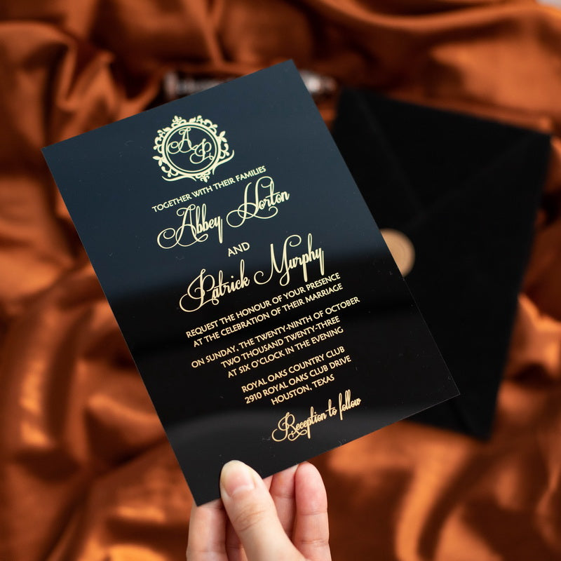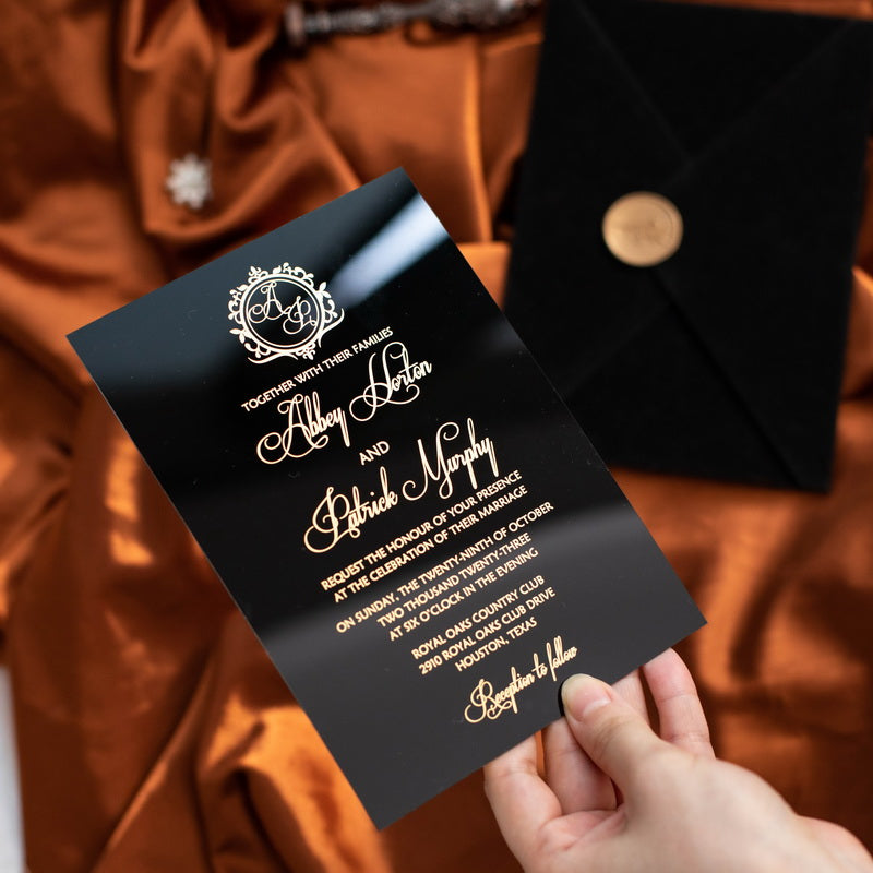 Le faire-part acrylique capte l’œil comme une pièce bijou : il joue avec les reflets, magnifie les dorures et transforme l’annonce de votre mariage en un objet précieux.