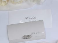 Faire-part de mariage simple et élégant orné d'un bouton strass à l'avant.