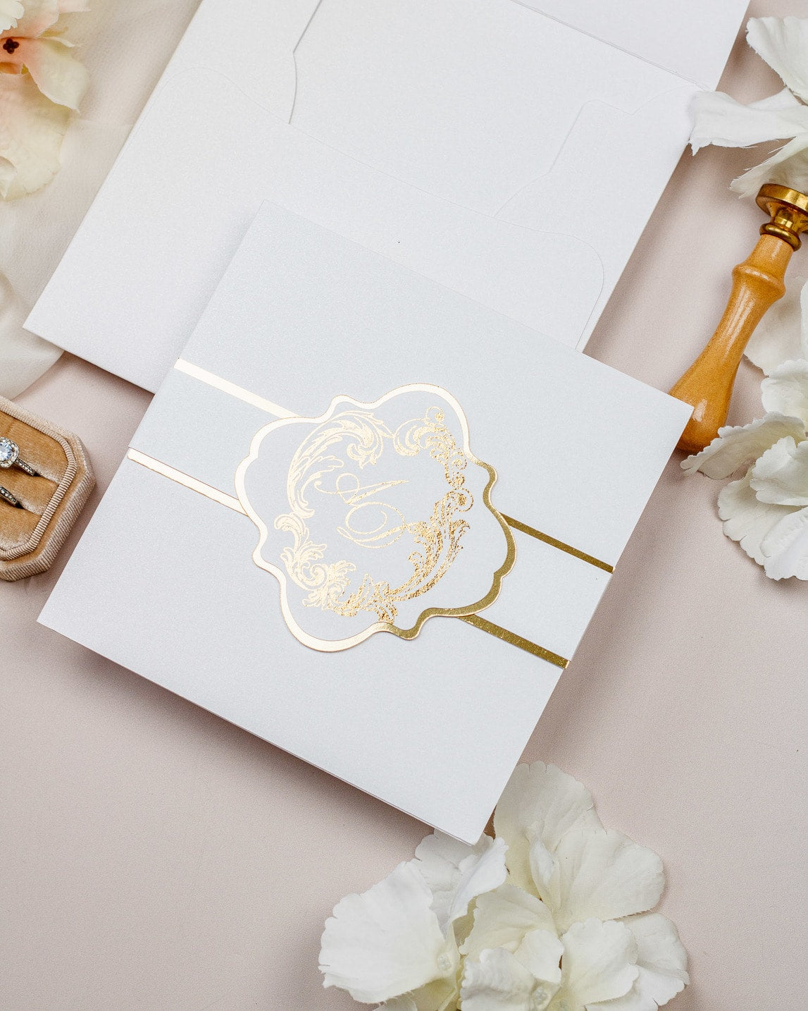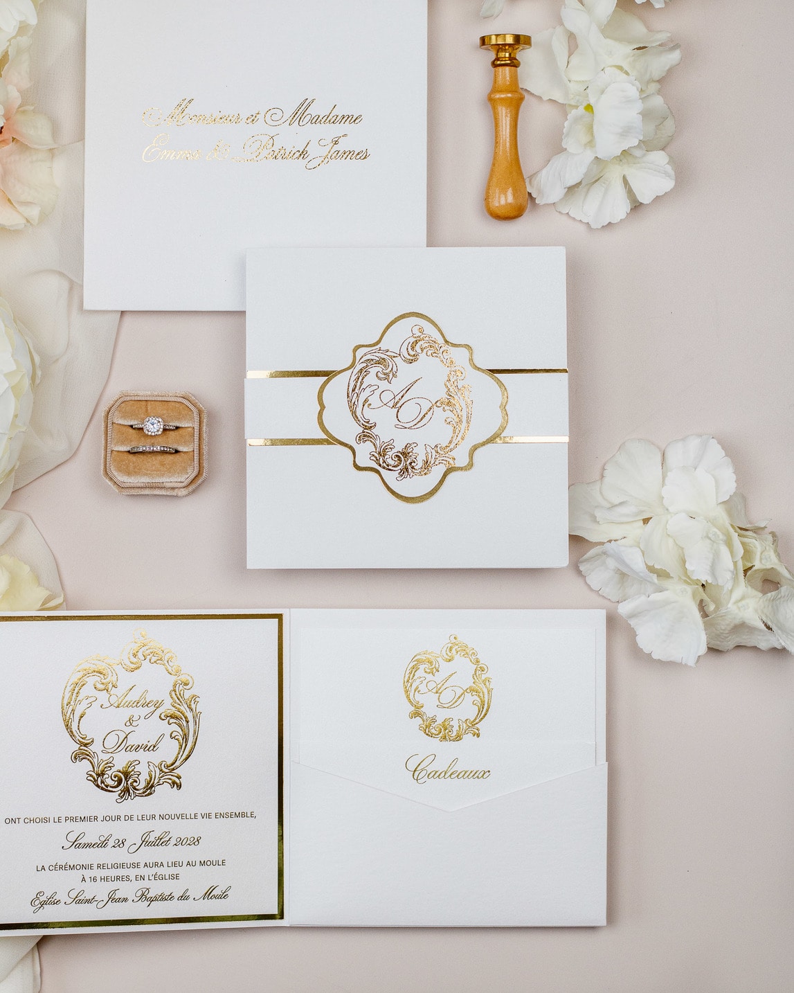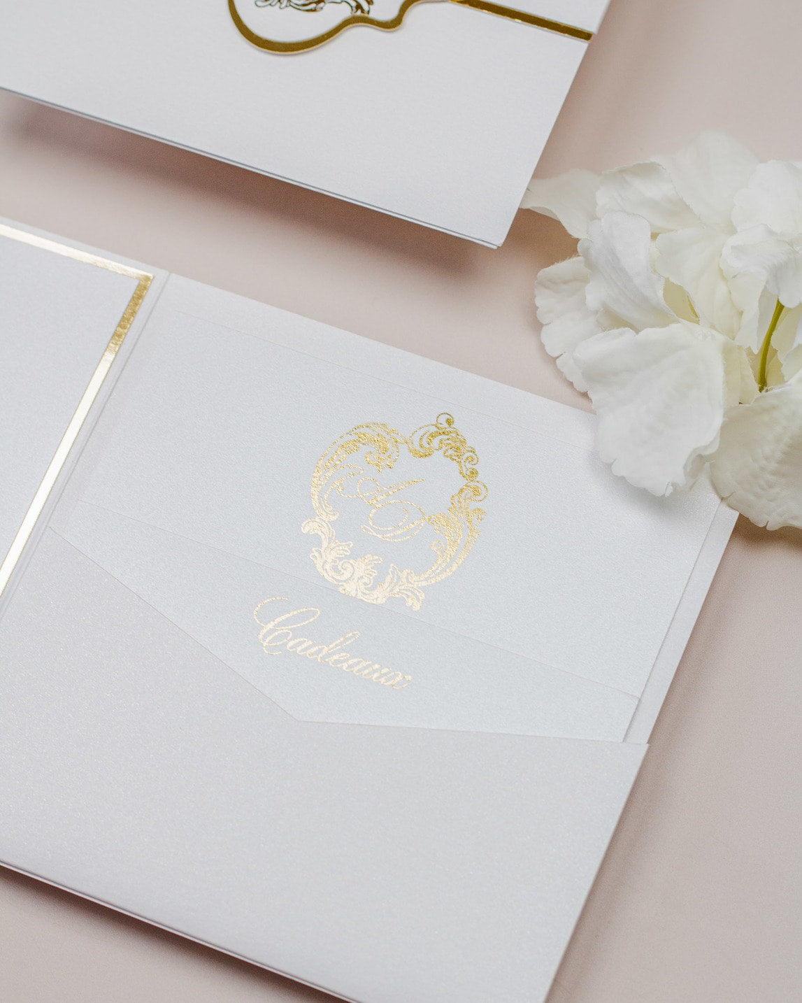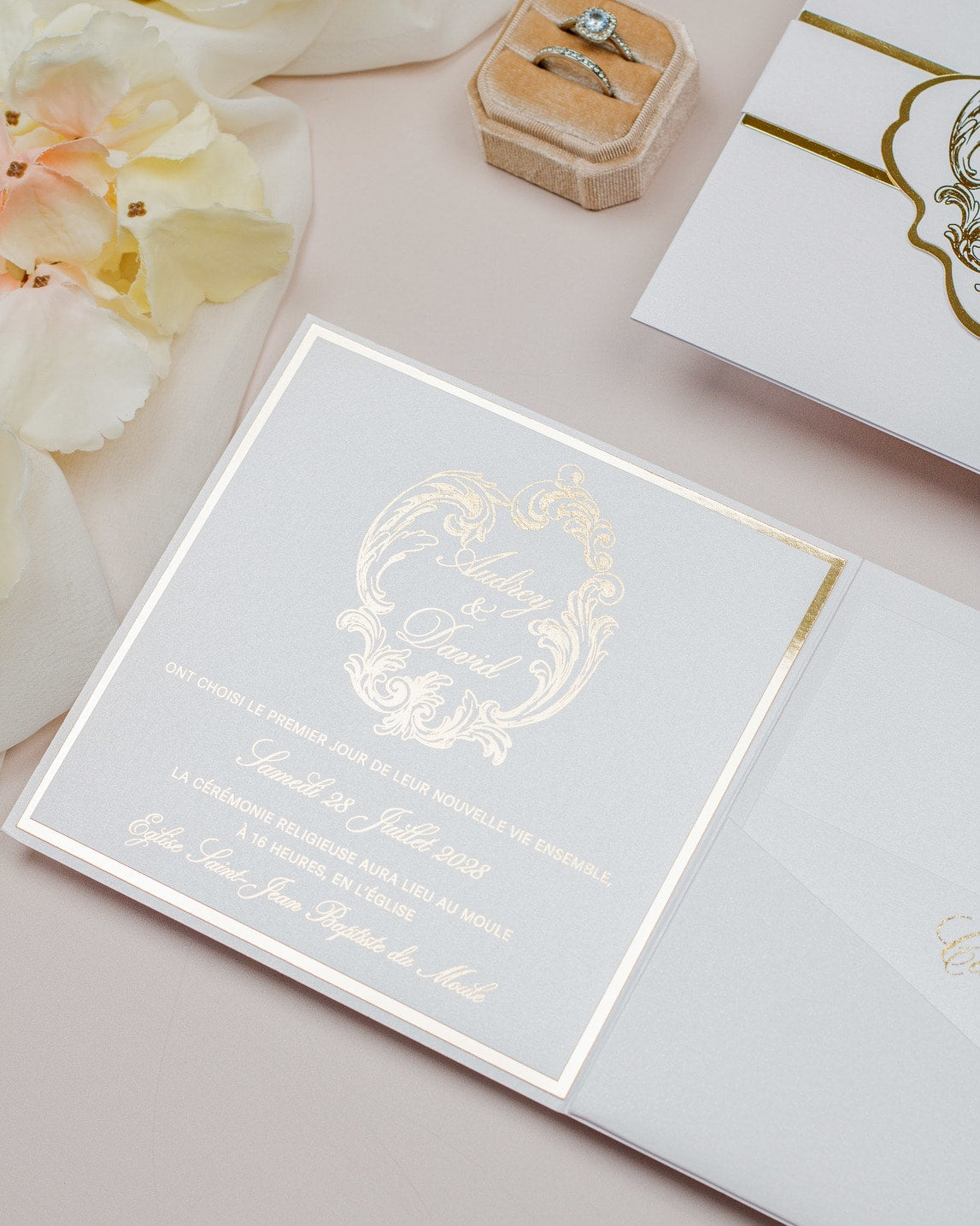 Luxueux faire-part de mariage sous forme de pochette.
