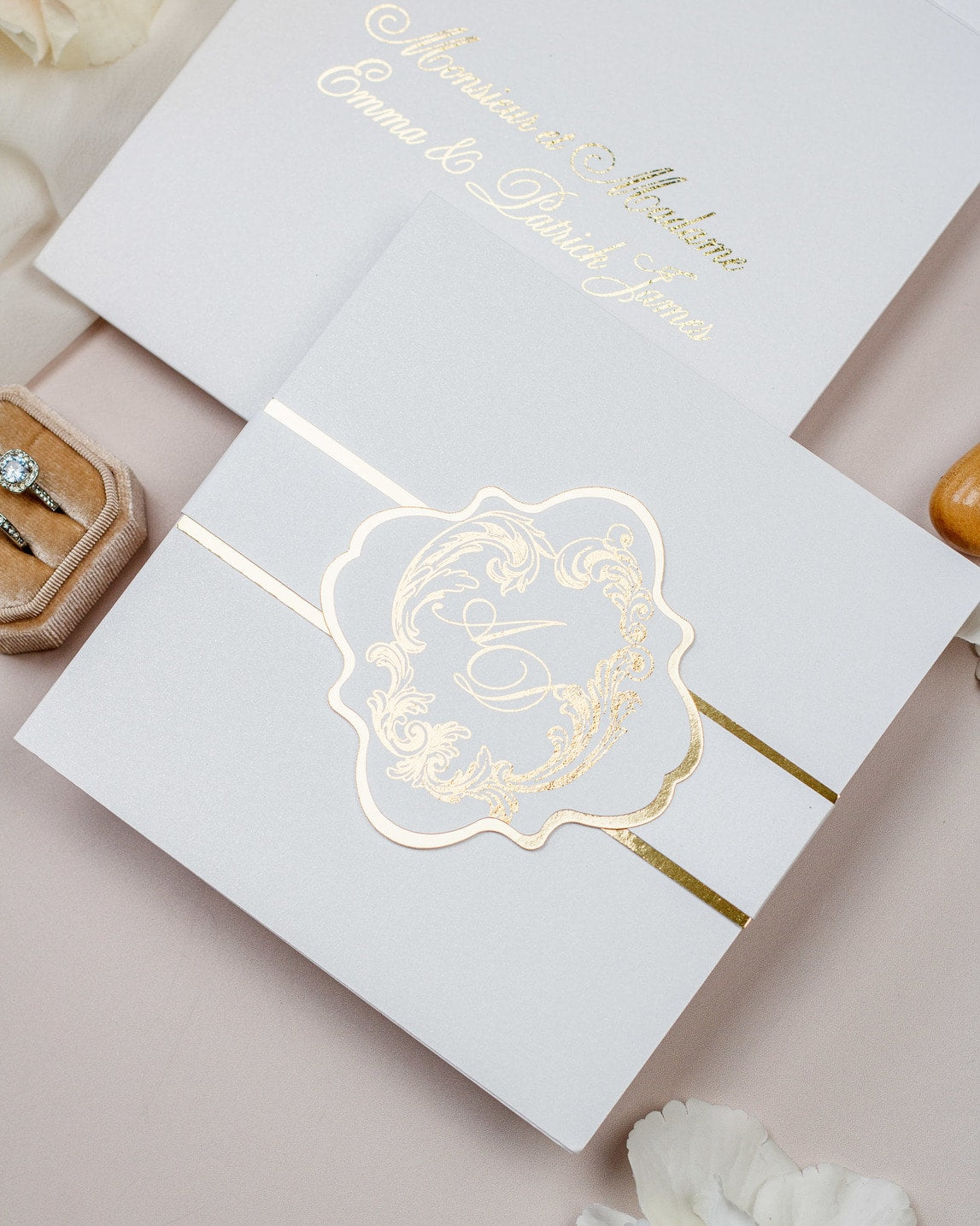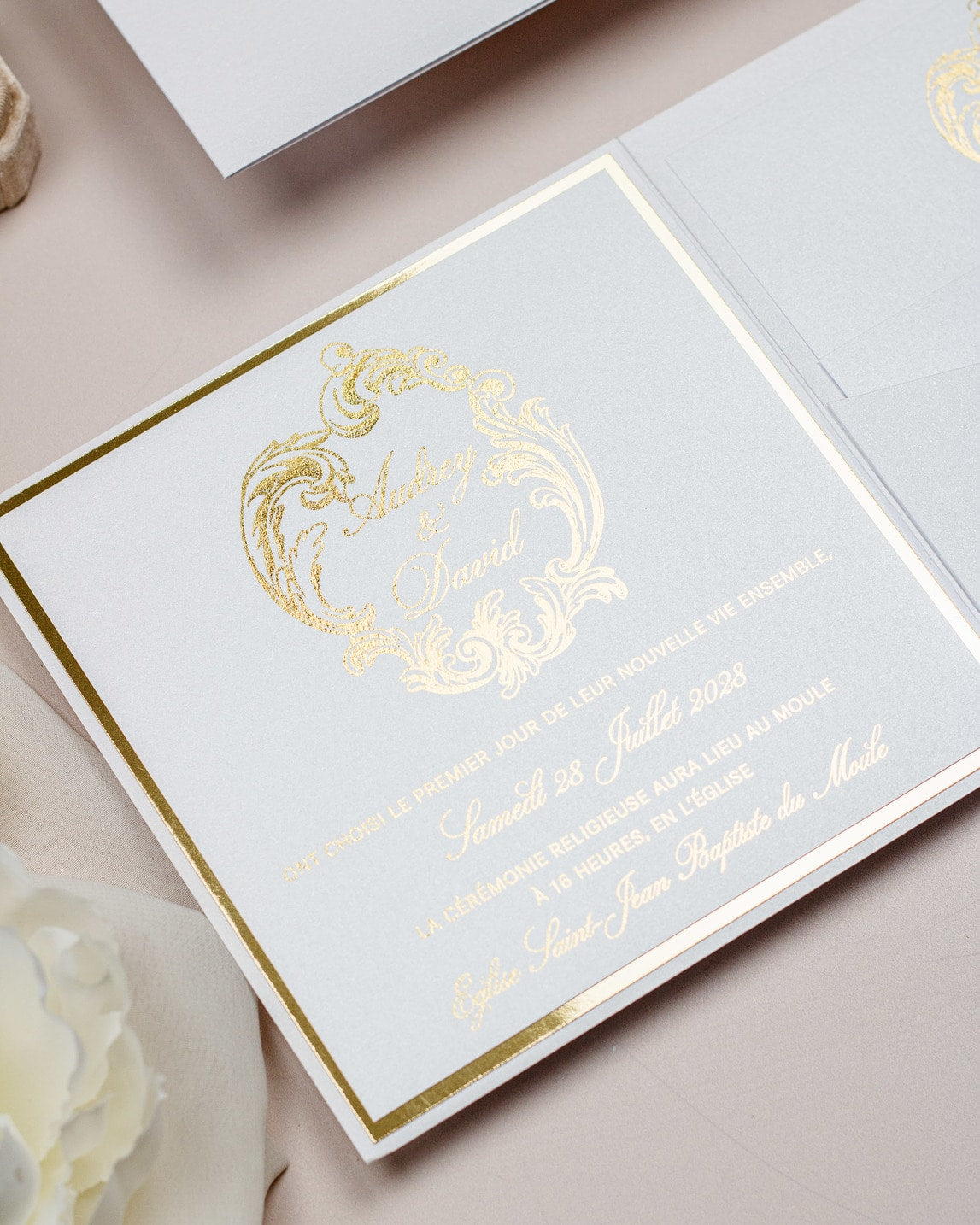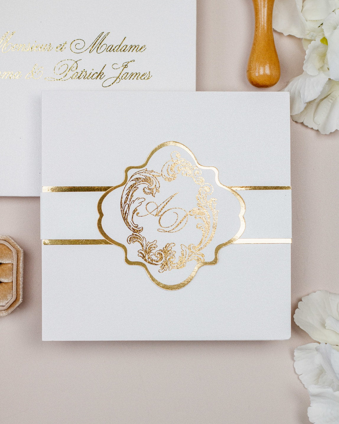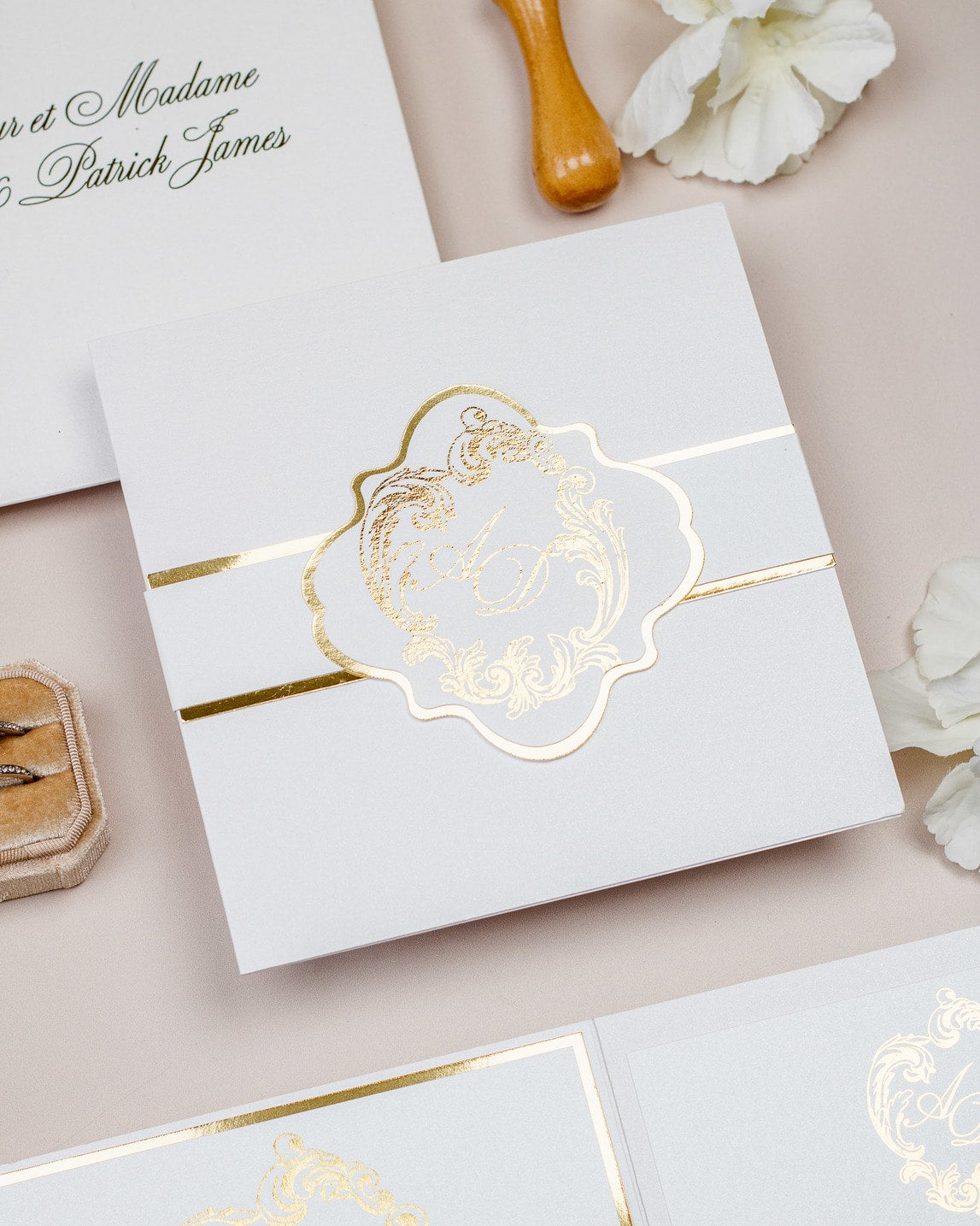 La ceinture de papier fermant le faire-part et la finition or sur le monogramme, ajouteront une touche de luxe à votre mariage.