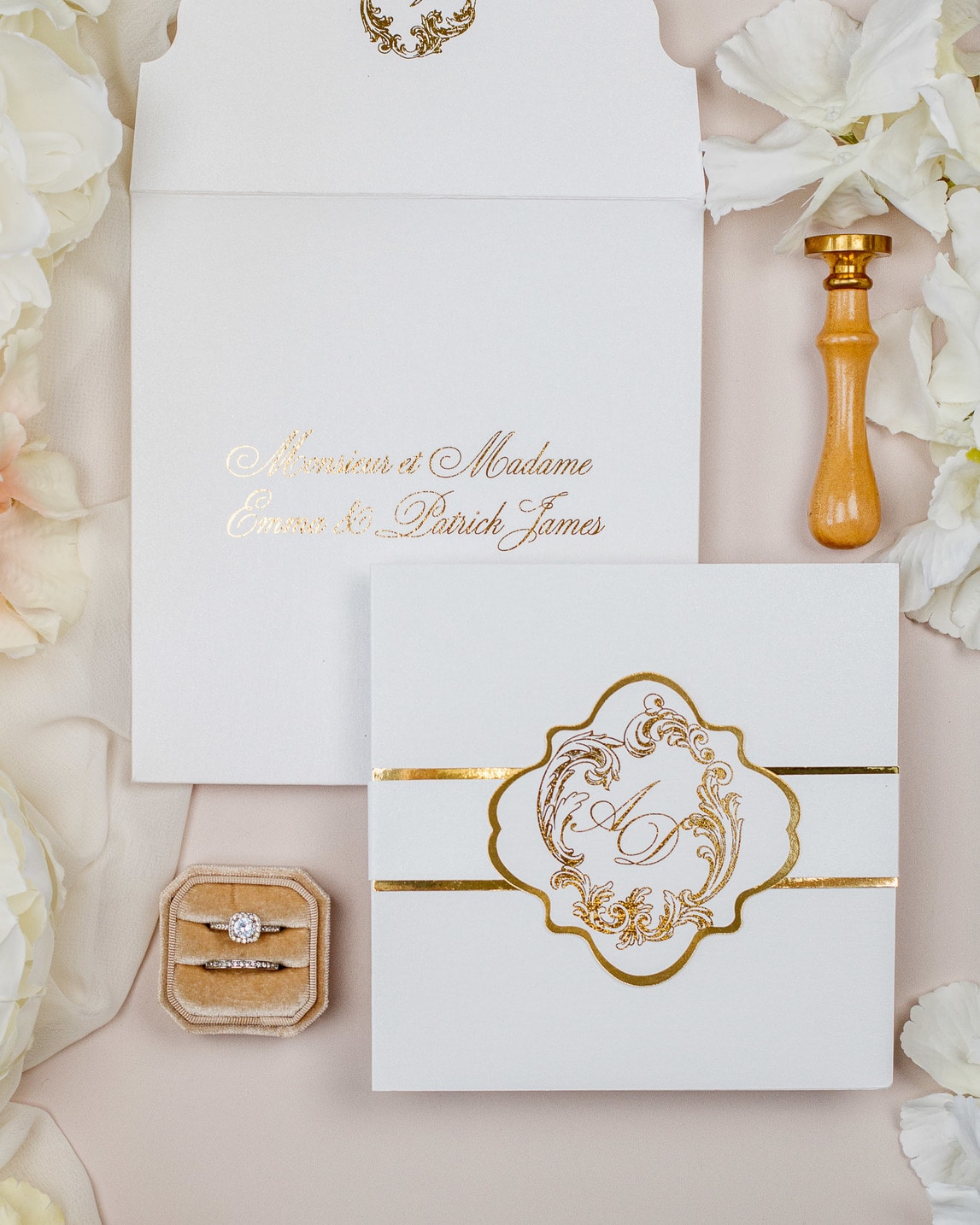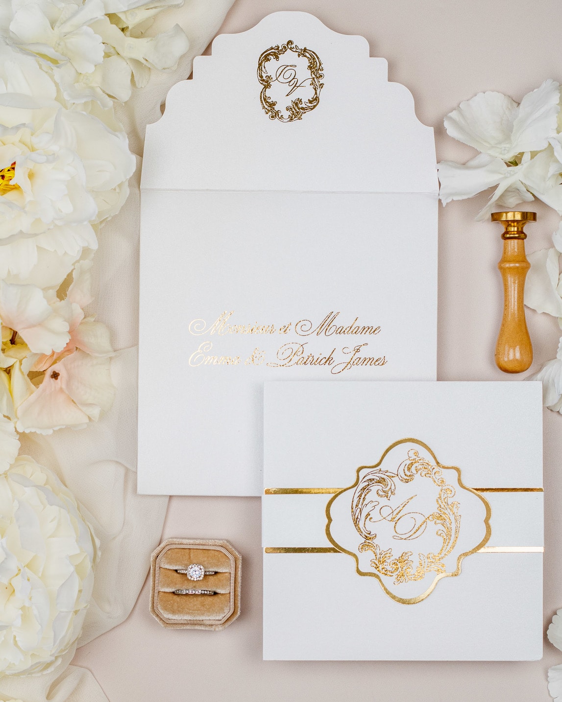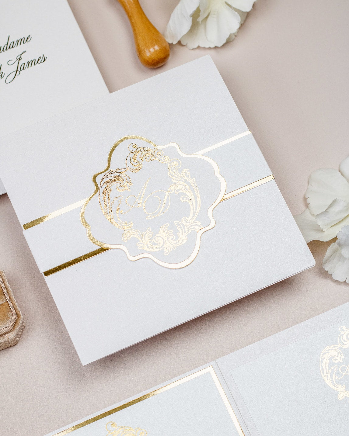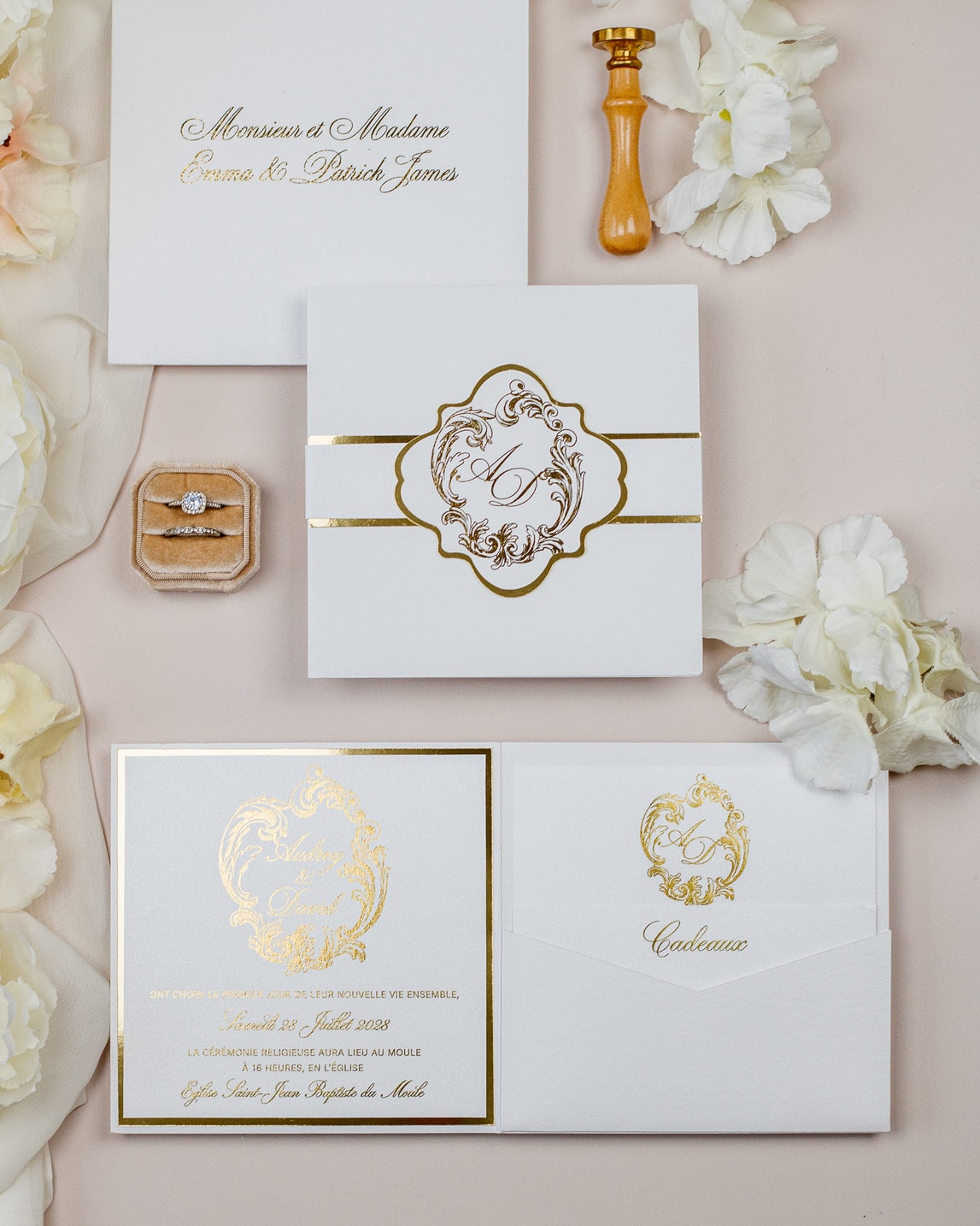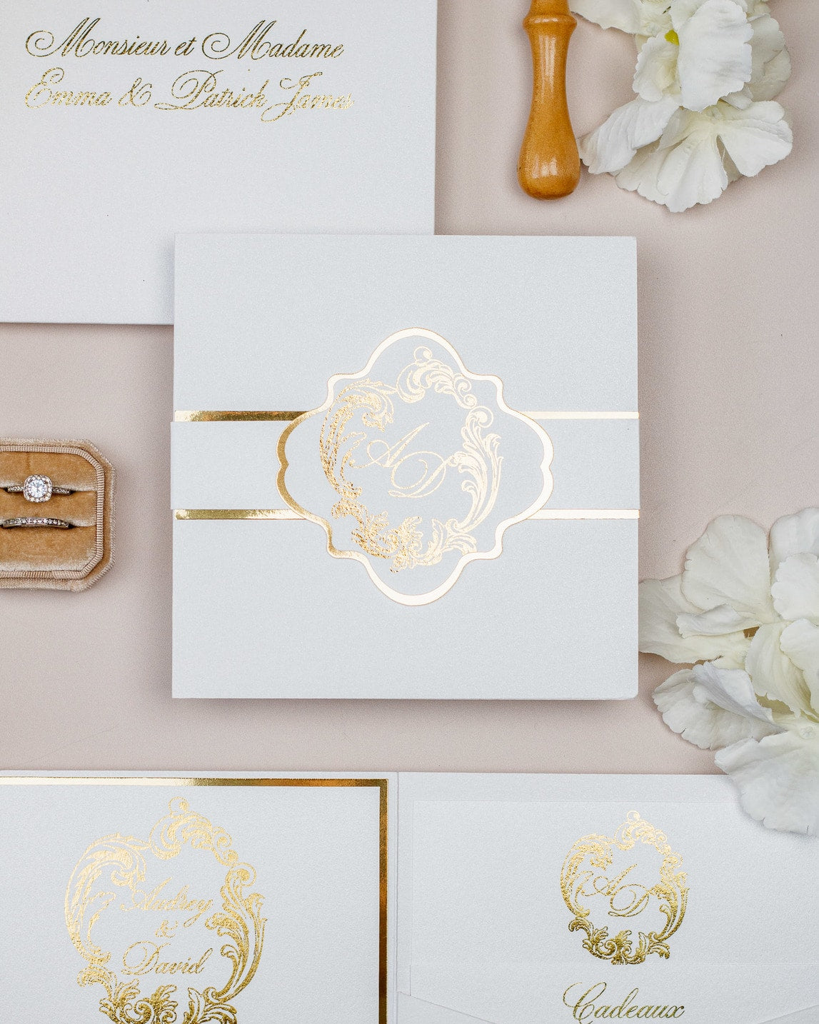 La ceinture de papier fermant le faire-part et la finition or sur le monogramme, ajouteront une touche de luxe à votre mariage.