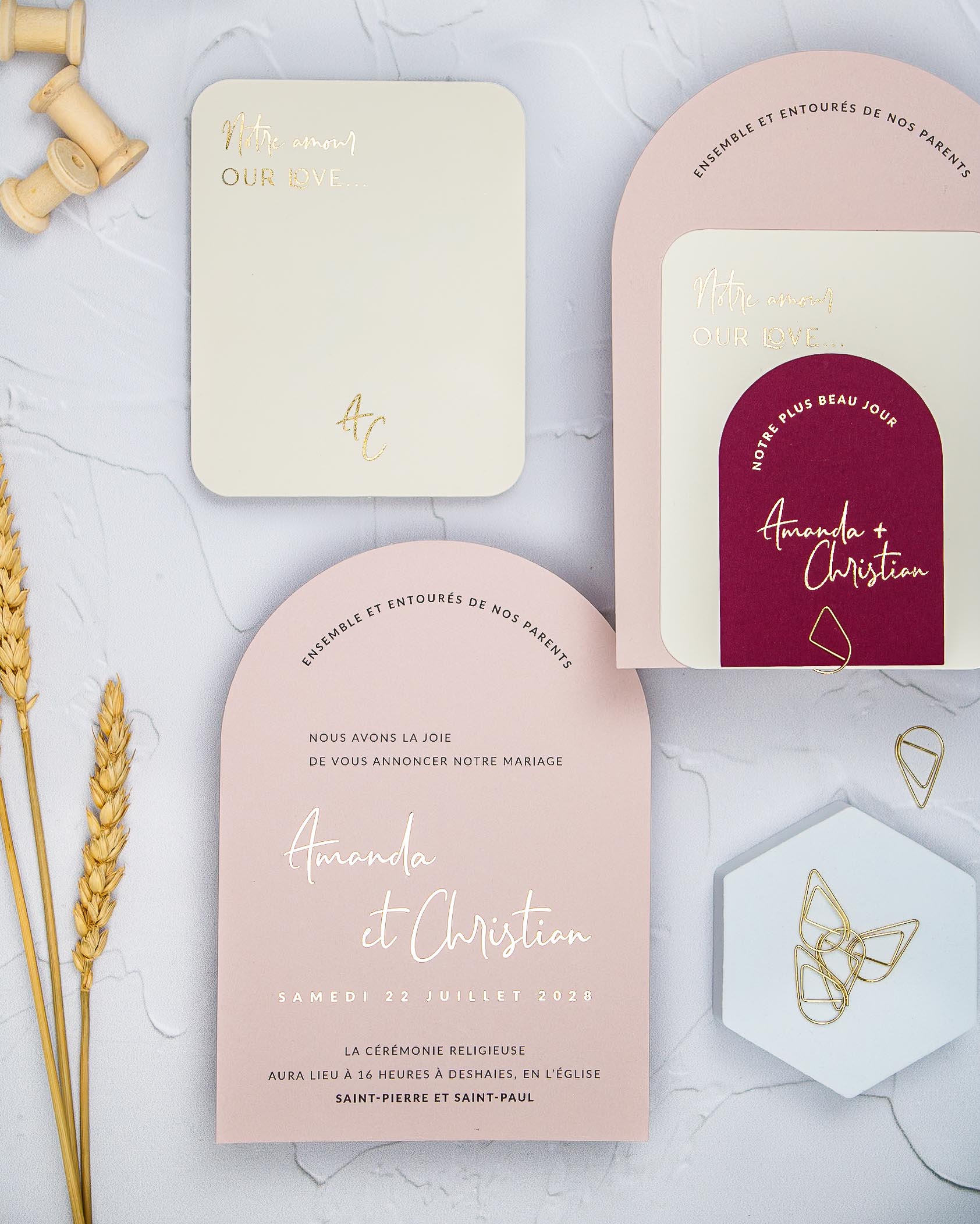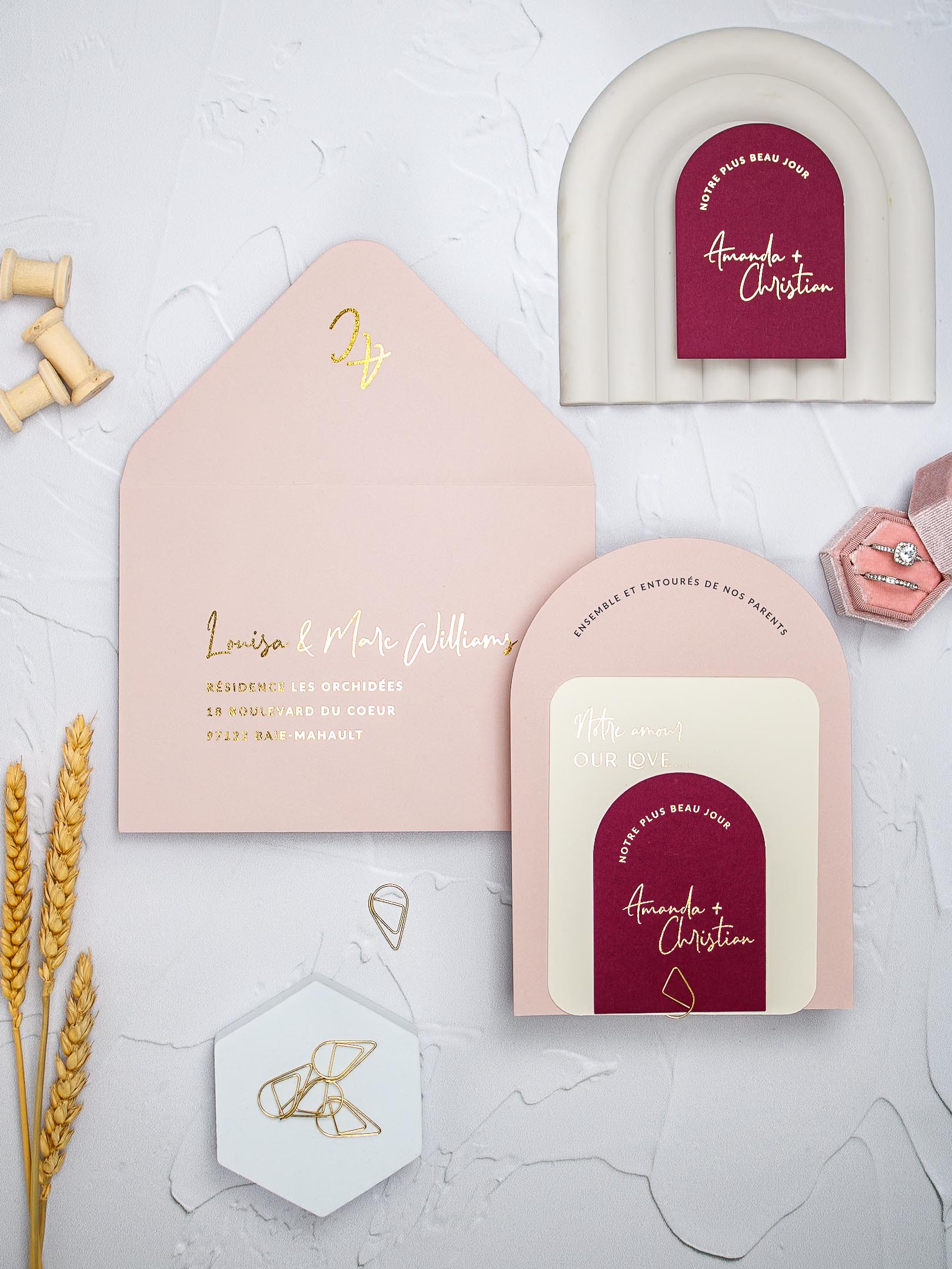 Ce faire-part de mariage à la forme graphique, surprendra vos invités avec son format original.