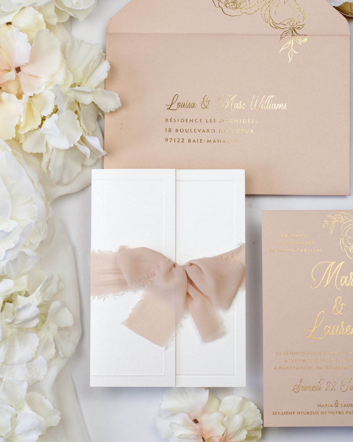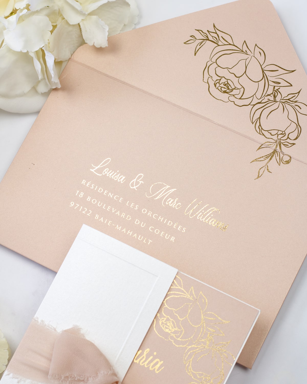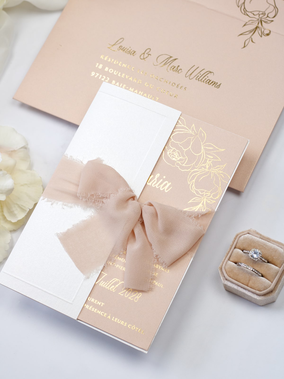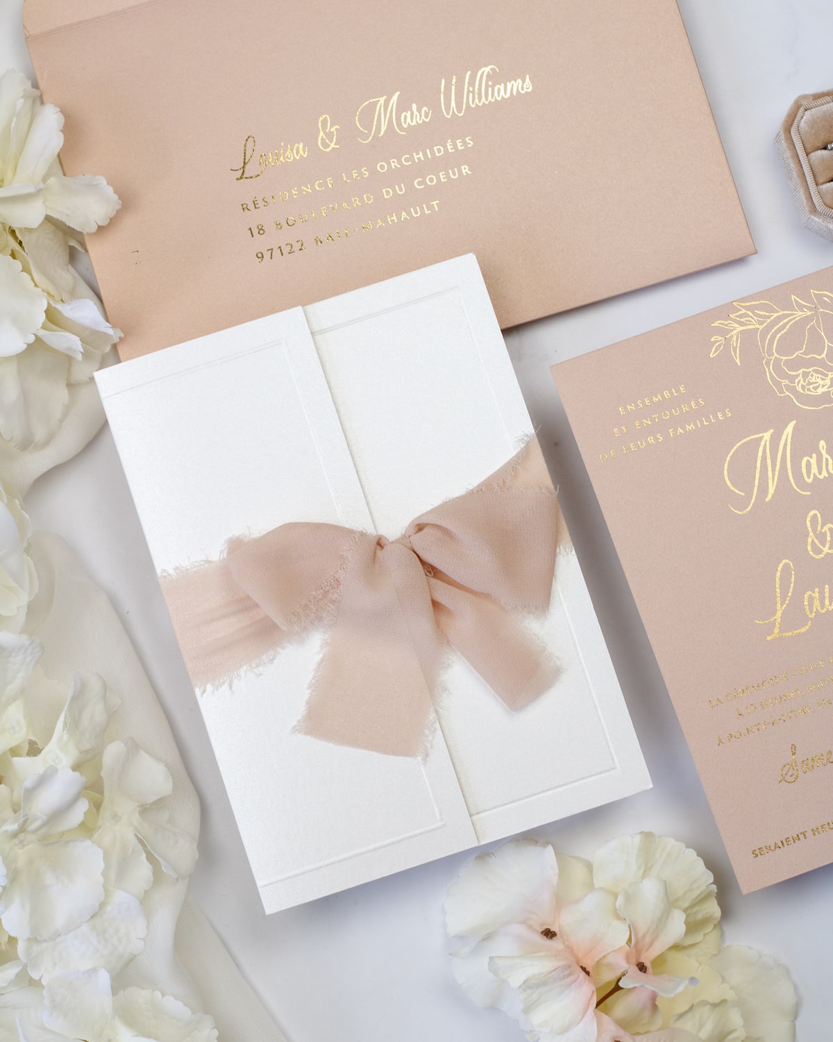 Elégant faire-part de mariage, sublimé par une finition or et enveloppé dans une pochette au toucher soyeux.