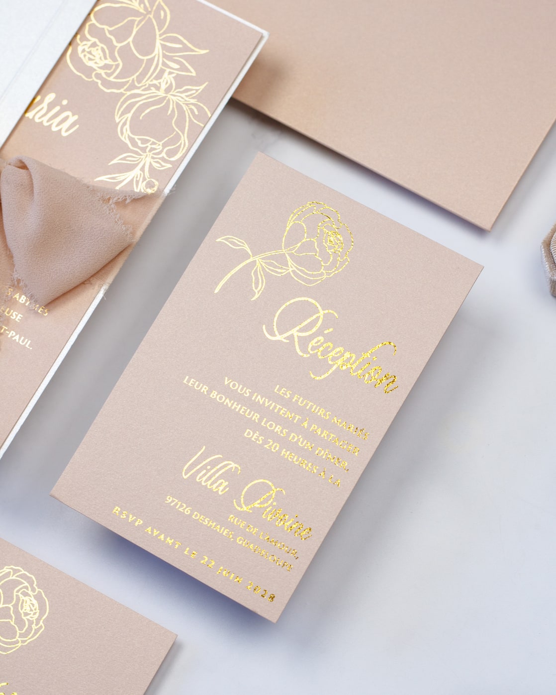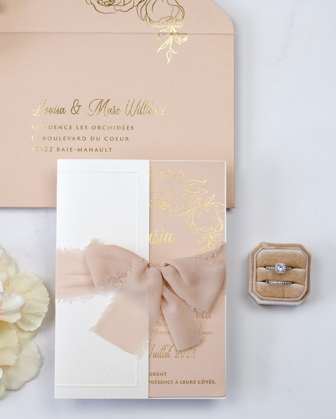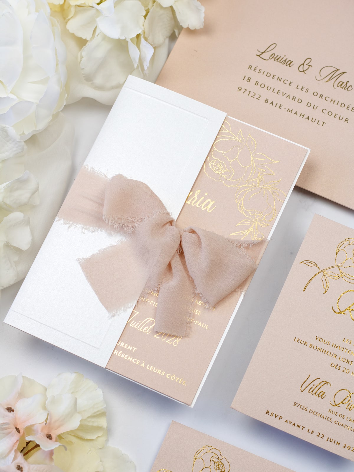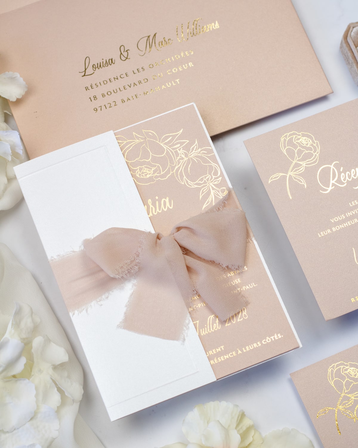 Elégant faire-part de mariage, sublimé par une finition or et enveloppé dans une pochette au toucher soyeux.