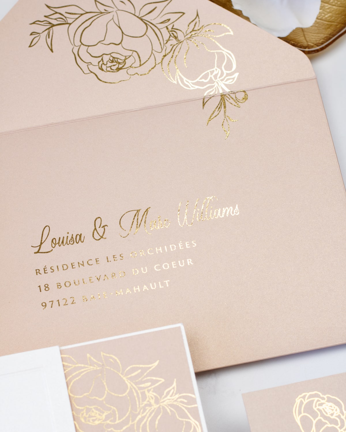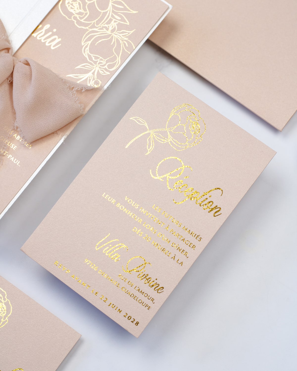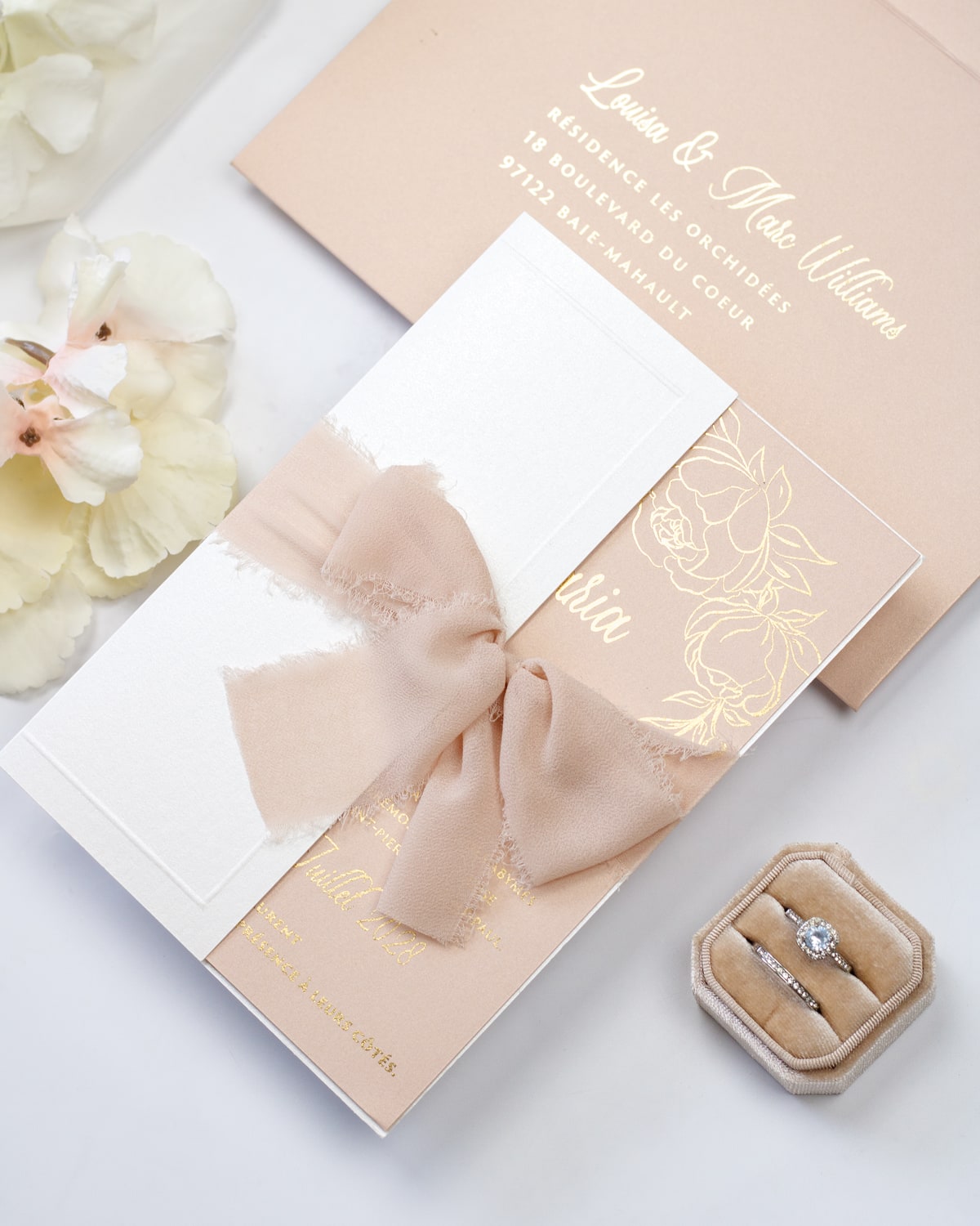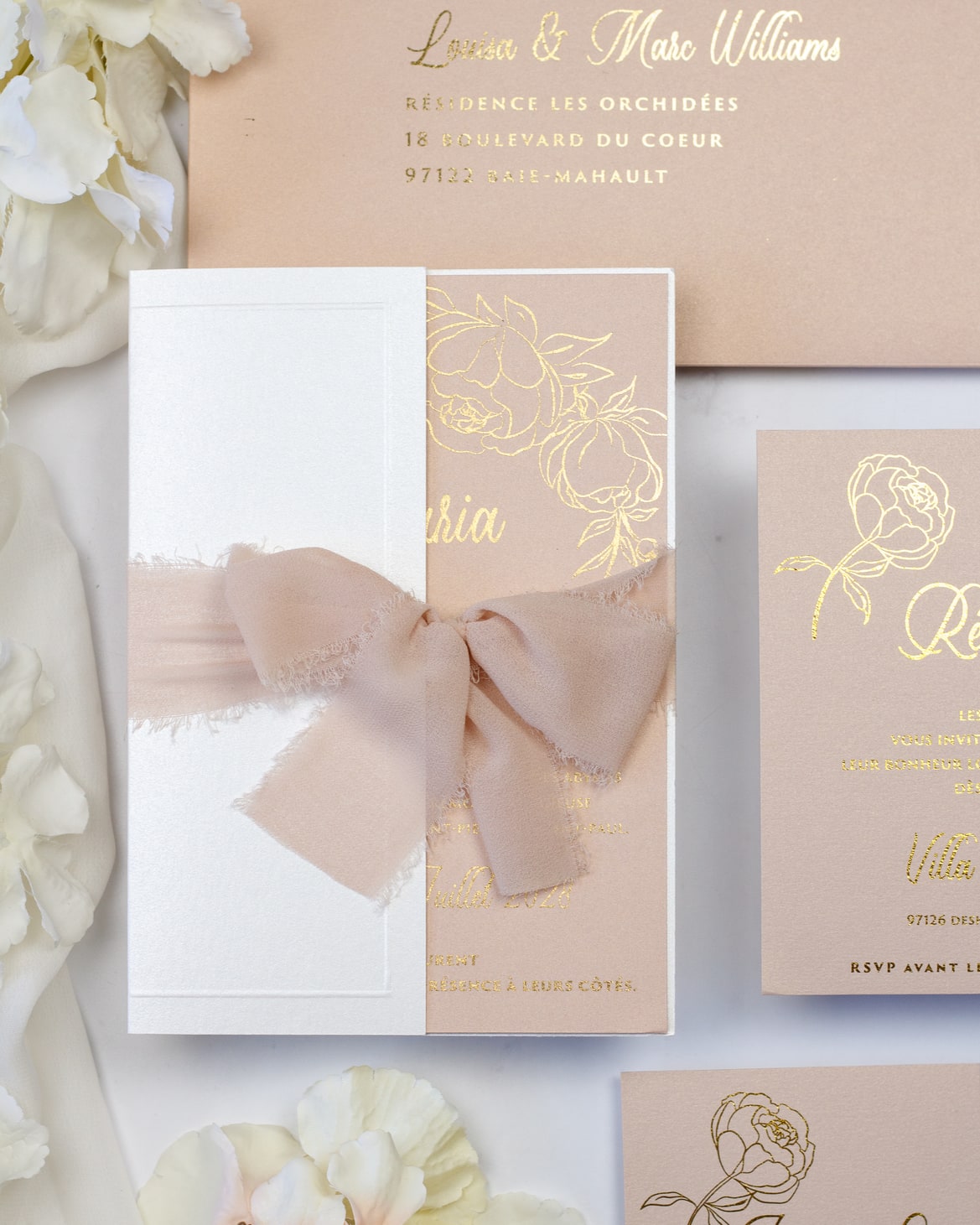 Elégant faire-part de mariage, sublimé par une finition or et enveloppé dans une pochette au toucher soyeux.