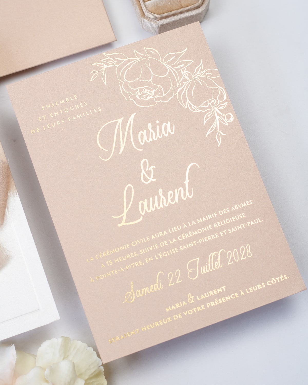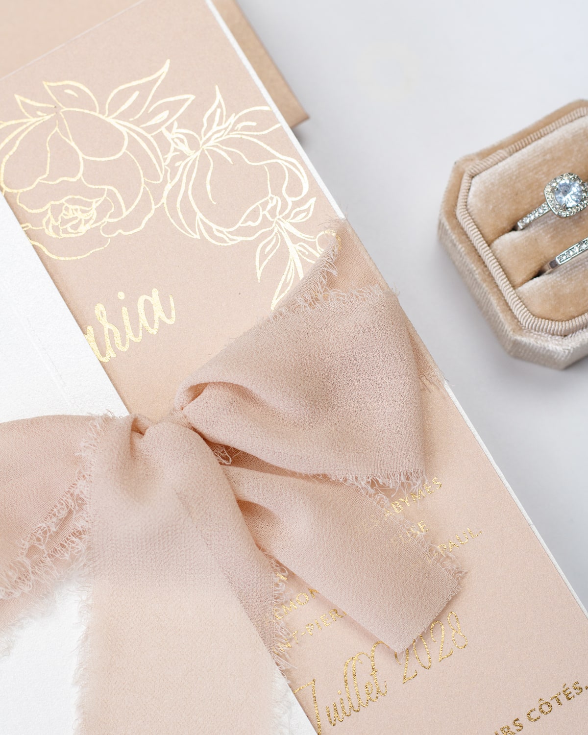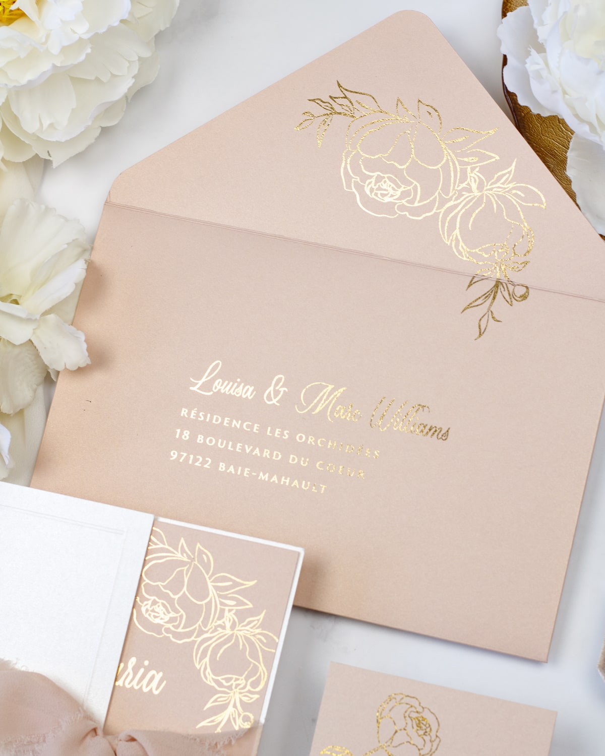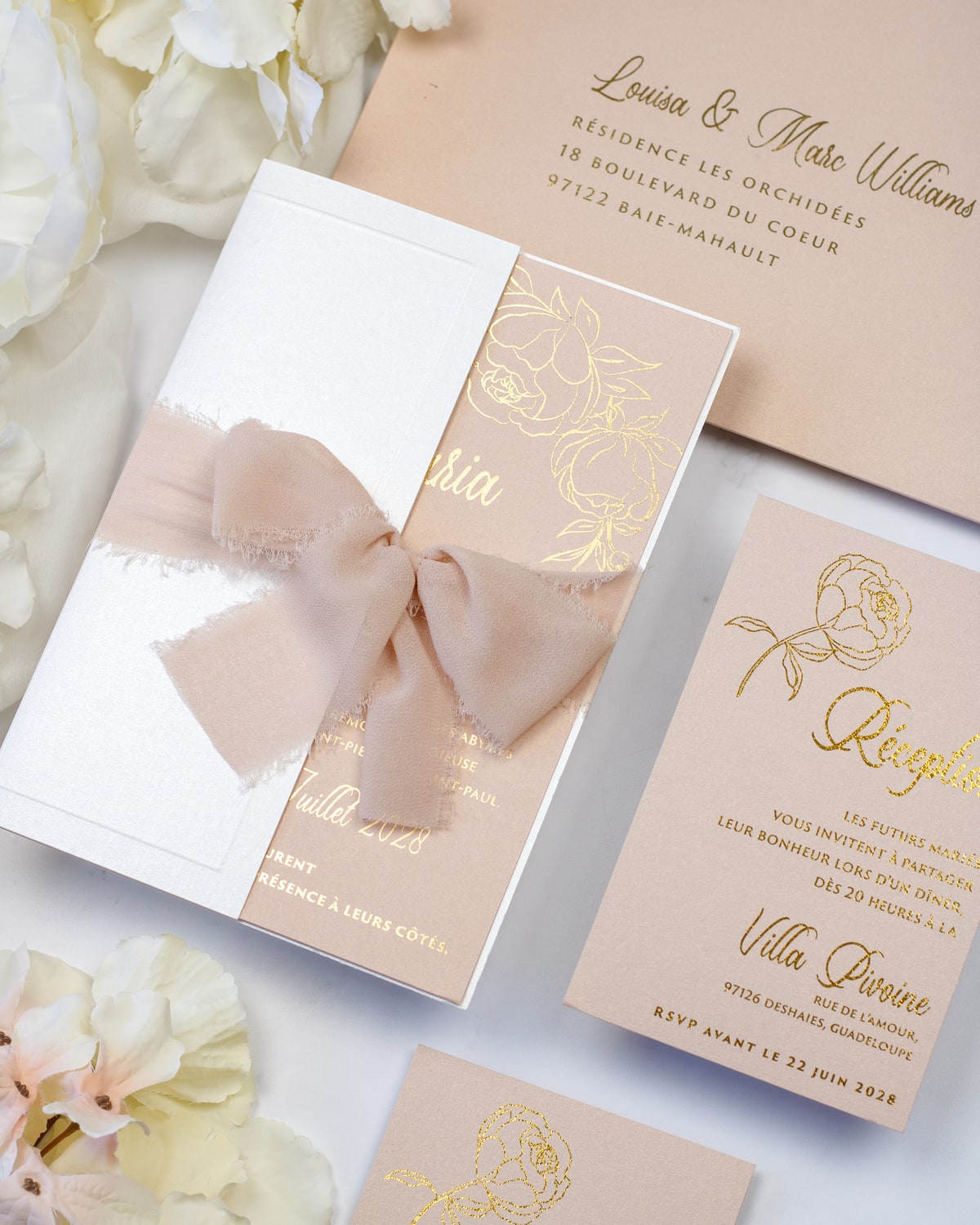 Elégant faire-part de mariage, sublimé par une finition or et enveloppé dans une pochette au toucher soyeux.