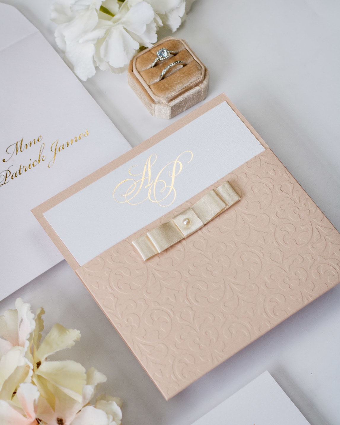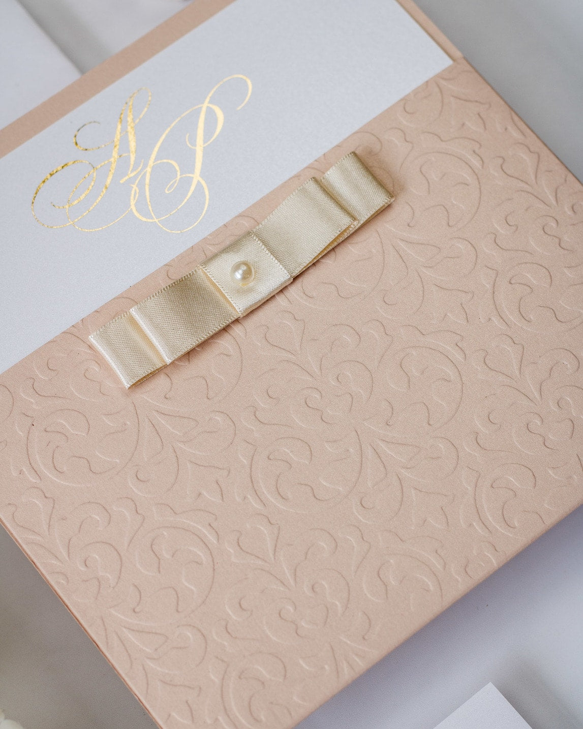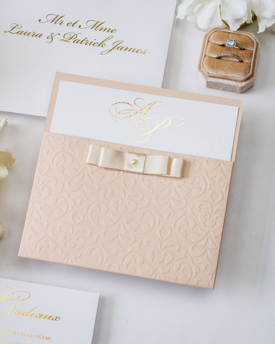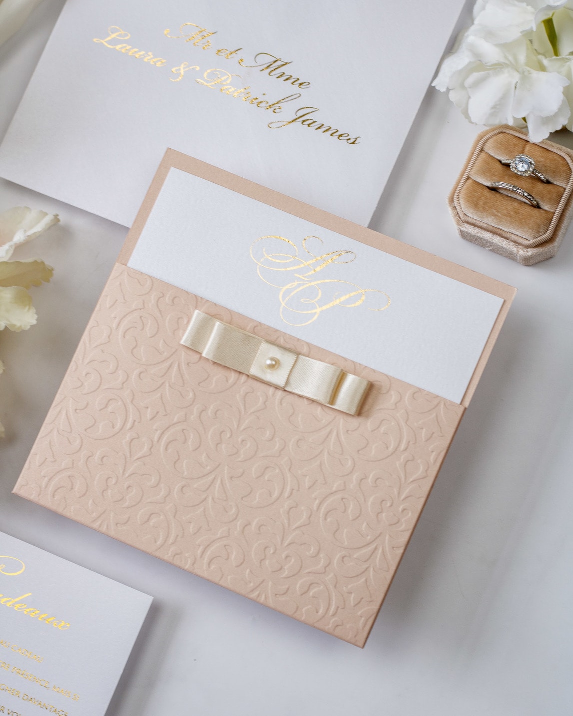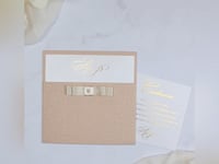 Une touche d'élégance avec ce faire-part finement embossé sur l'avant, orné d'un beau ruban "Dior Bow" et d'une perle.