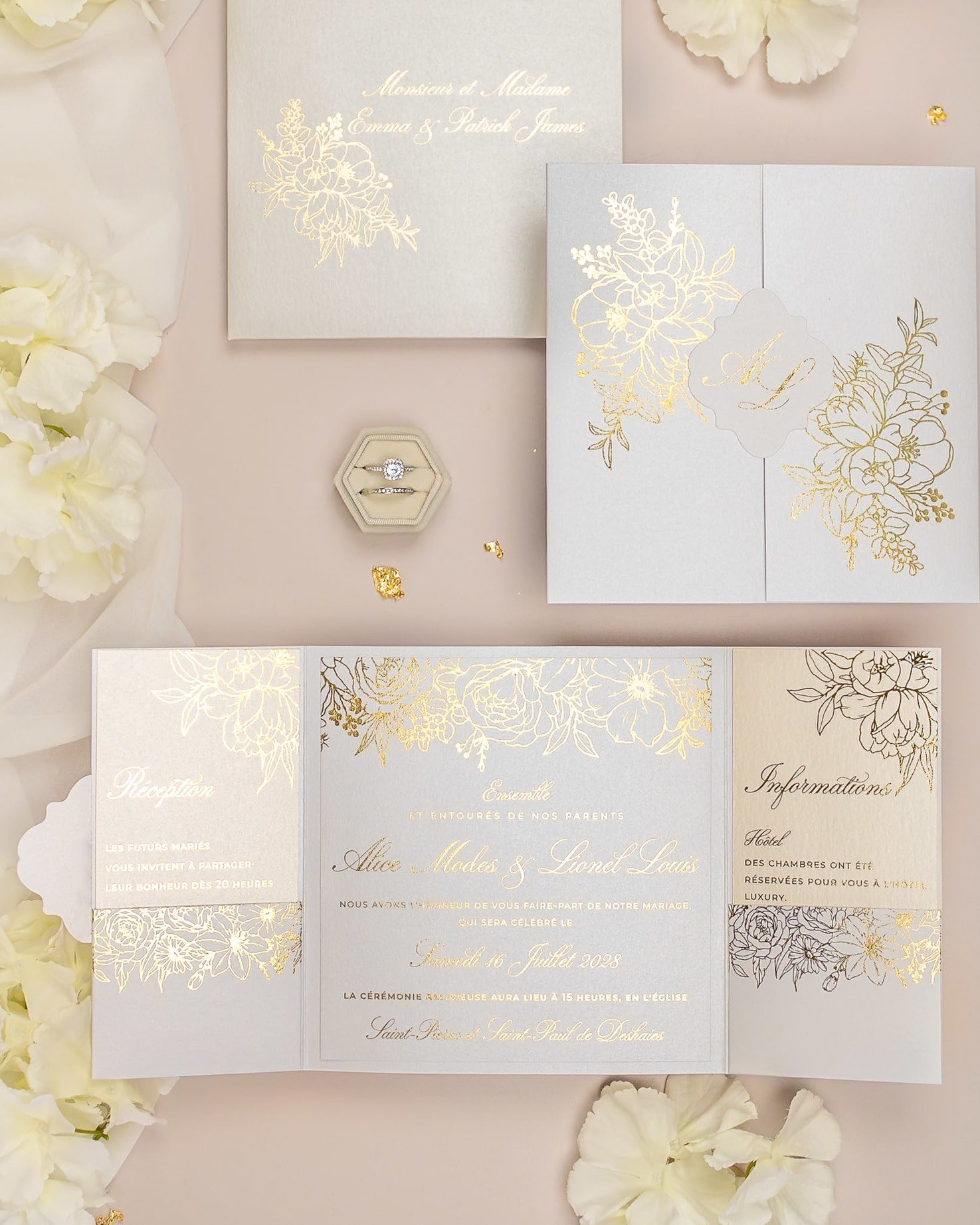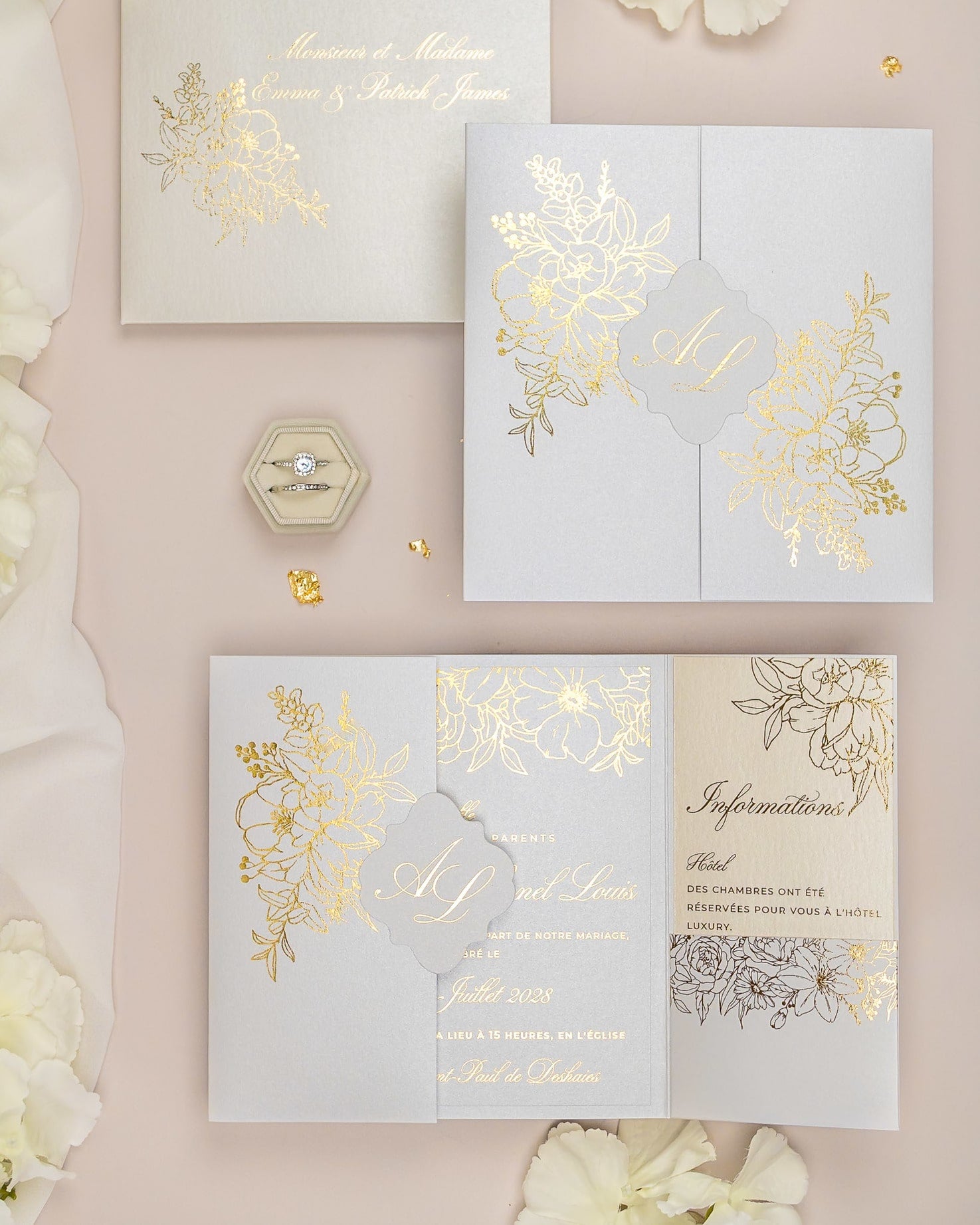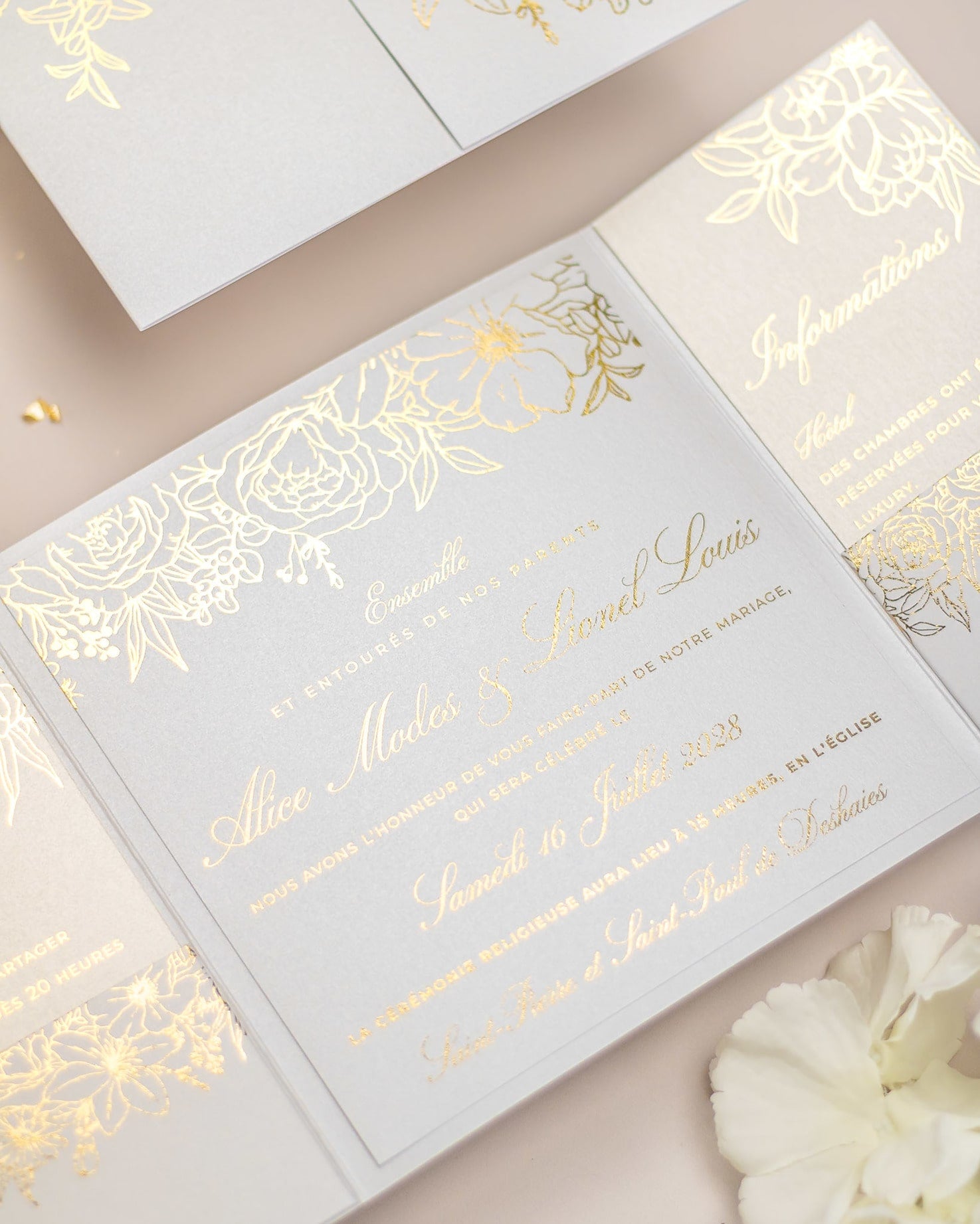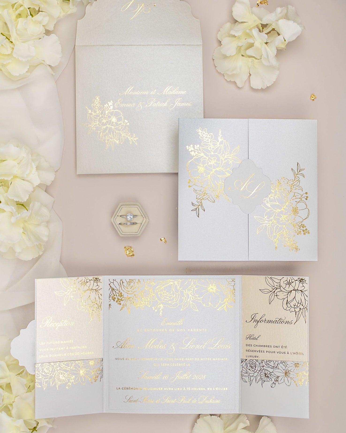 Magnifique faire-part de mariage chic et luxueux, sublimé par la finition dorure.