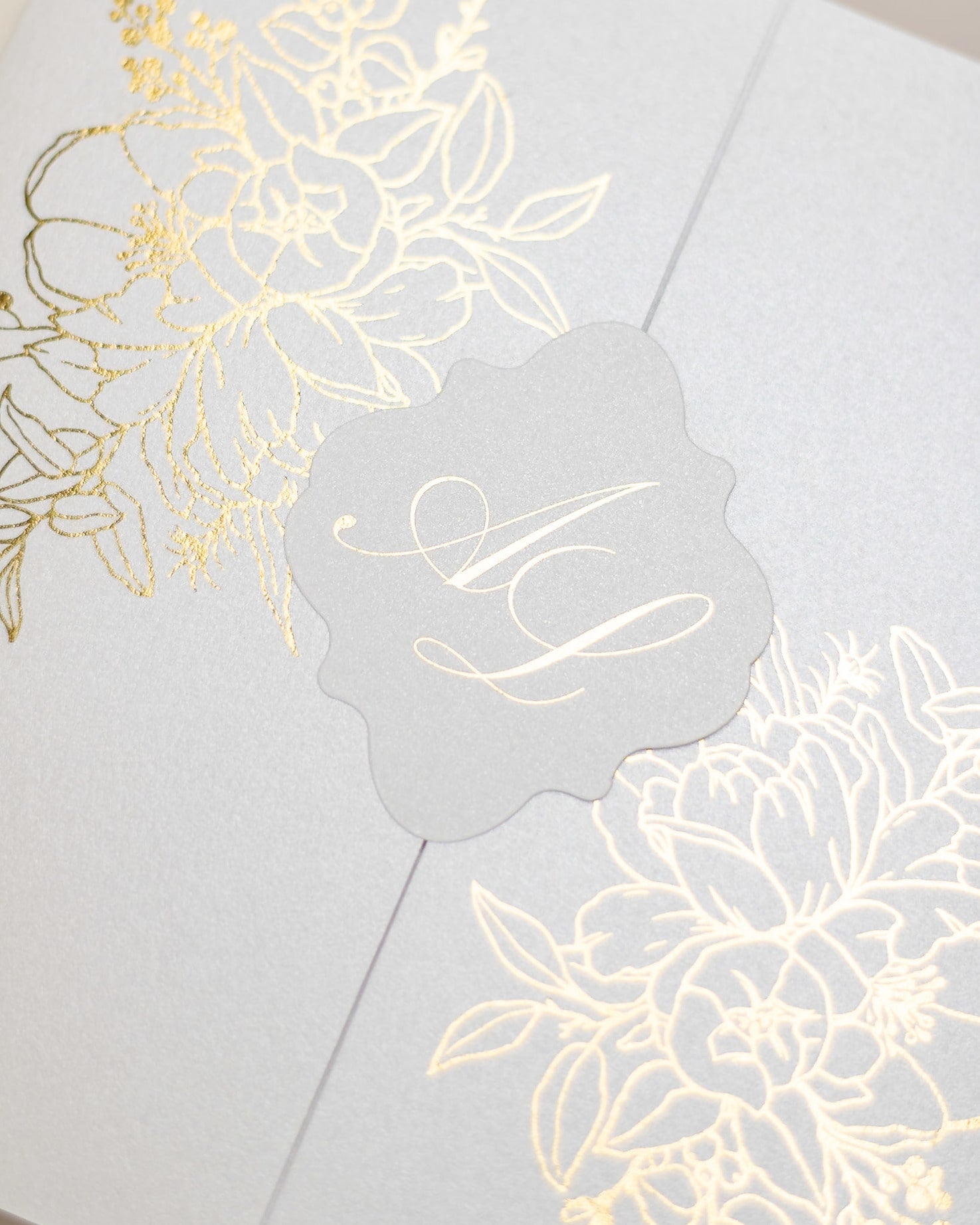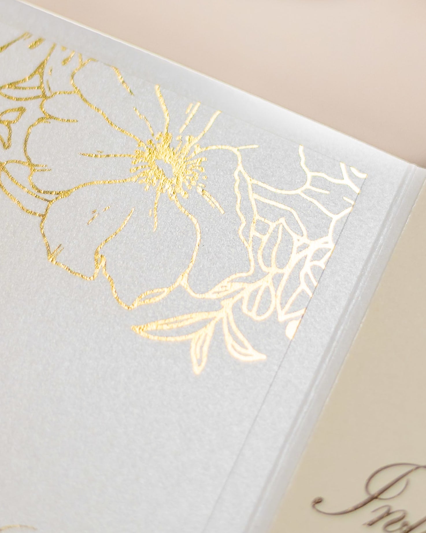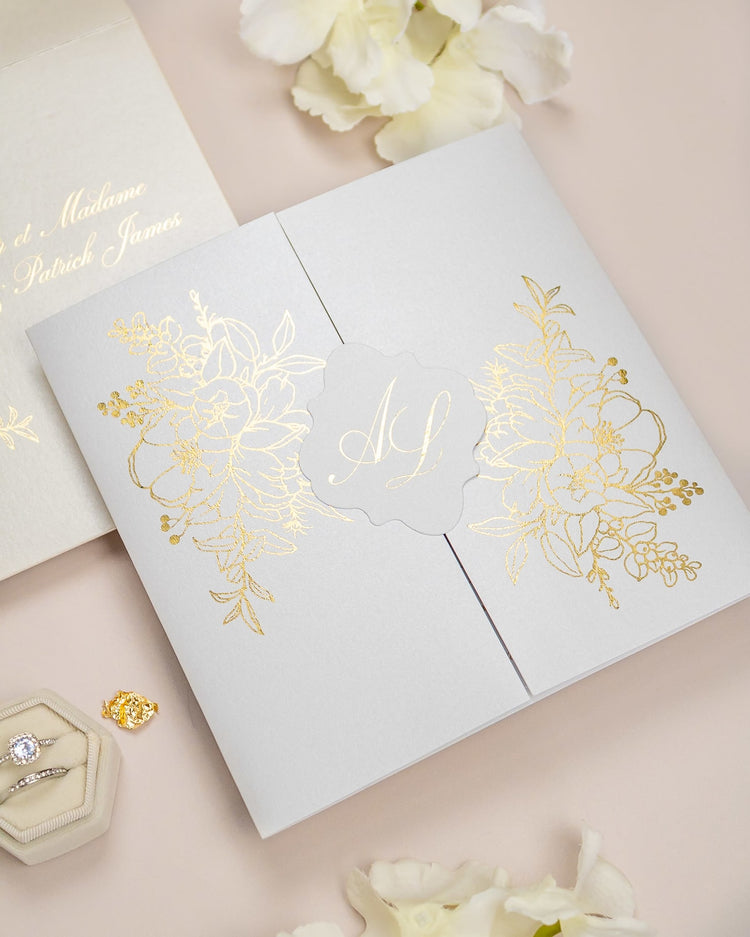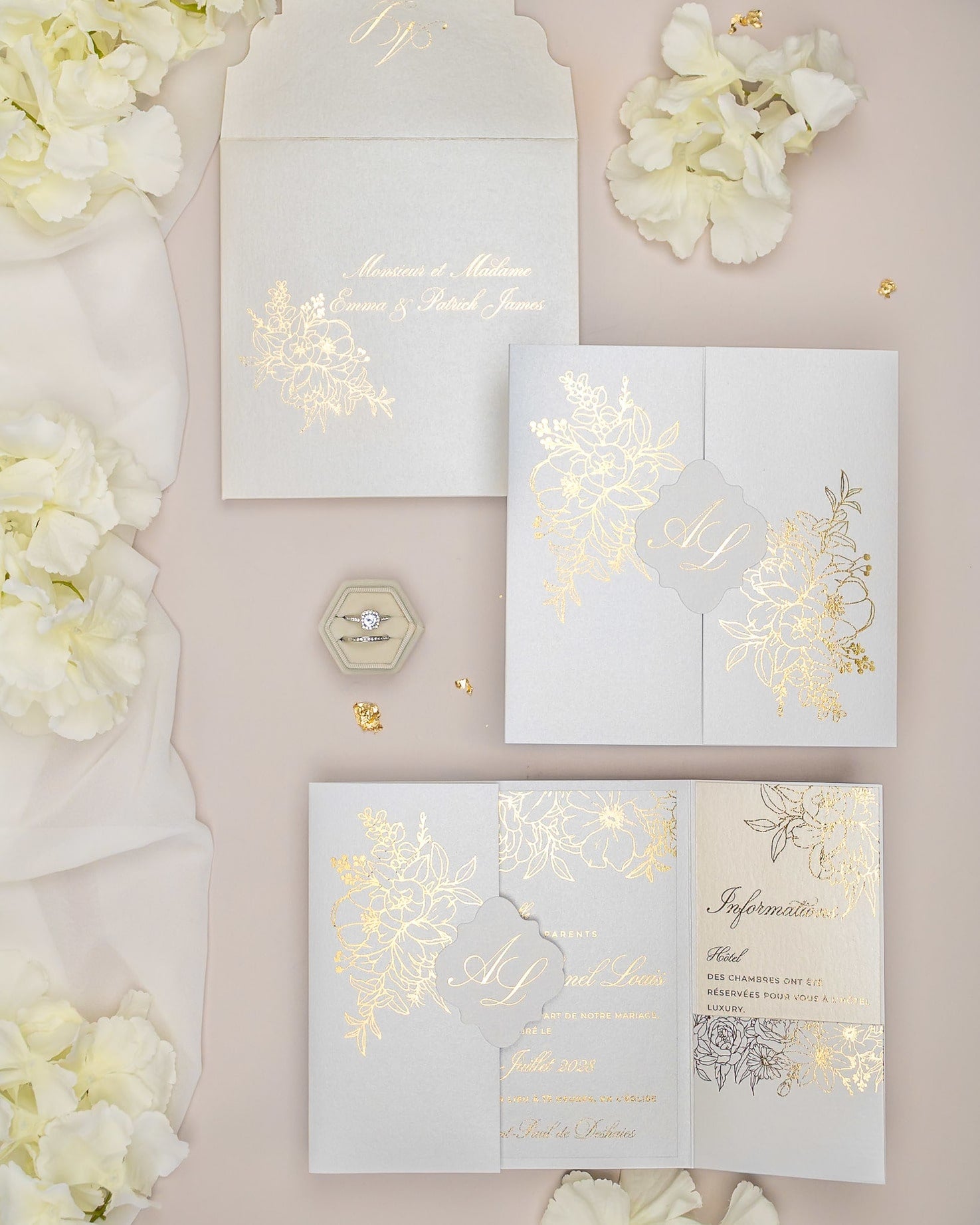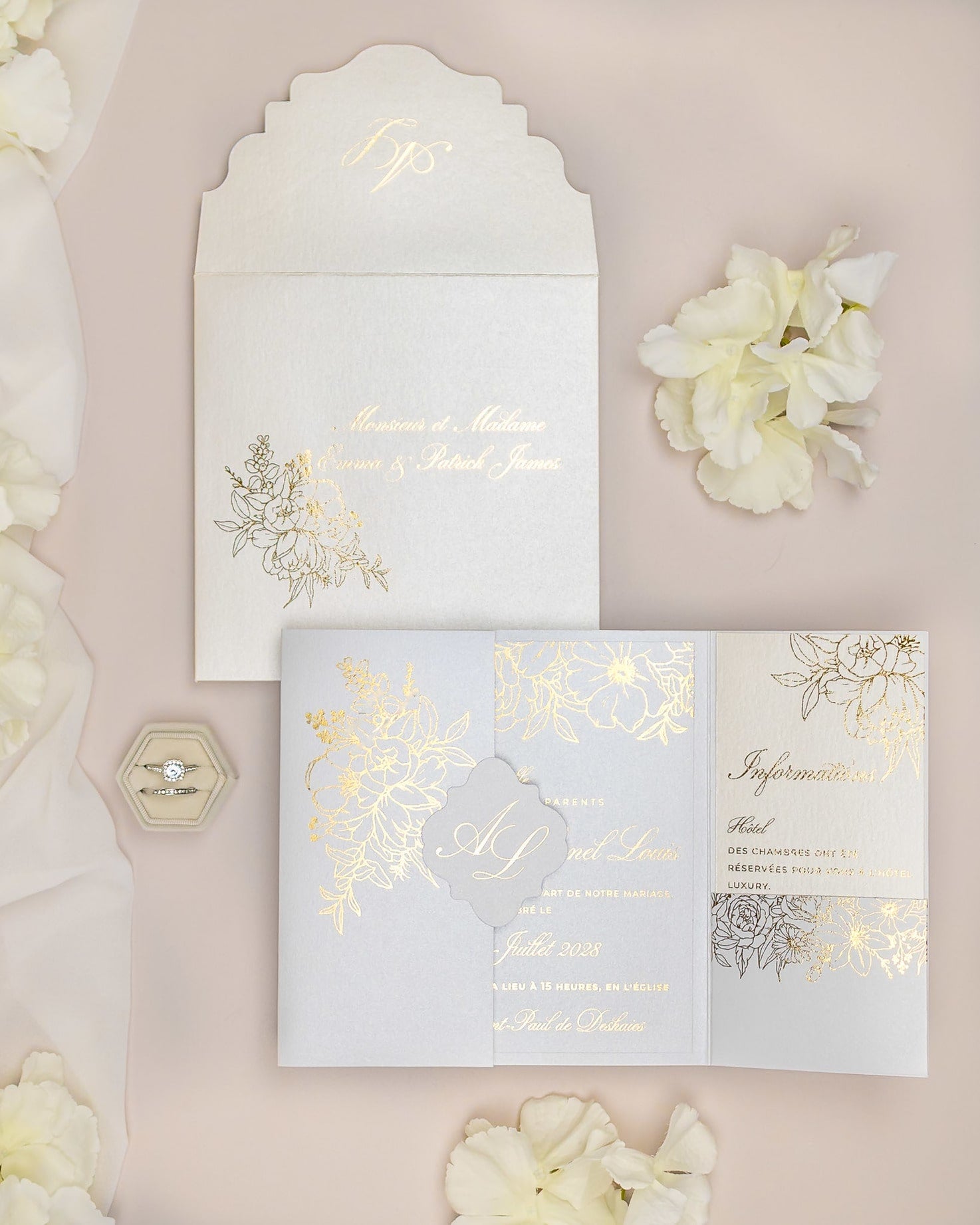 Magnifique faire-part de mariage chic et luxueux, sublimé par la finition dorure.