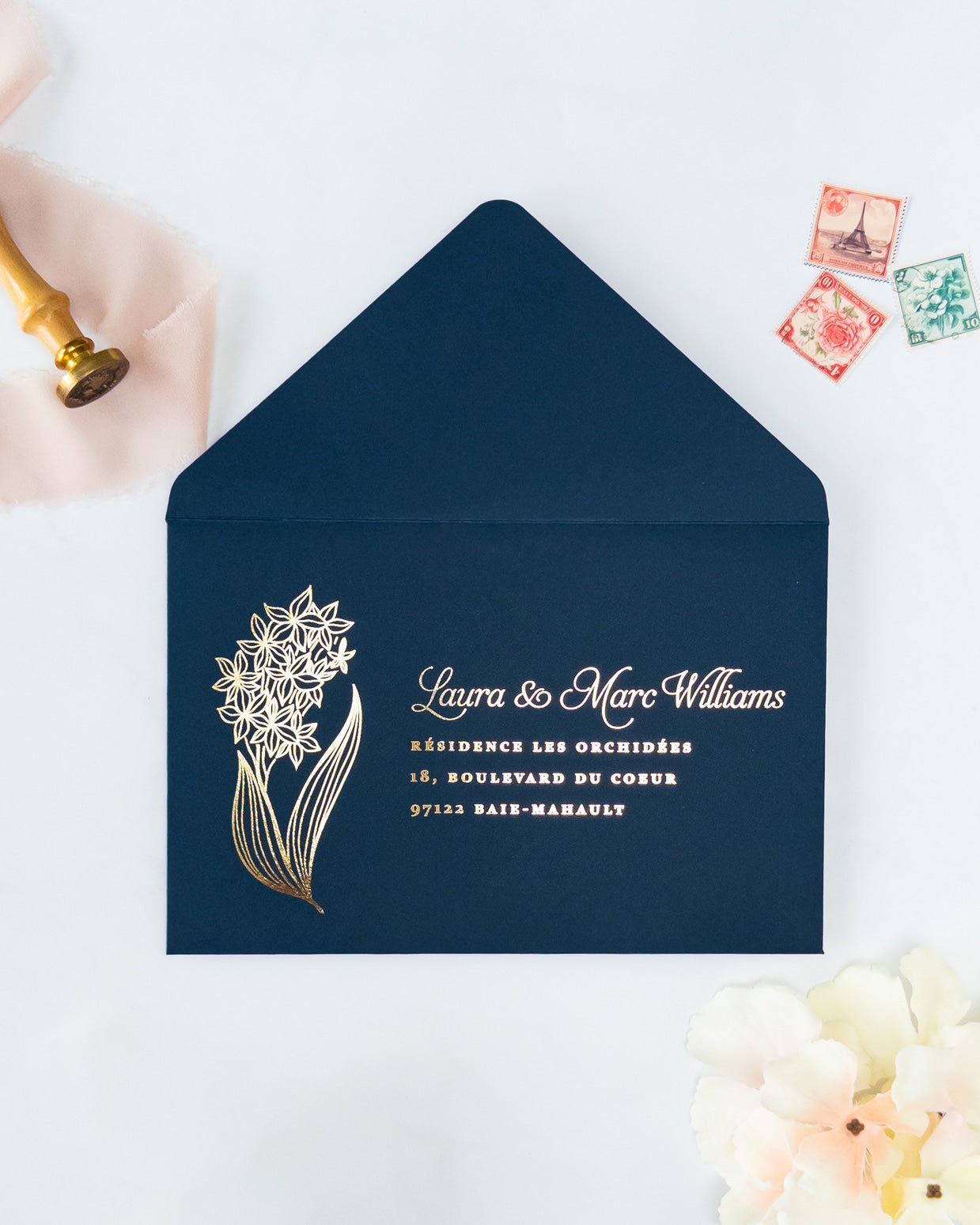 Nos enveloppes chics et élégantes, sont entièrement faites à la main avec amour et soin. Laissez-nous éblouir vos invités pour votre grand jour !