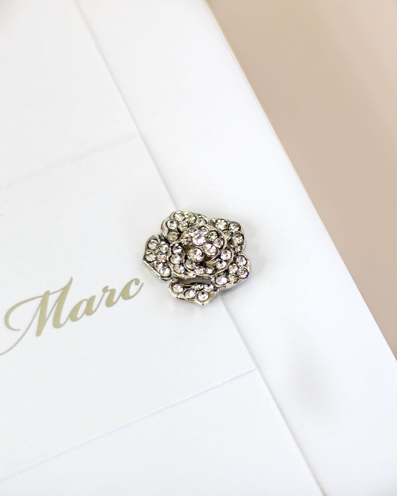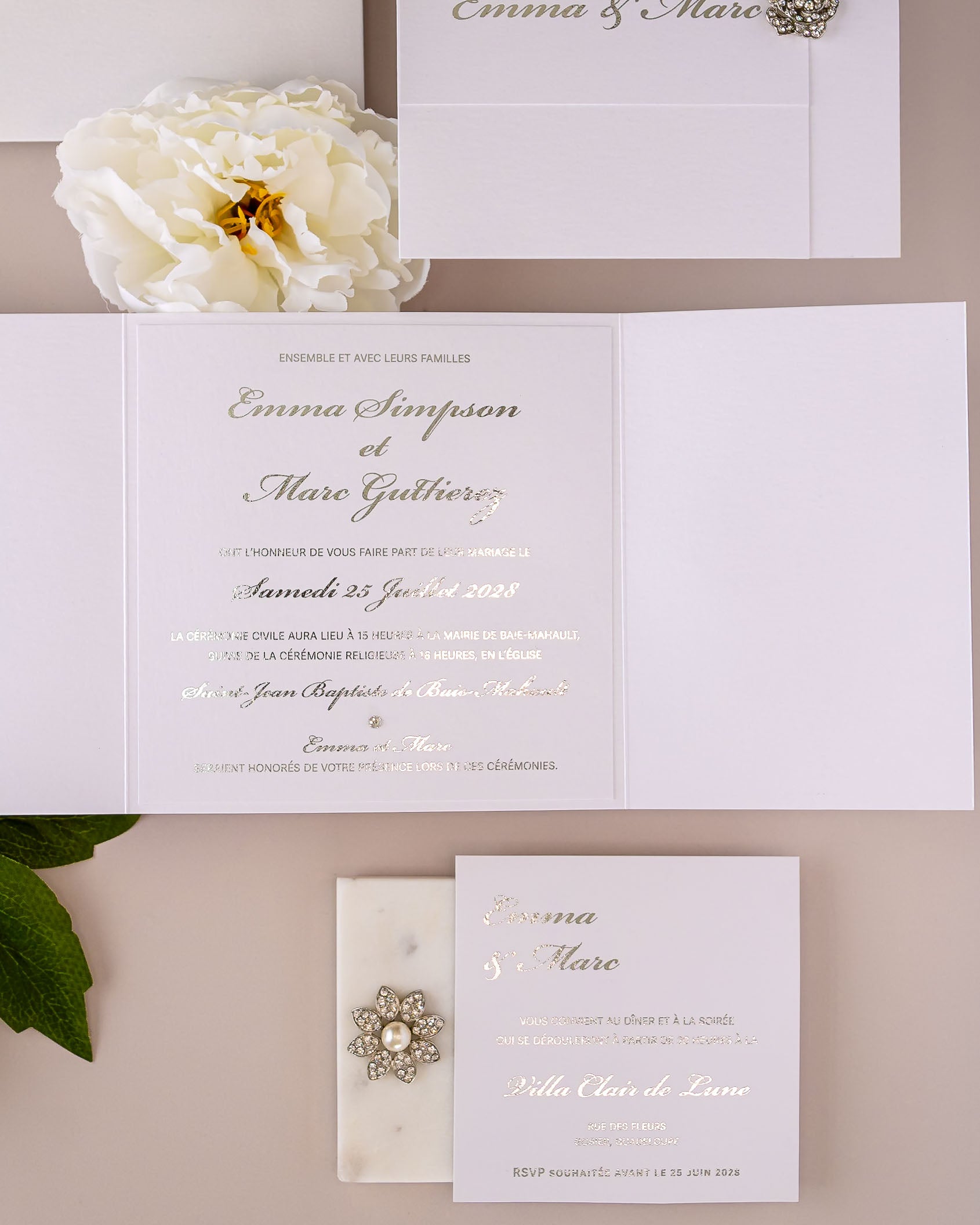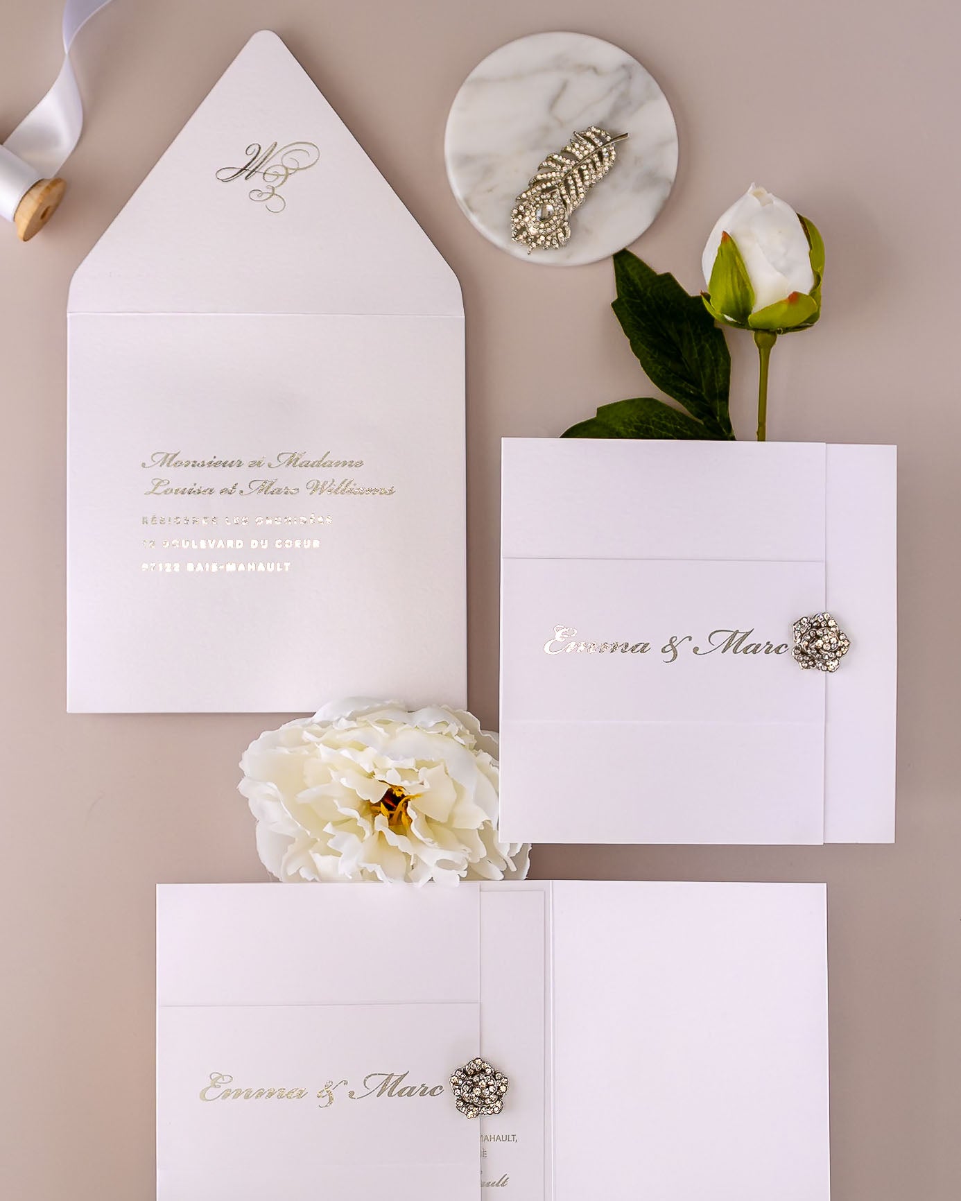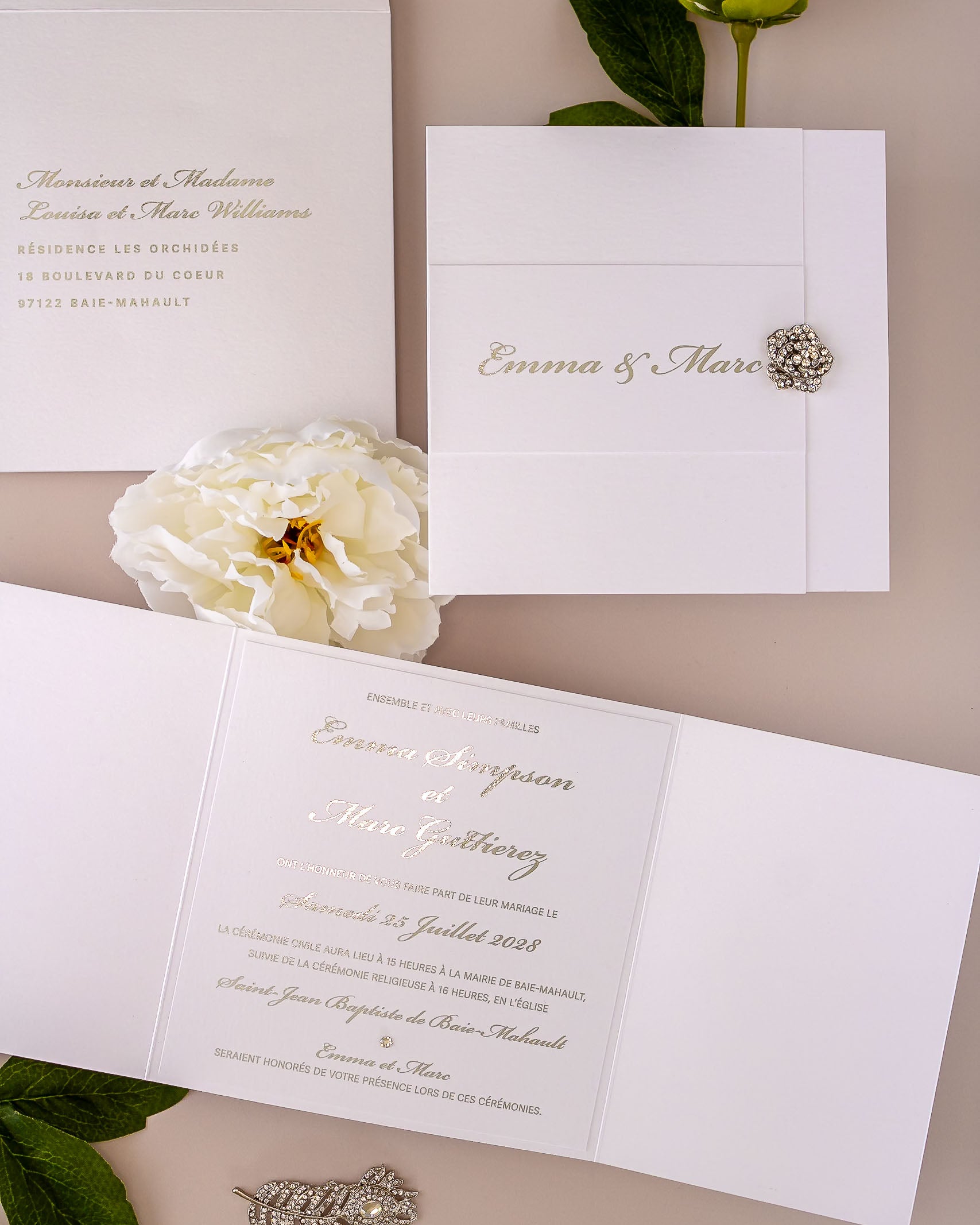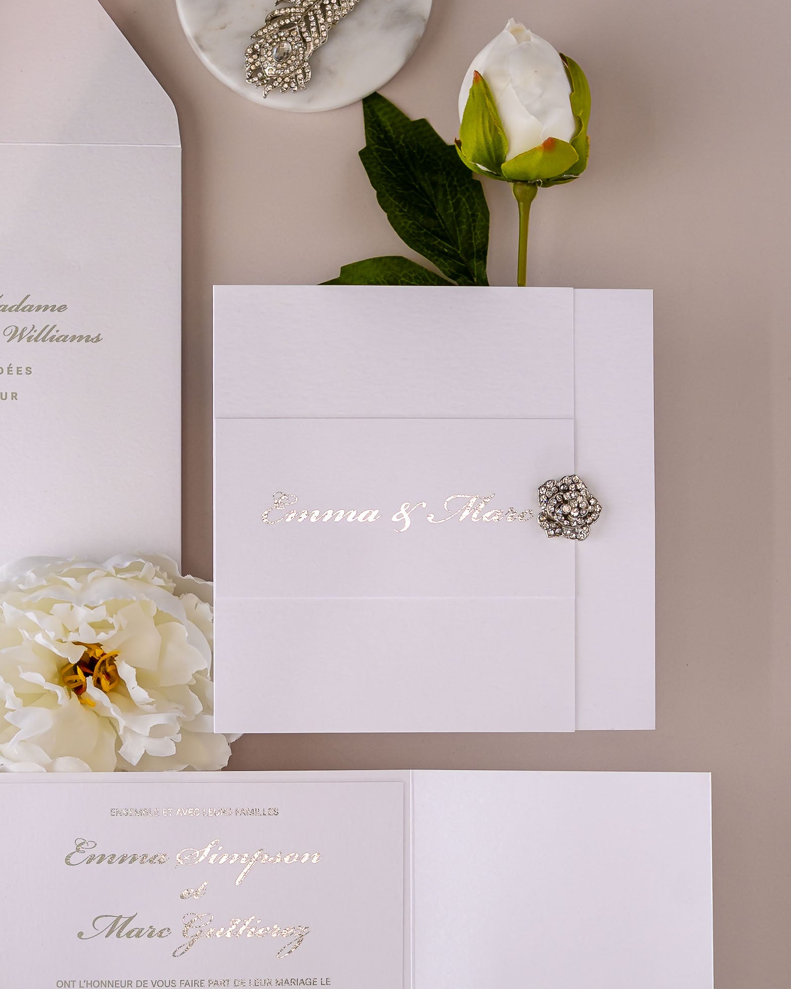 Elégant Faire-part de mariage moderne et chic sublimé par un bouton strass à l'avant.