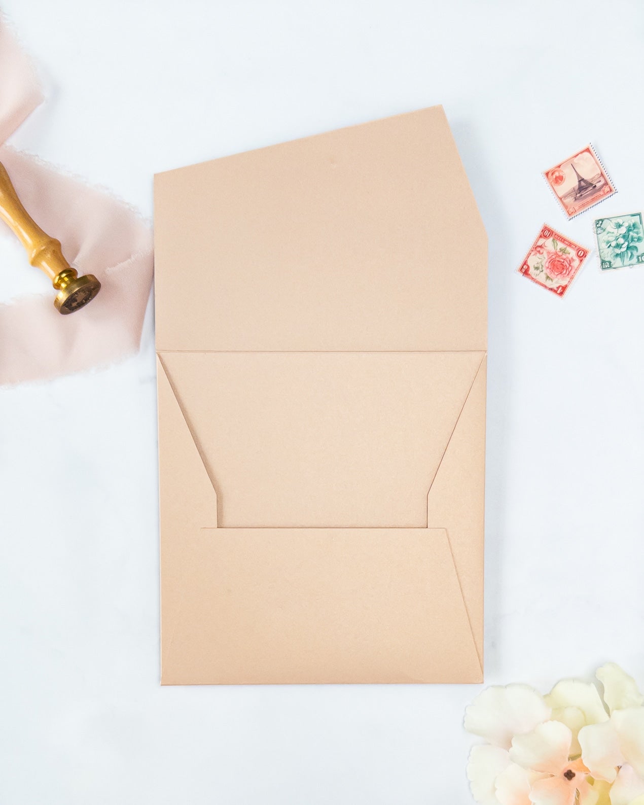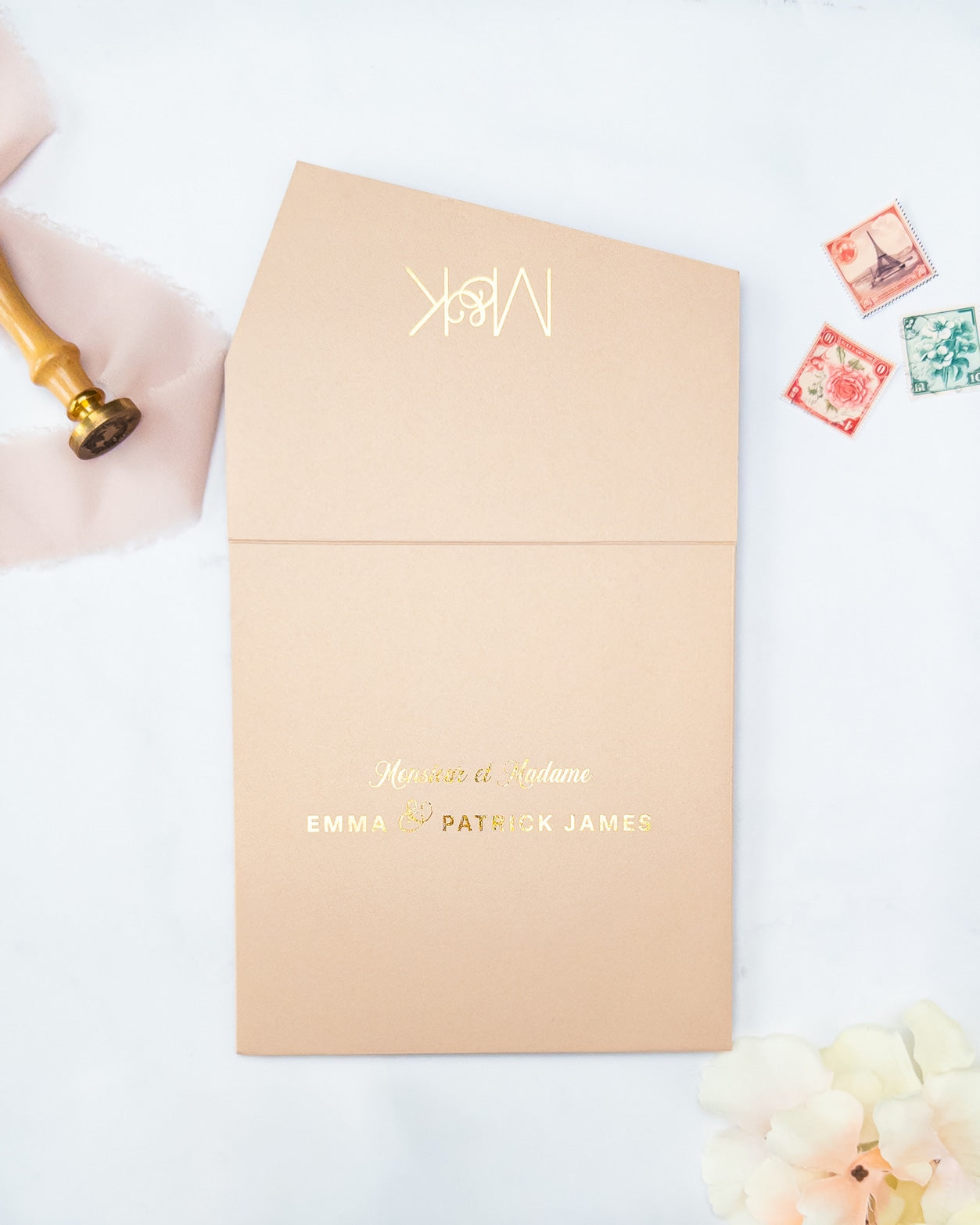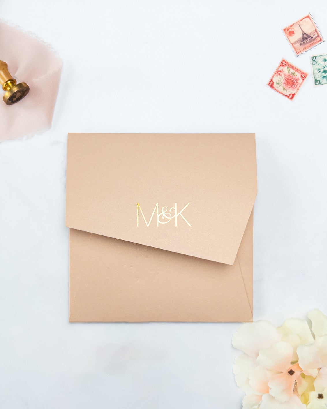 Nos enveloppes chics et élégantes, sont entièrement faites à la main avec amour et soin. Laissez-nous éblouir vos invités pour votre grand jour !