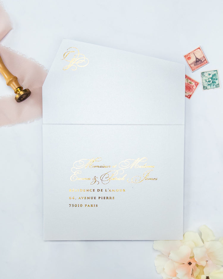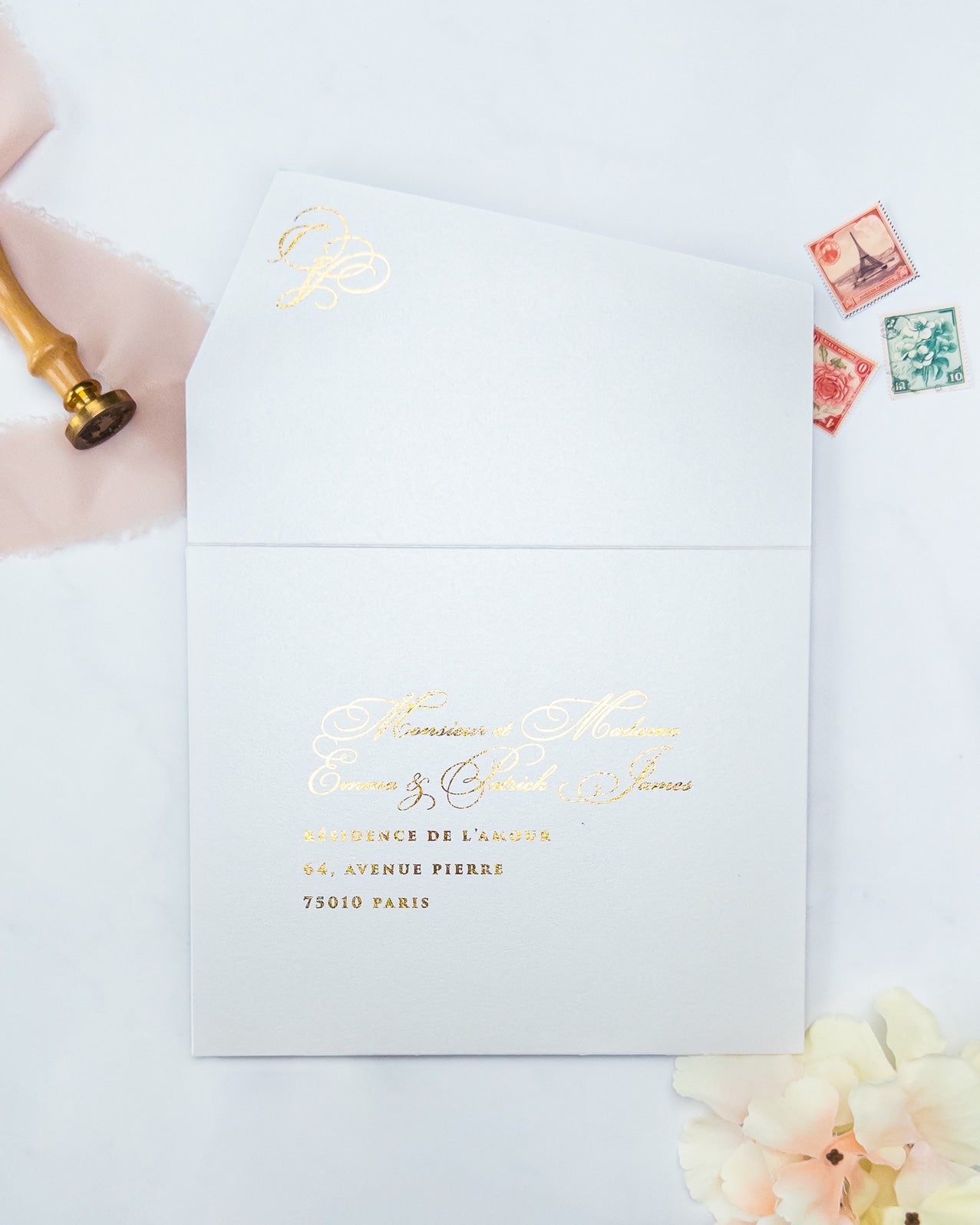 Nos enveloppes chics et élégantes, sont entièrement faites à la main avec amour et soin. Laissez-nous éblouir vos invités pour votre grand jour !