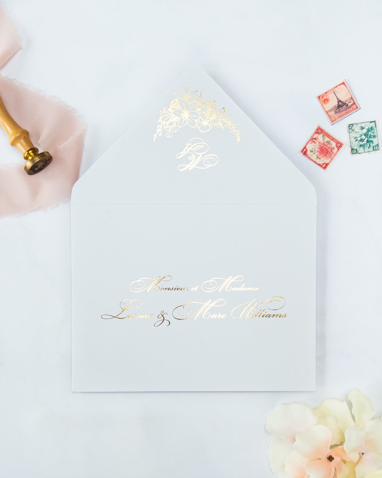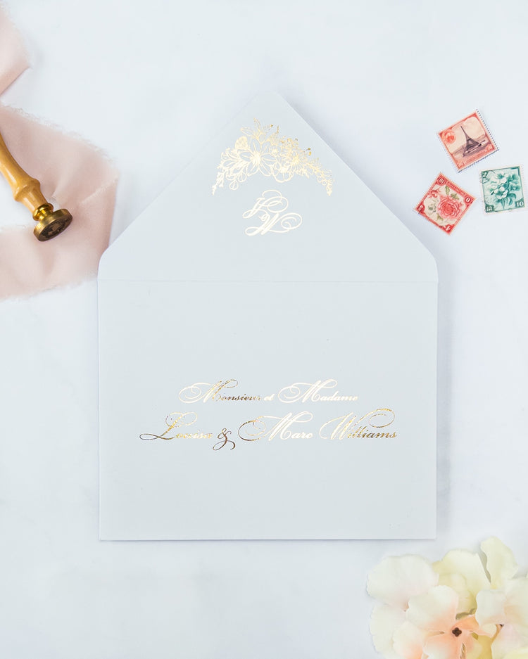 Nos enveloppes chics et élégantes, sont entièrement faites à la main avec amour et soin. Laissez-nous éblouir vos invités pour votre grand jour !