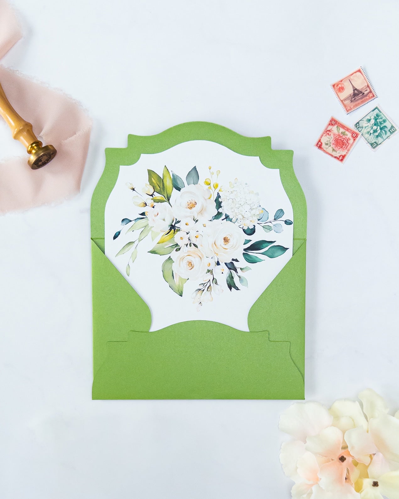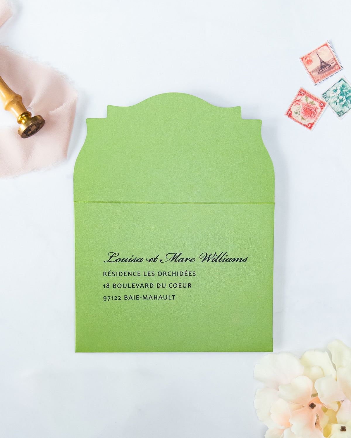 Nos enveloppes chics et élégantes, sont entièrement faites à la main avec amour et soin. Laissez-nous éblouir vos invités pour votre grand jour !