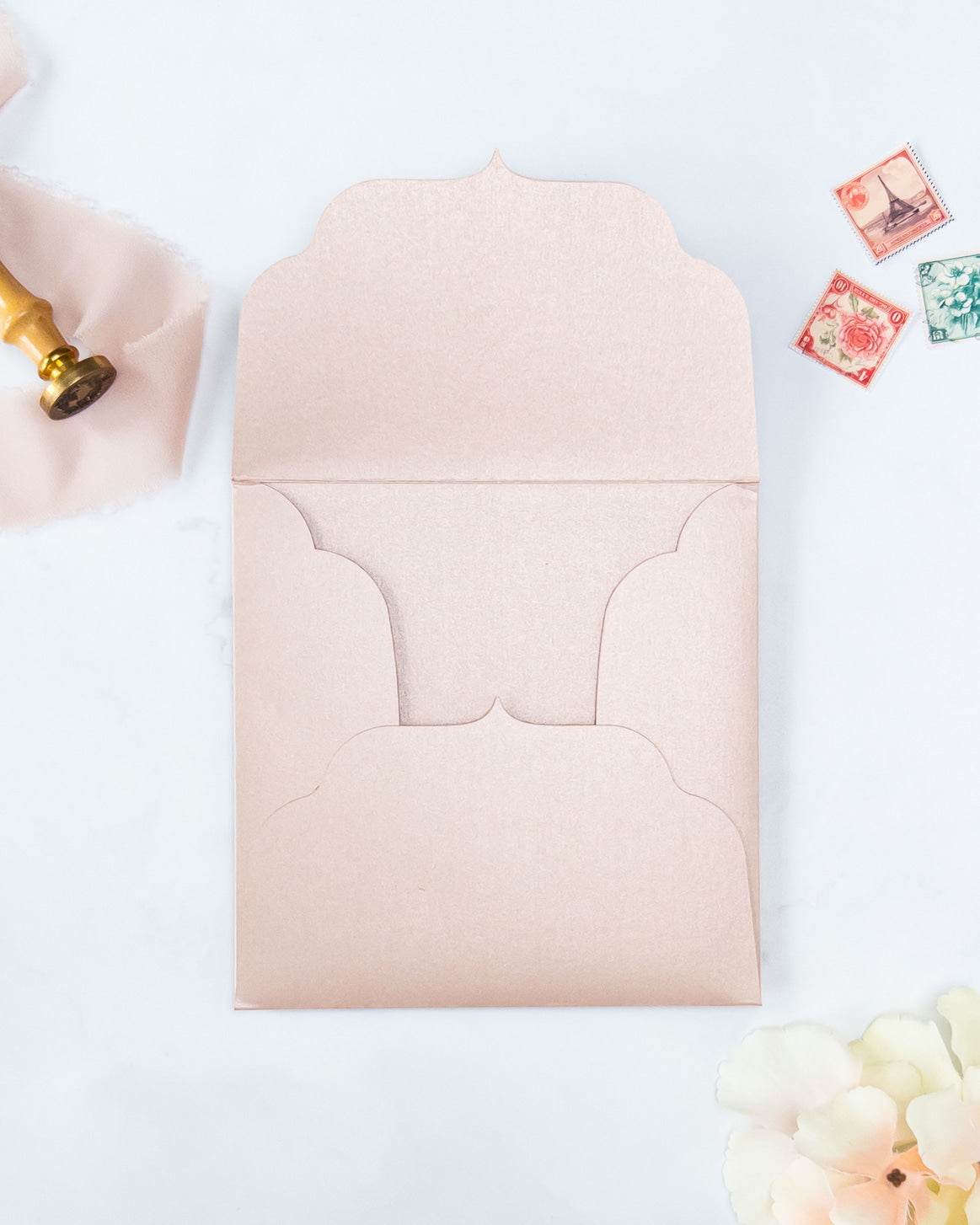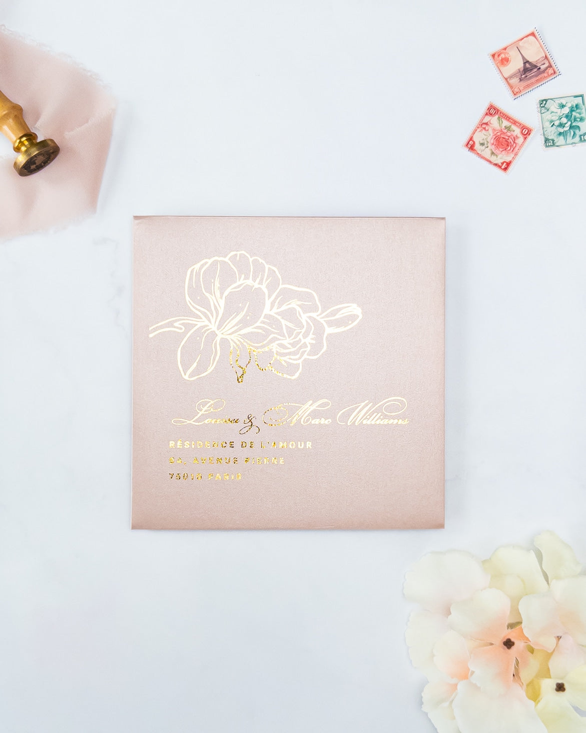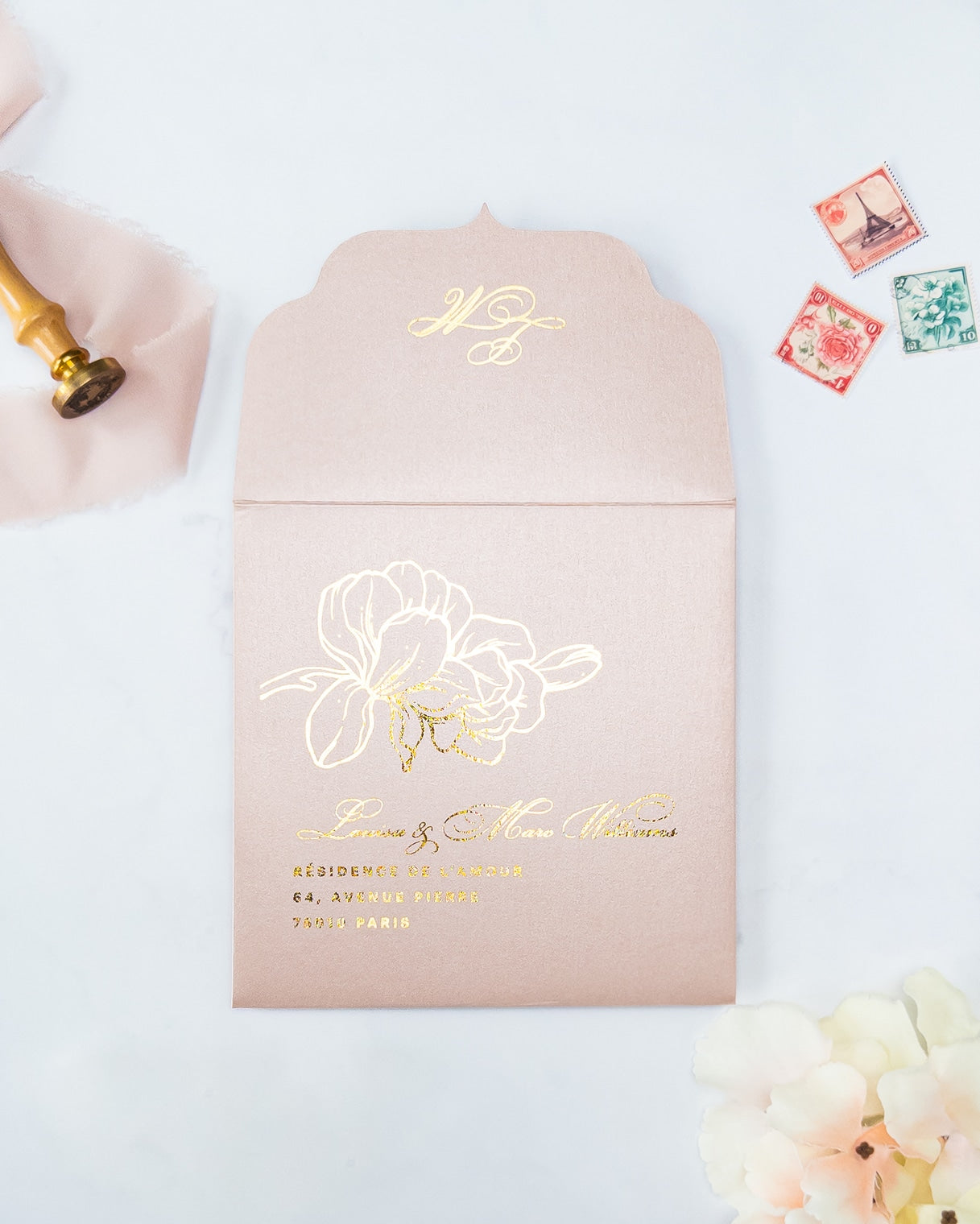 Nos enveloppes chics et élégantes, sont entièrement faites à la main avec amour et soin. Laissez-nous éblouir vos invités pour votre grand jour !