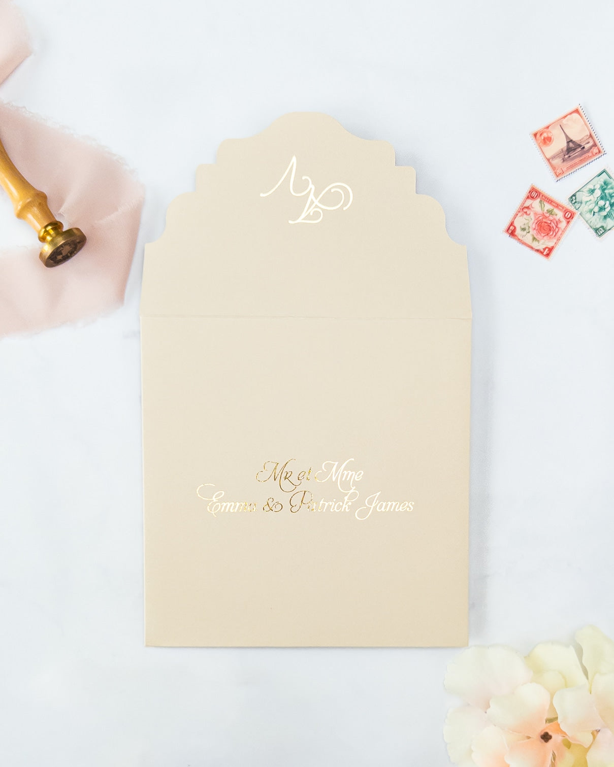 Nos enveloppes chics et élégantes, sont entièrement faites à la main avec amour et soin. Laissez-nous éblouir vos invités pour votre grand jour !