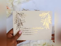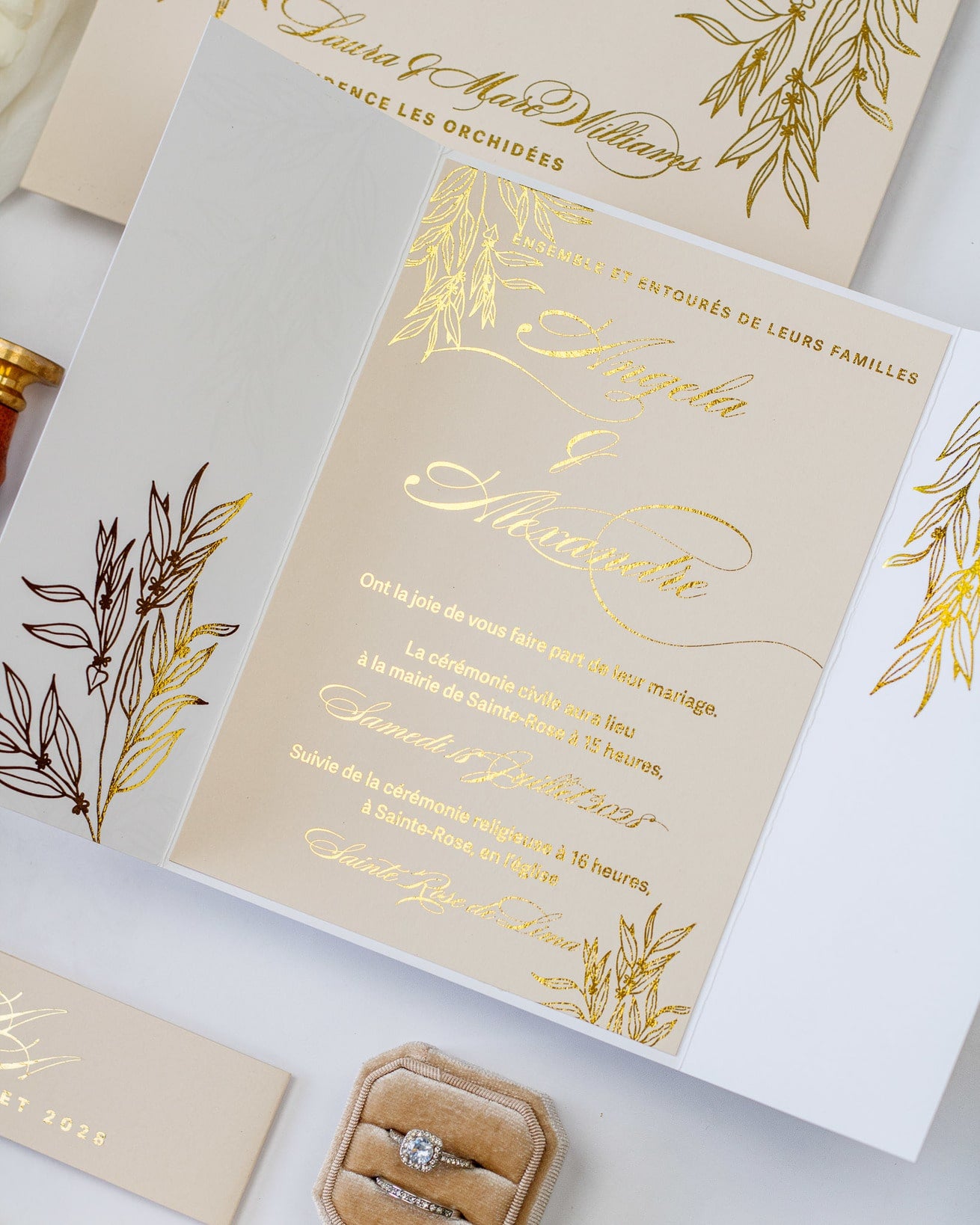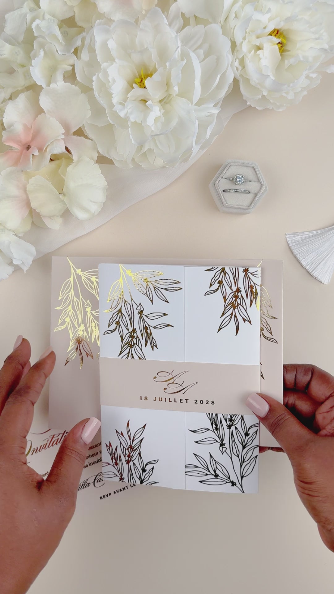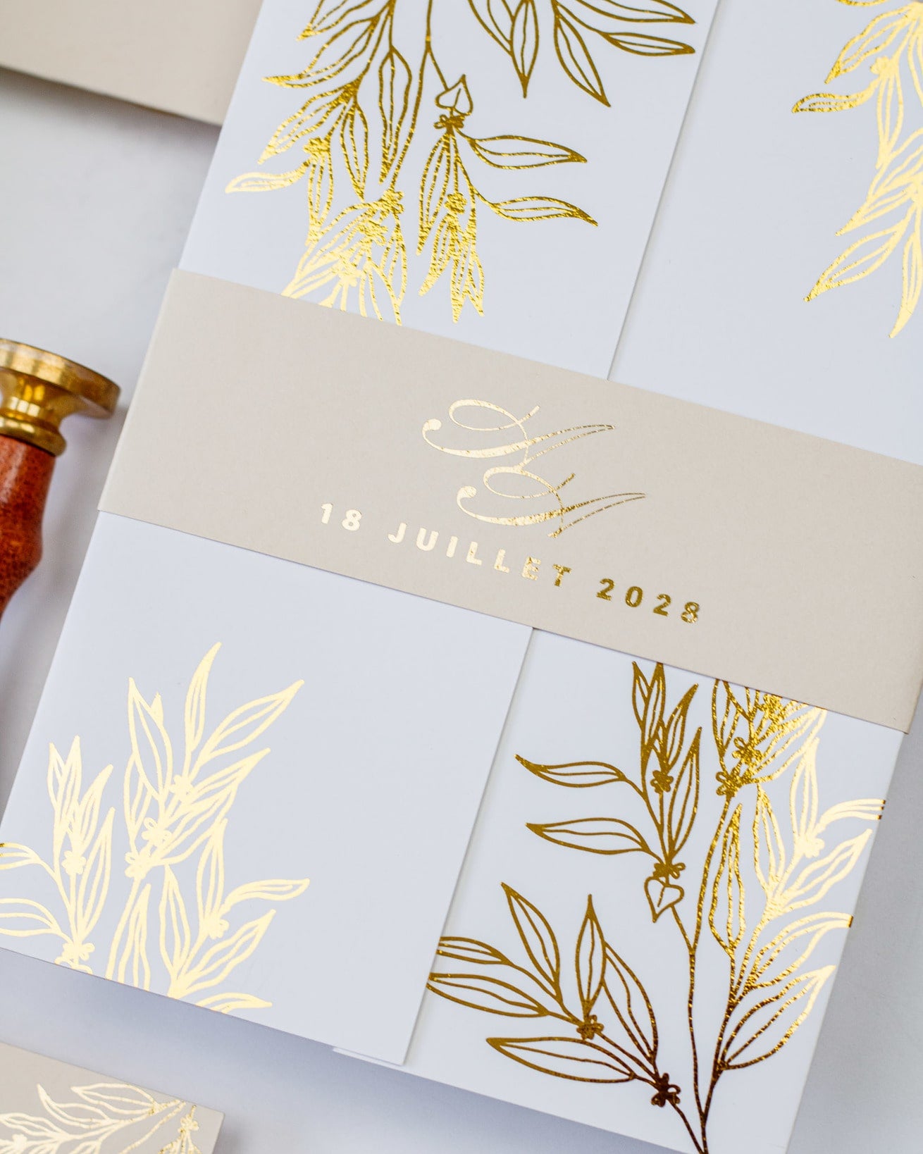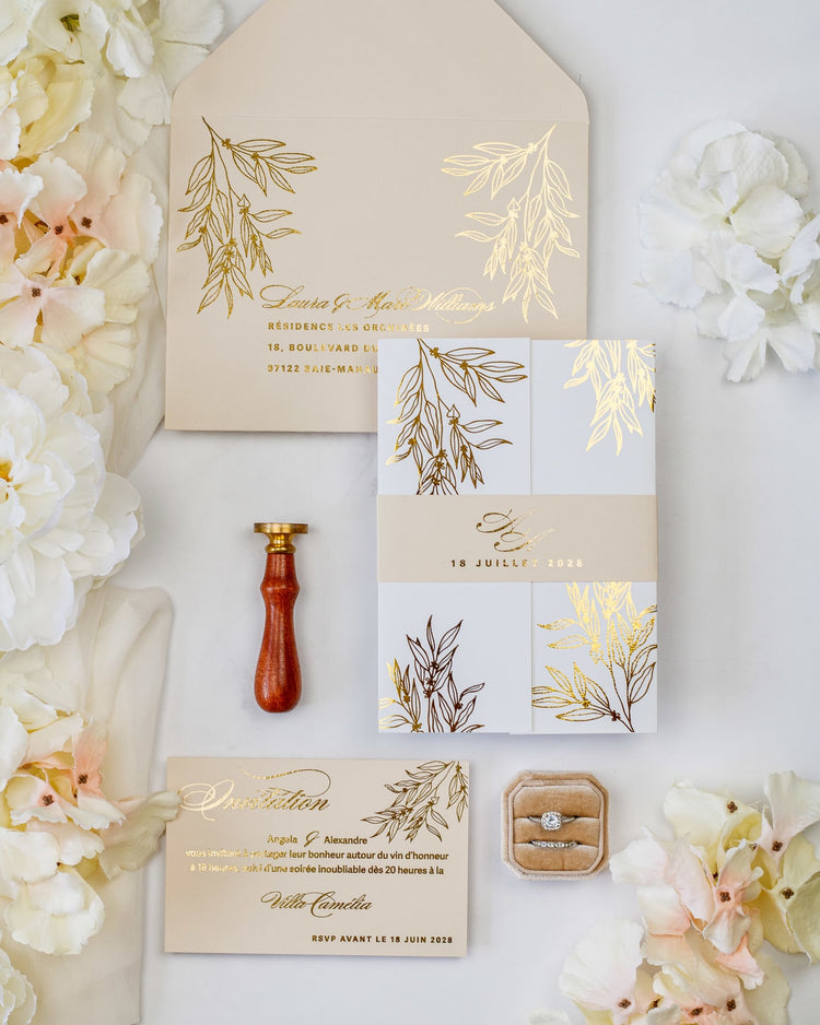 Elégant faire-part de mariage enveloppé dans une pochette au toucher soyeux imprimée de motifs floraux sublimés par une finition or.