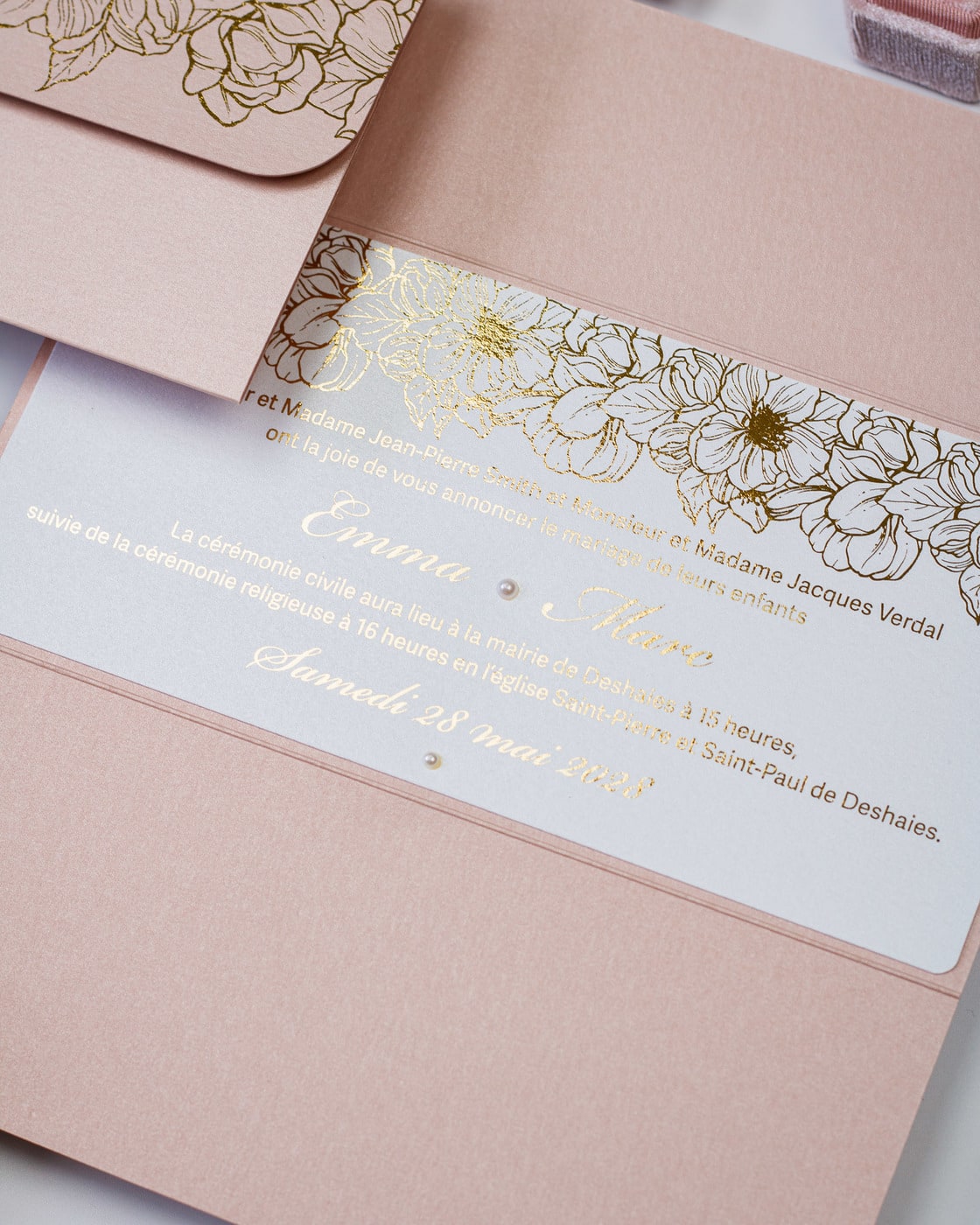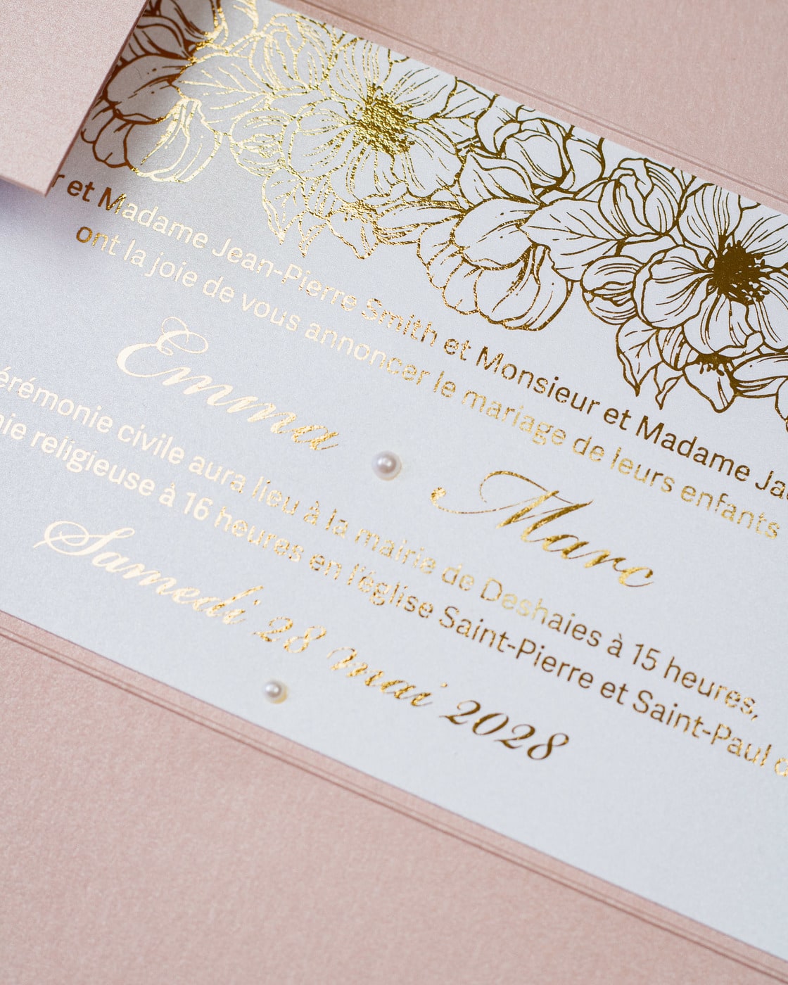Faire-part de mariage simple et élégant sublimé par la dorure et orné d'une perle blanche.