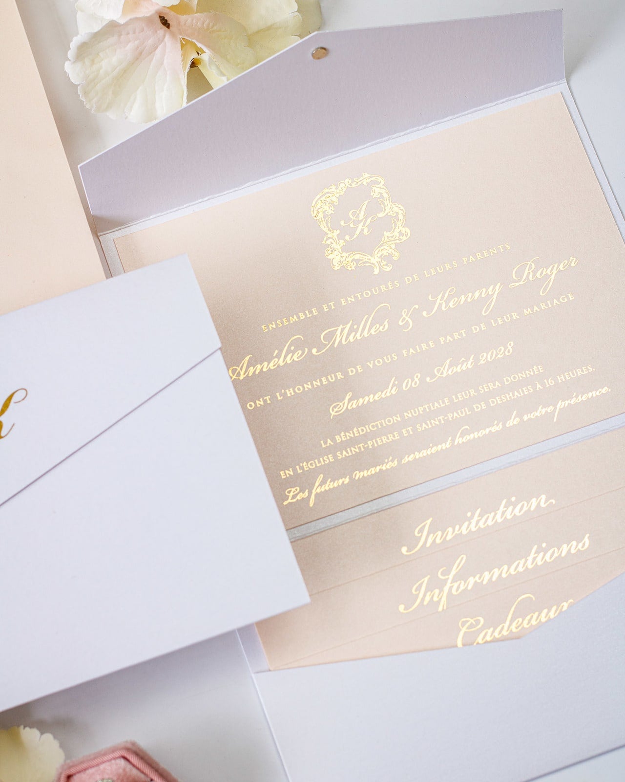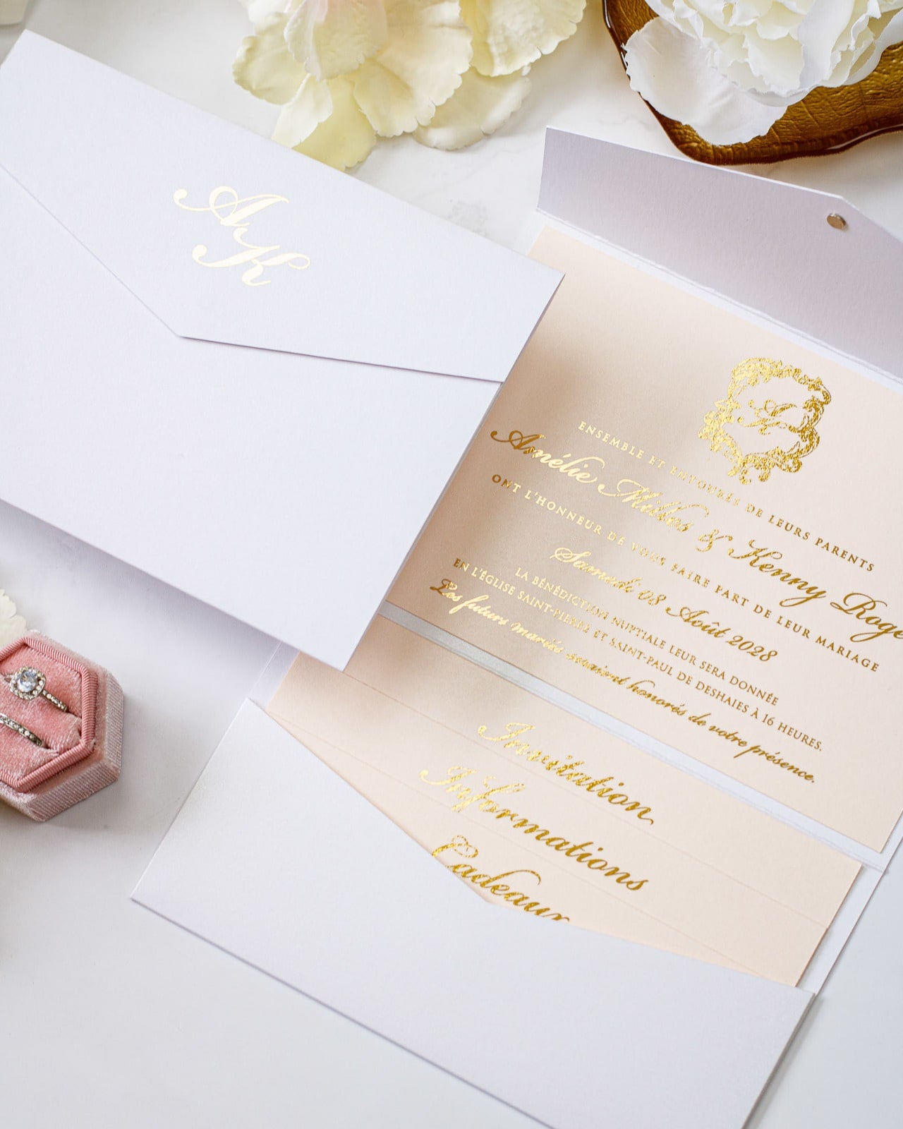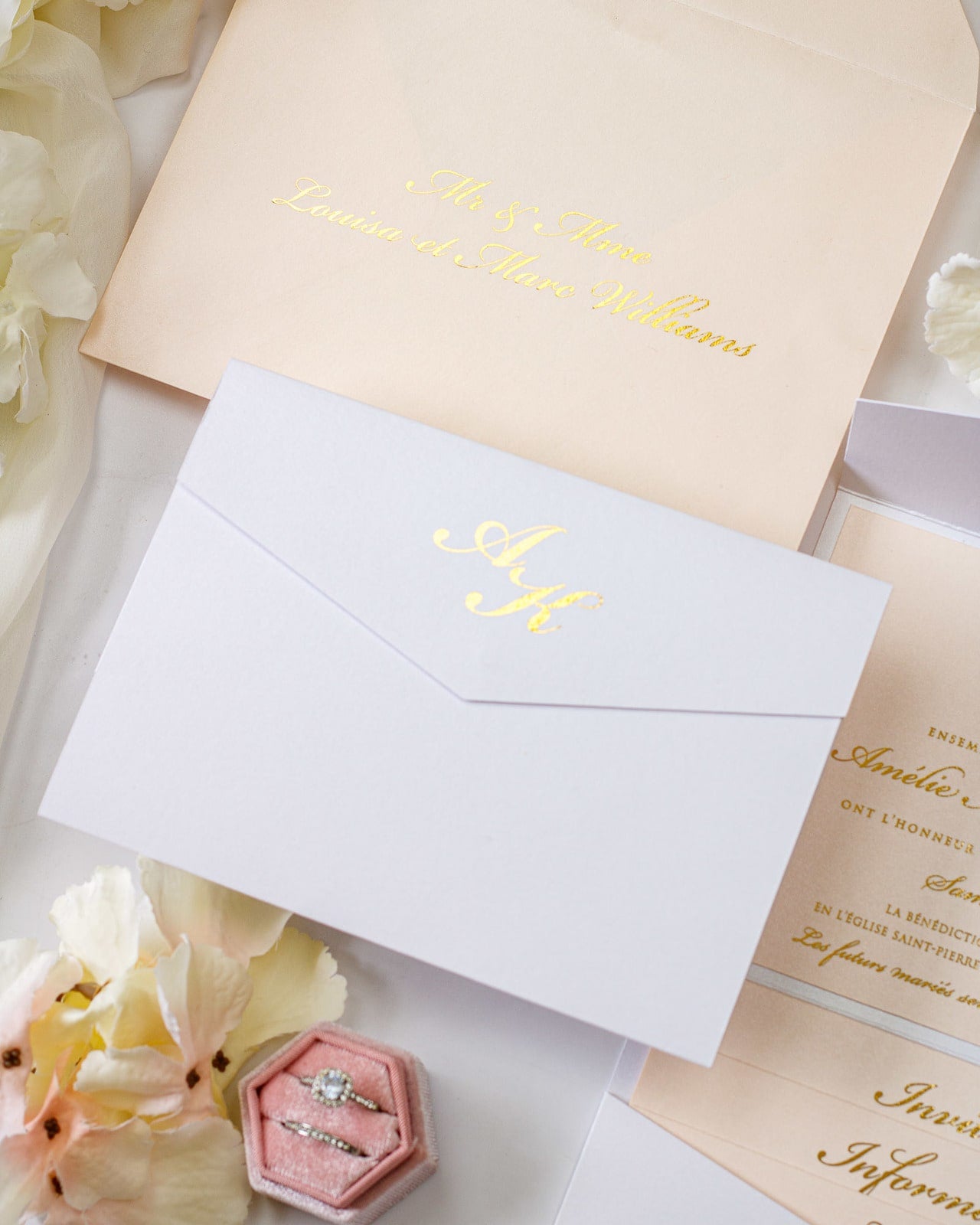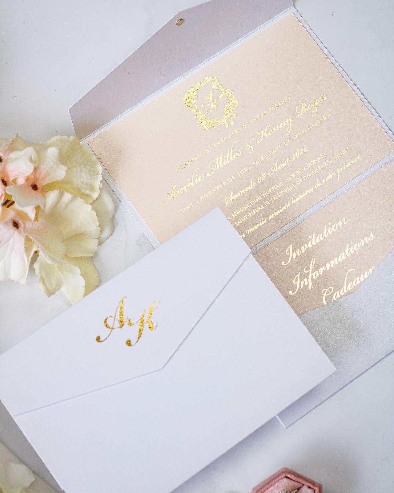 Faire-part de mariage chic et élégant. Le rabat de la pochette est personnalisé grâce à l'impression en dorure.