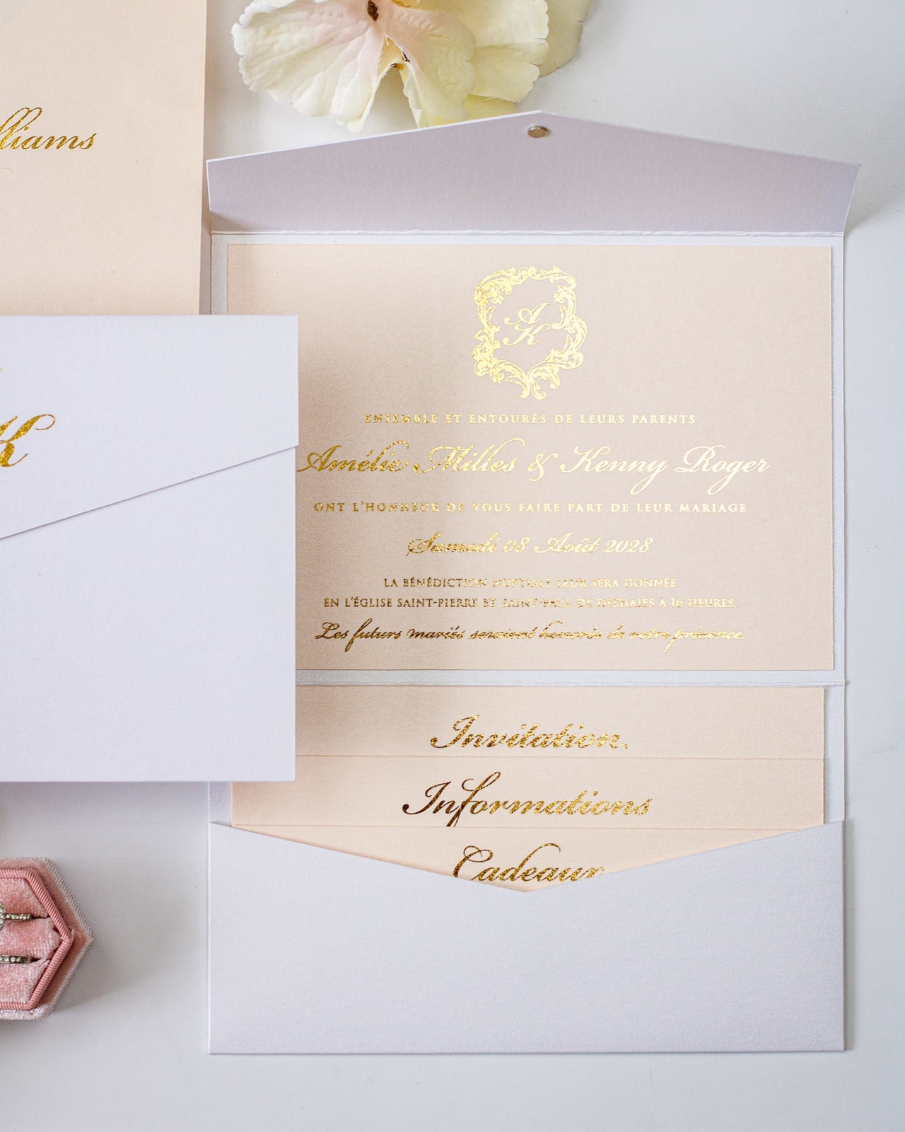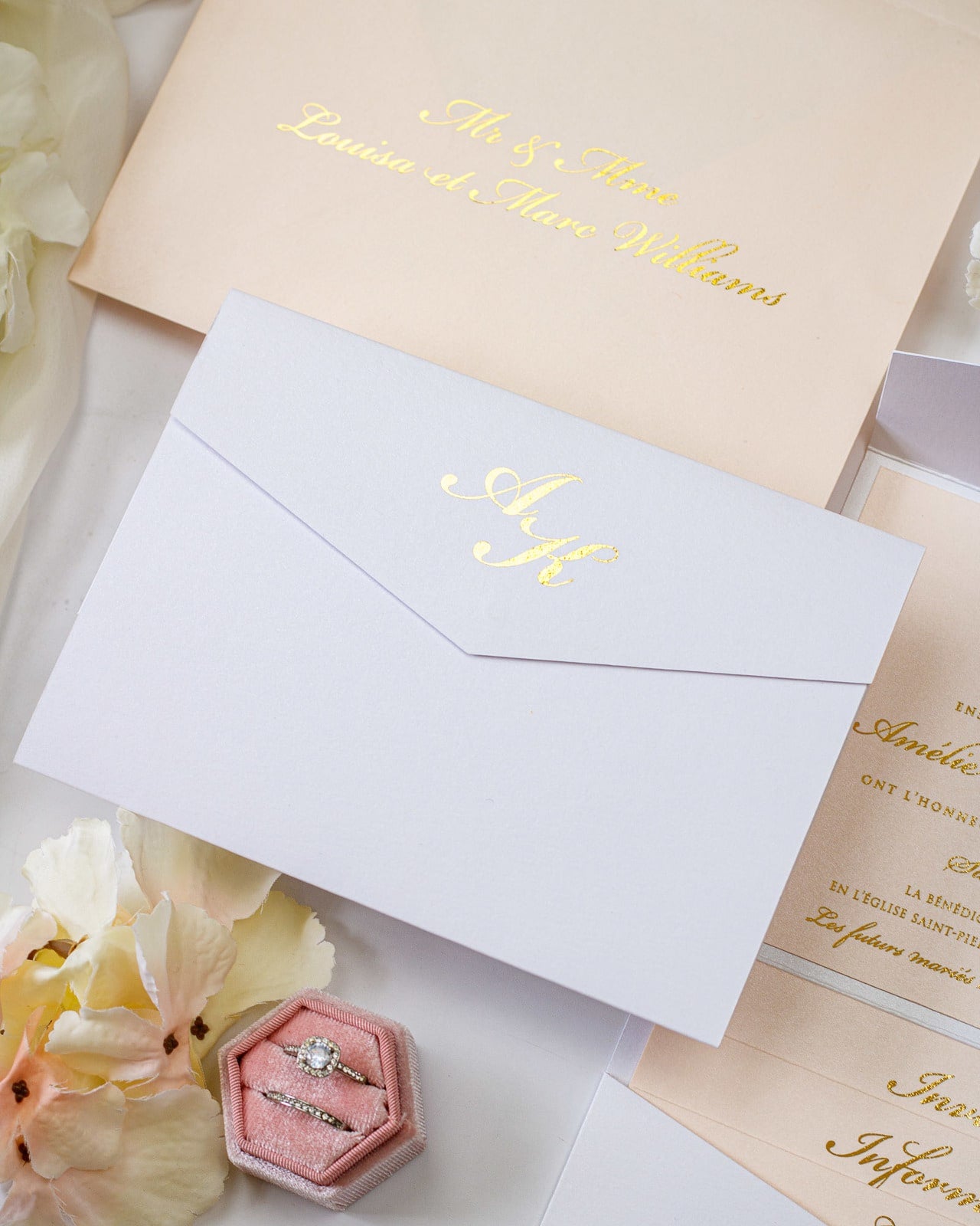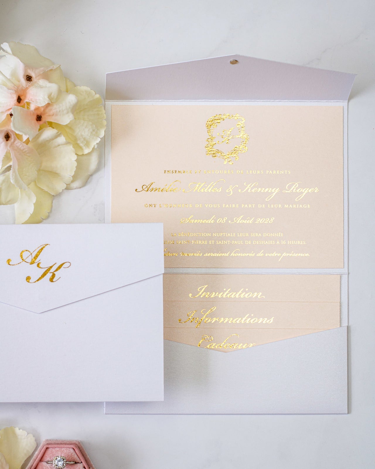 Faire-part de mariage chic et élégant. Le rabat de la pochette est personnalisé grâce à l'impression en dorure.
