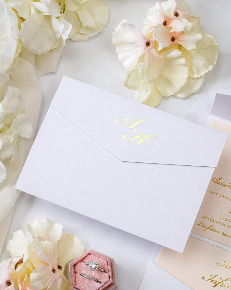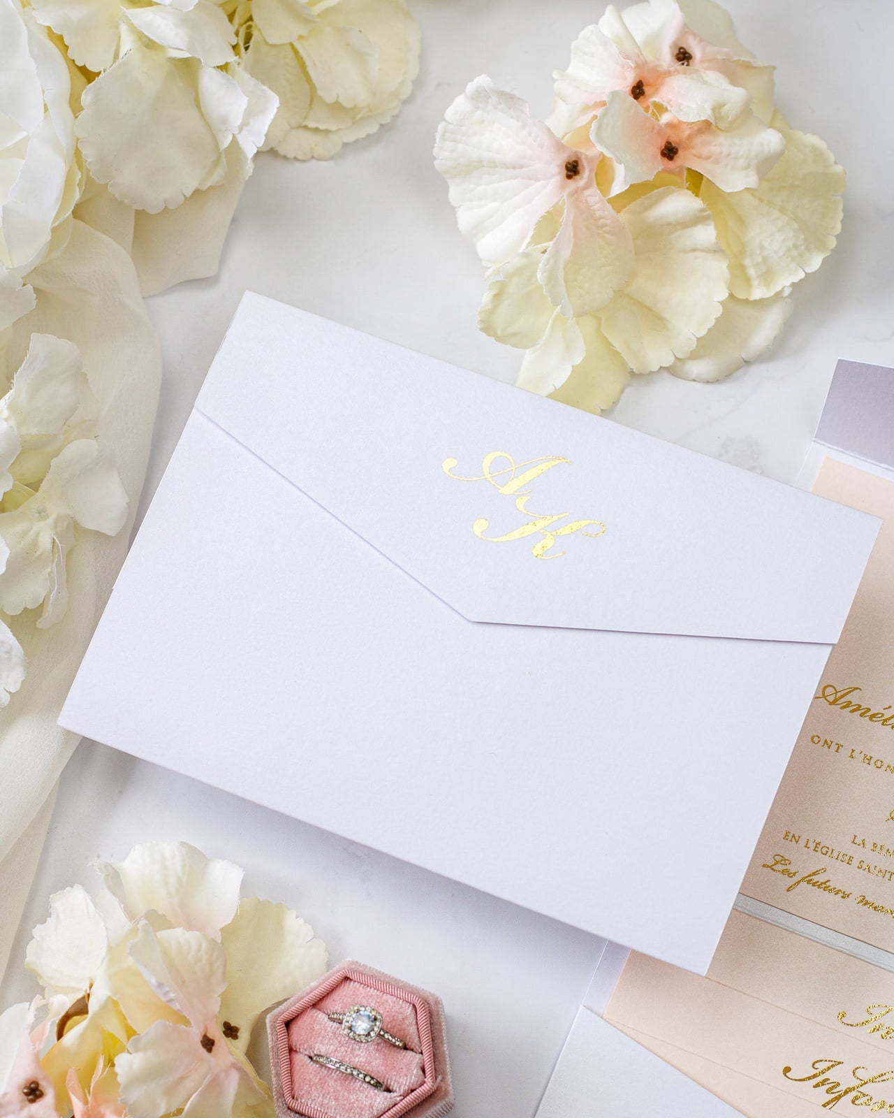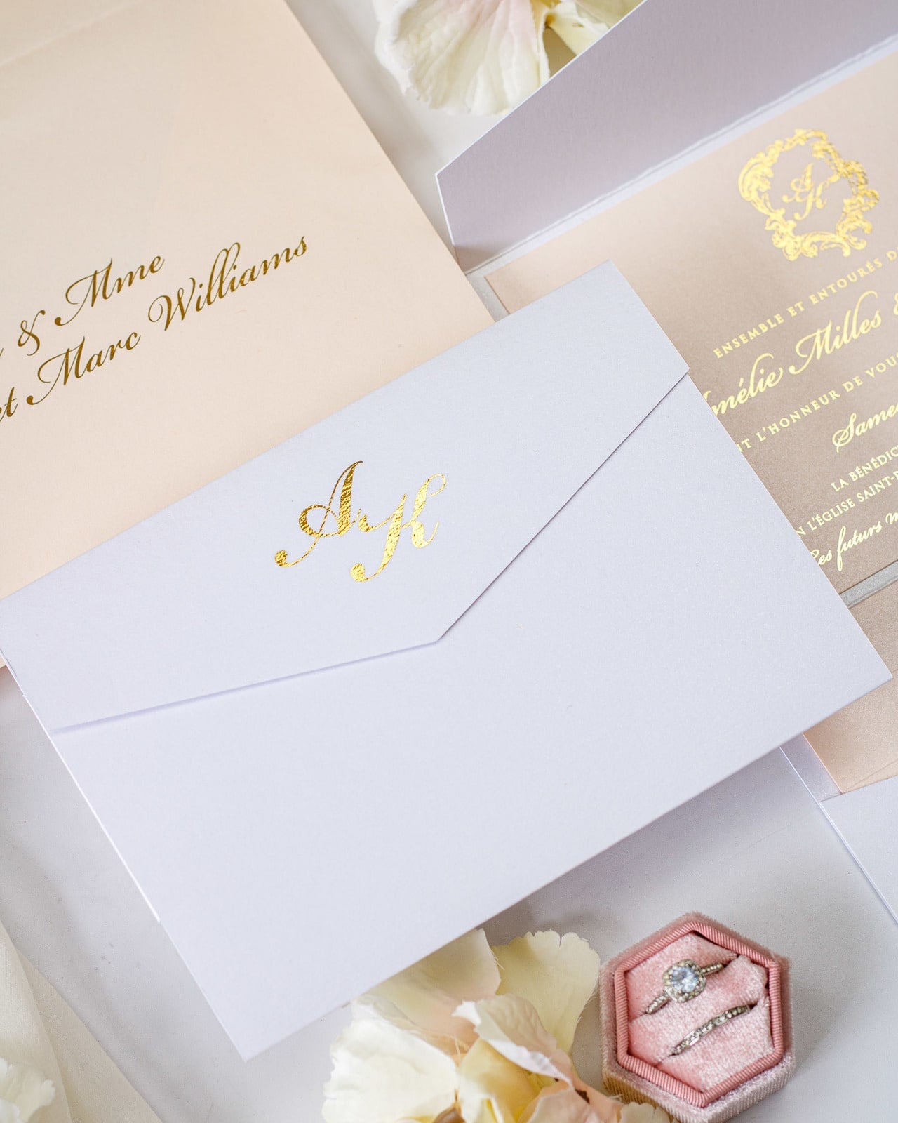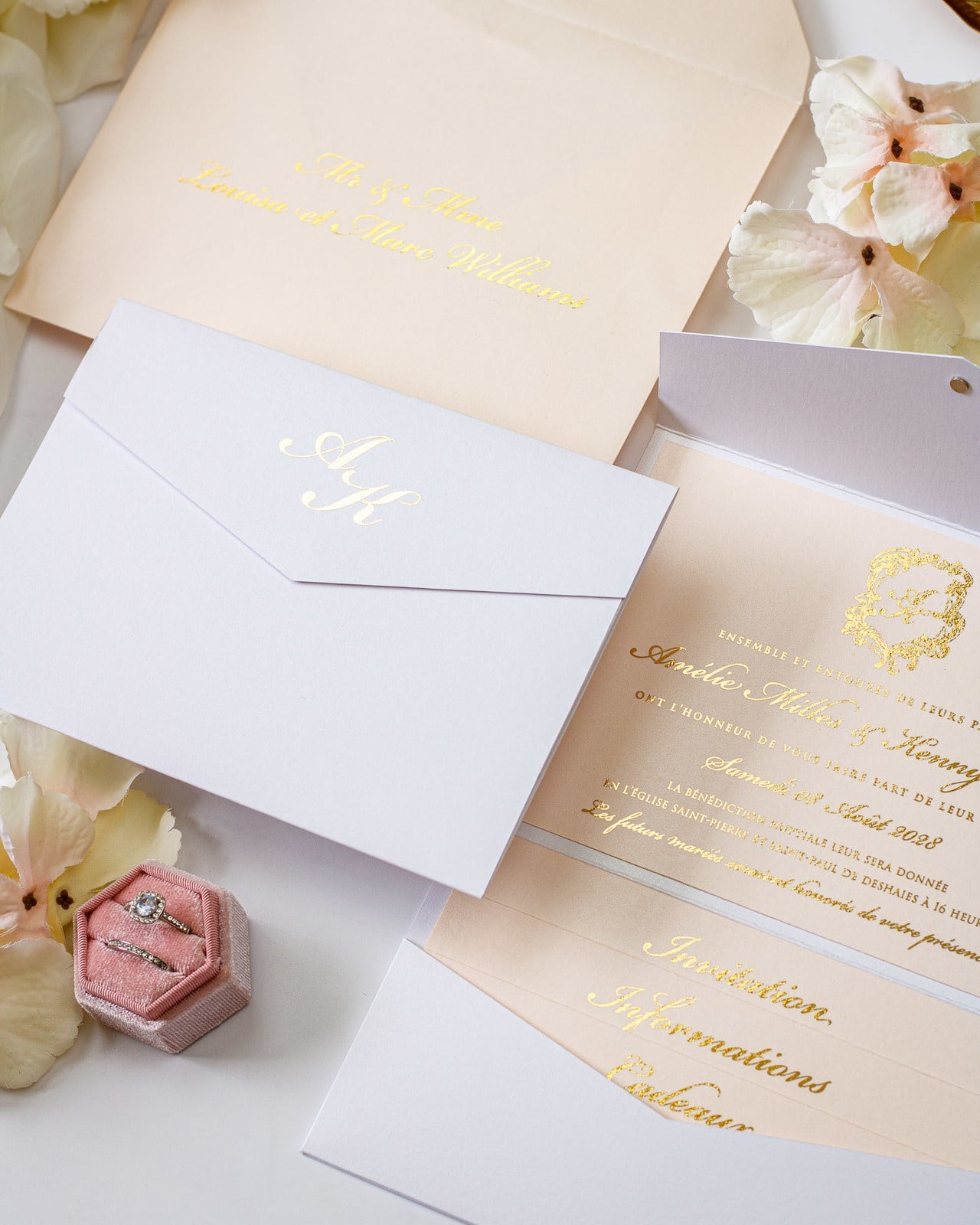 Faire-part de mariage chic et élégant. Le rabat de la pochette est personnalisé grâce à l'impression en dorure.
