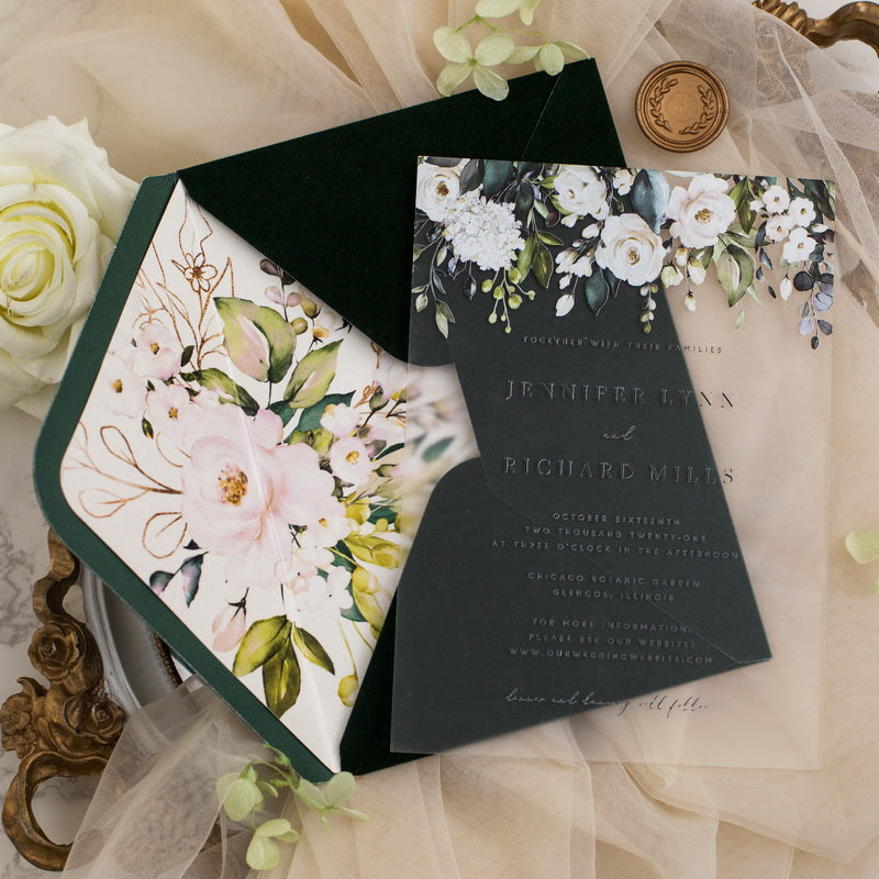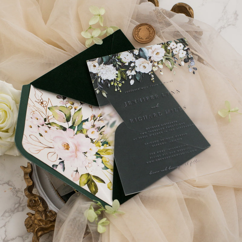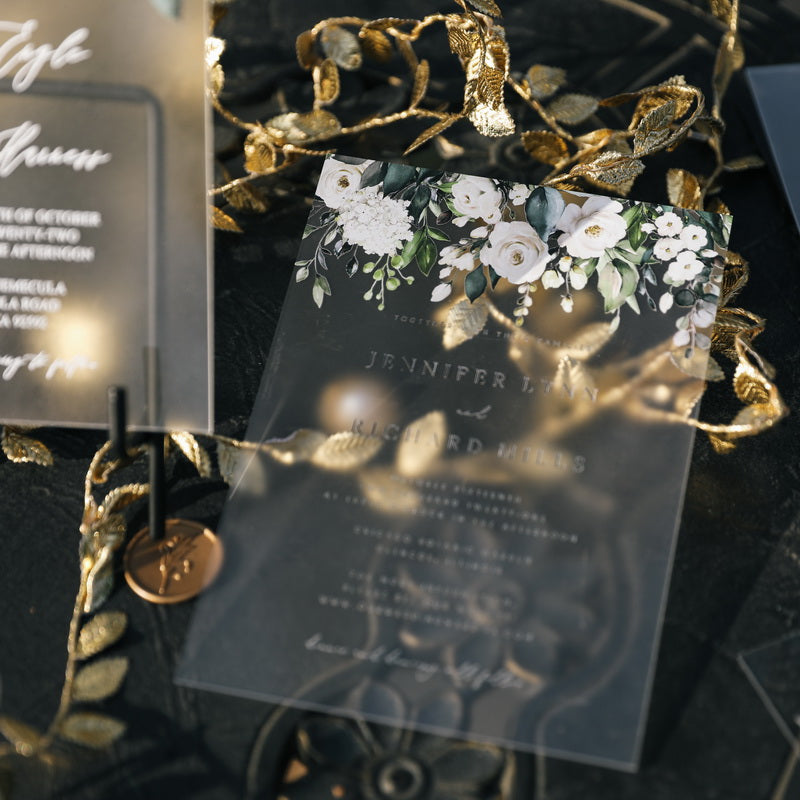 Le faire-part acrylique capte l’œil comme une pièce bijou : il joue avec les reflets, magnifie les dorures et transforme l’annonce de votre mariage en un objet précieux.