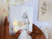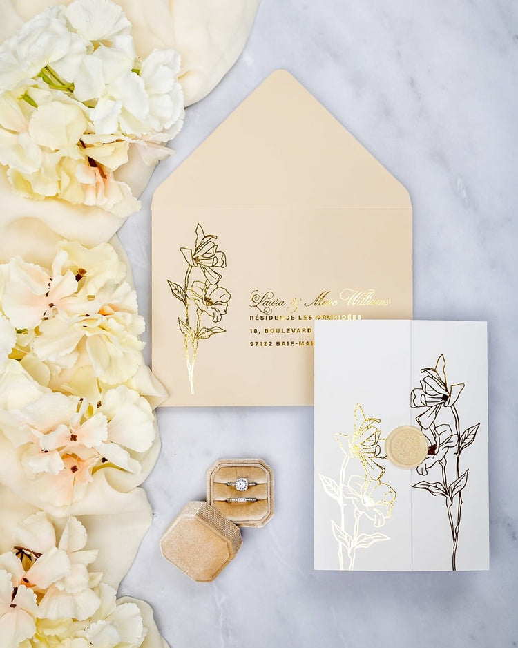 Superbe faire-part de mariage sublimé par une finition or, enveloppé dans une pochette imprimée de motifs floraux