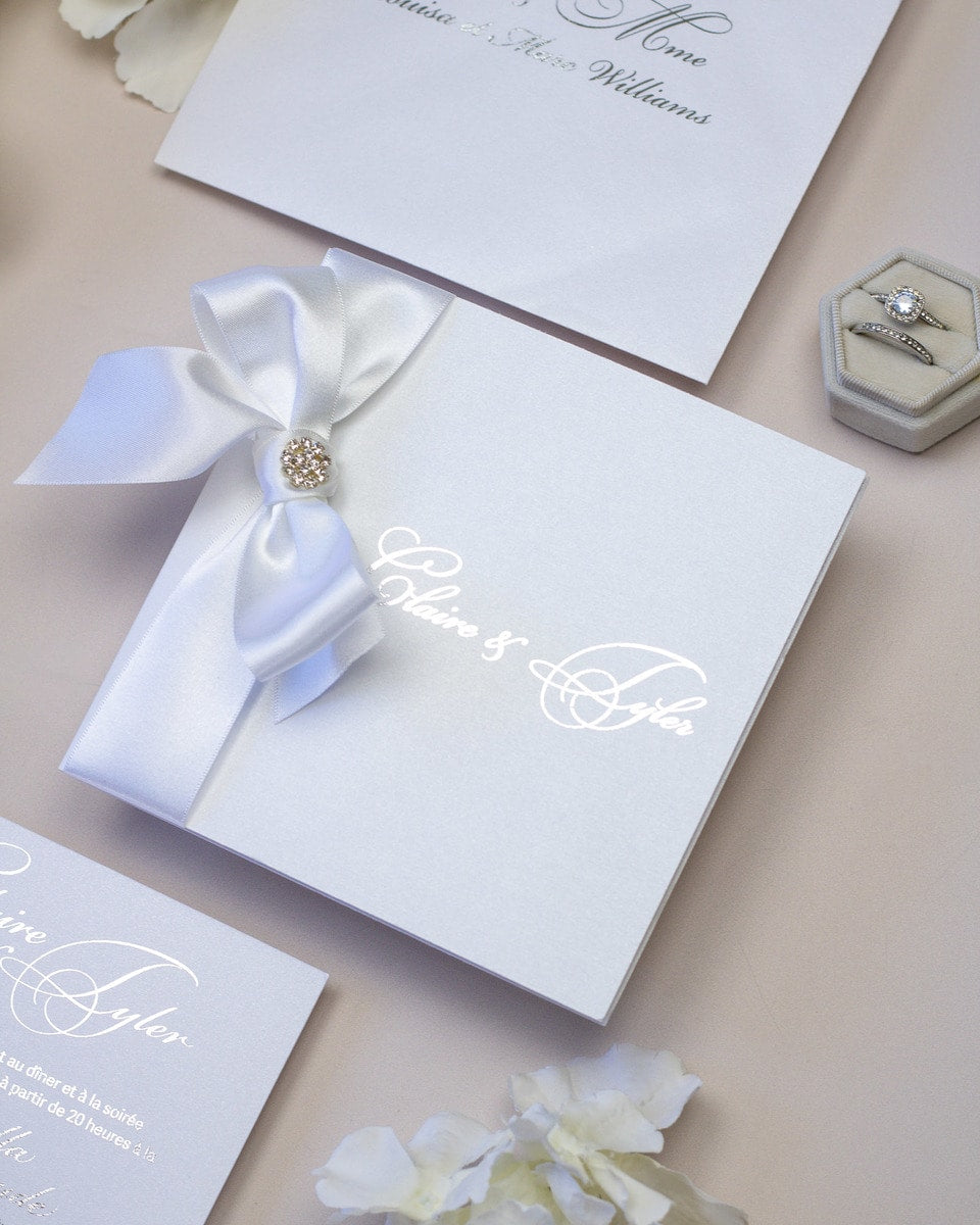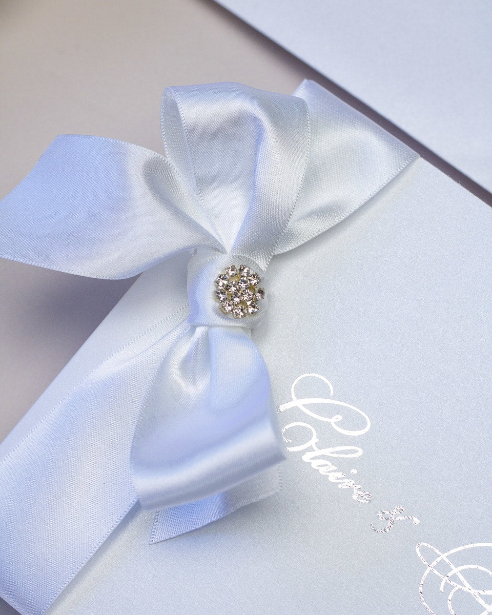 Faire-part simple et élégant, sublimé par un large ruban en satin ornée d'un bouton en strass.