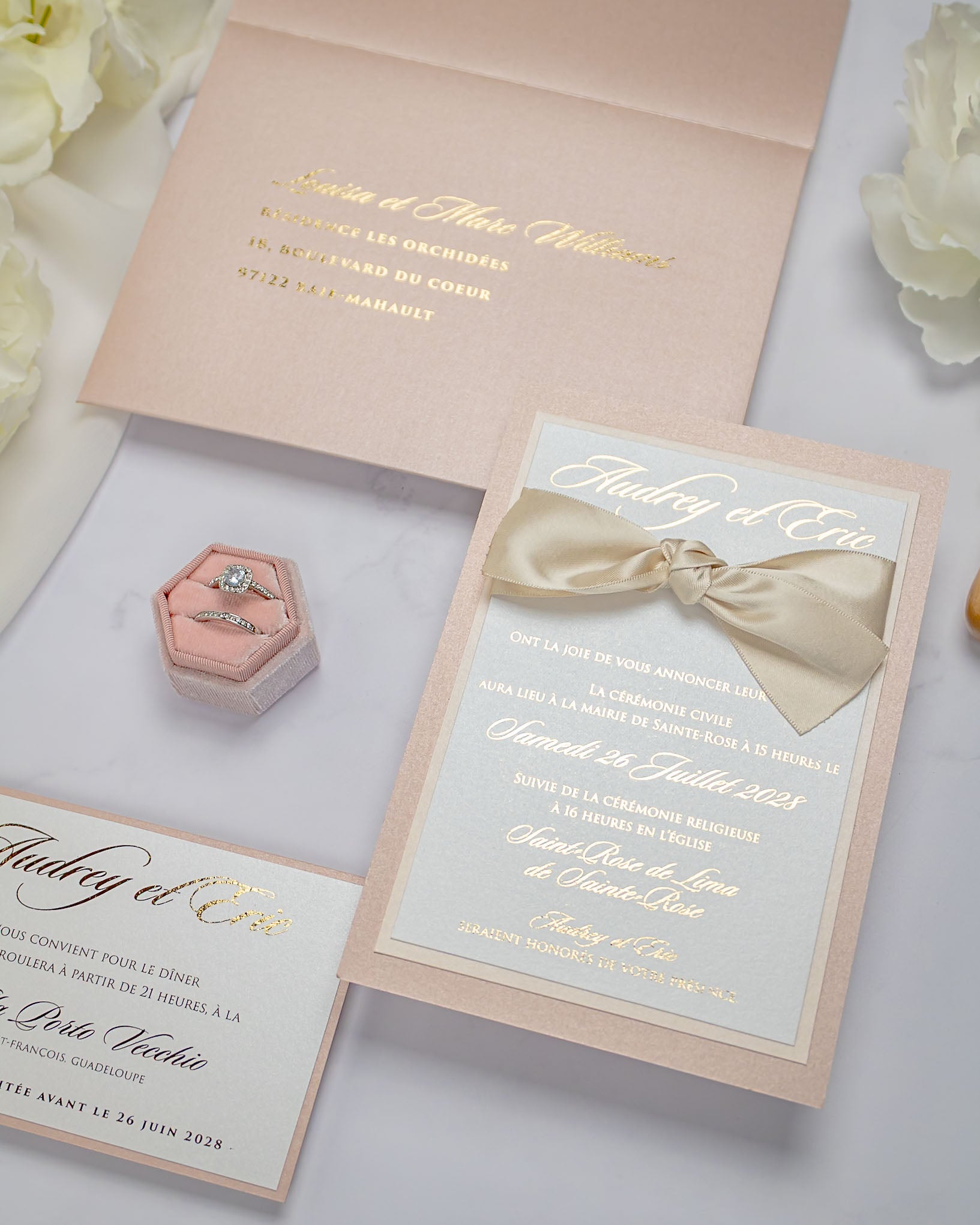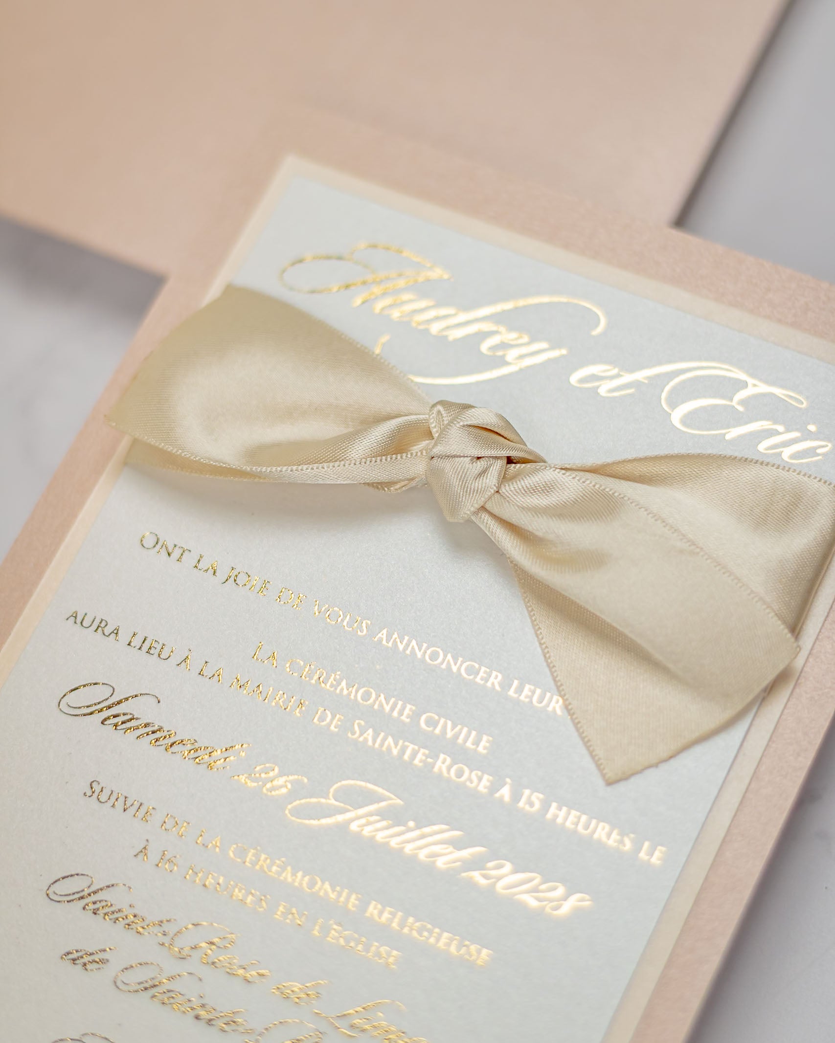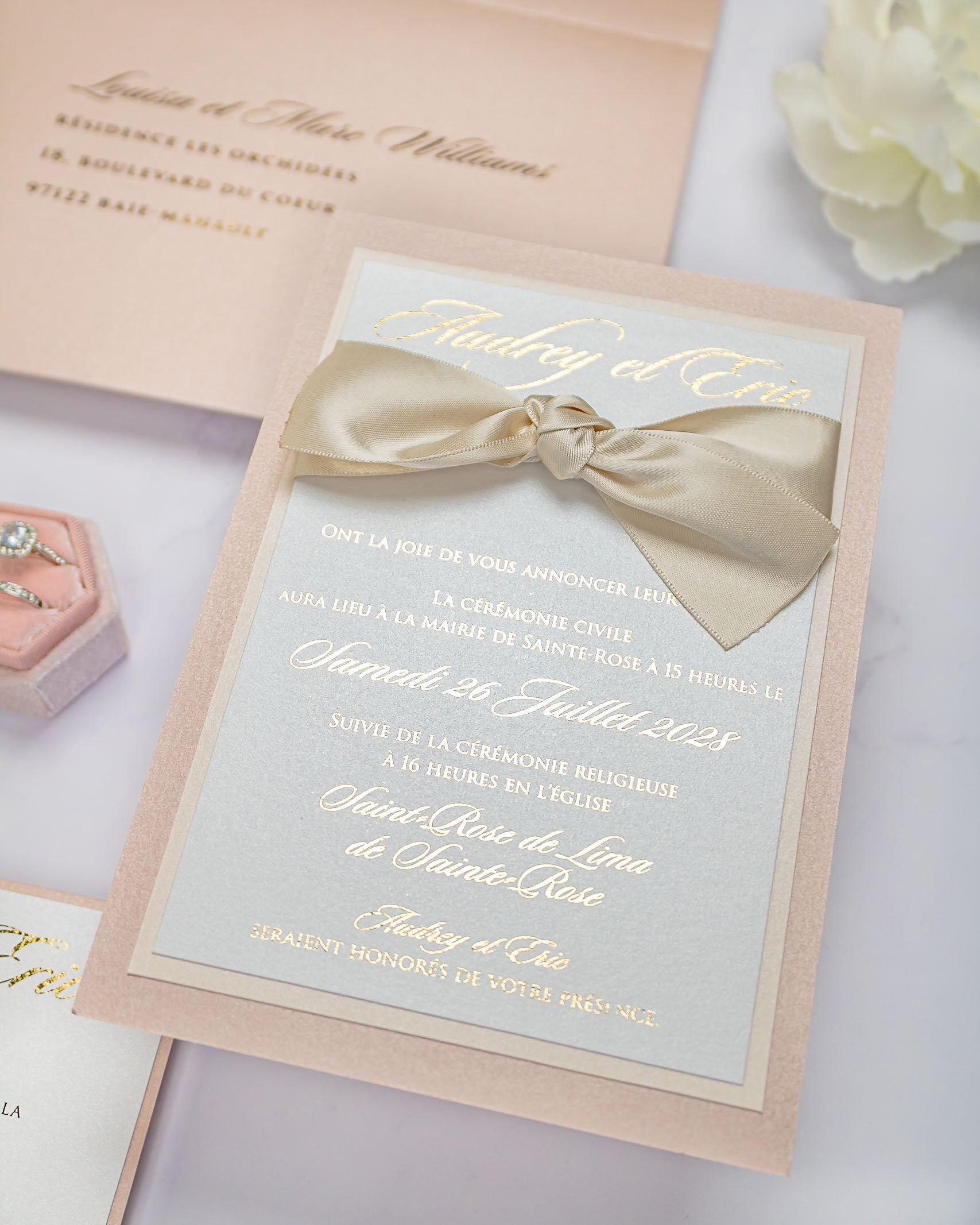 Elégant faire-part de mariage chic et romantique, sublimé par un beau ruban en satin.