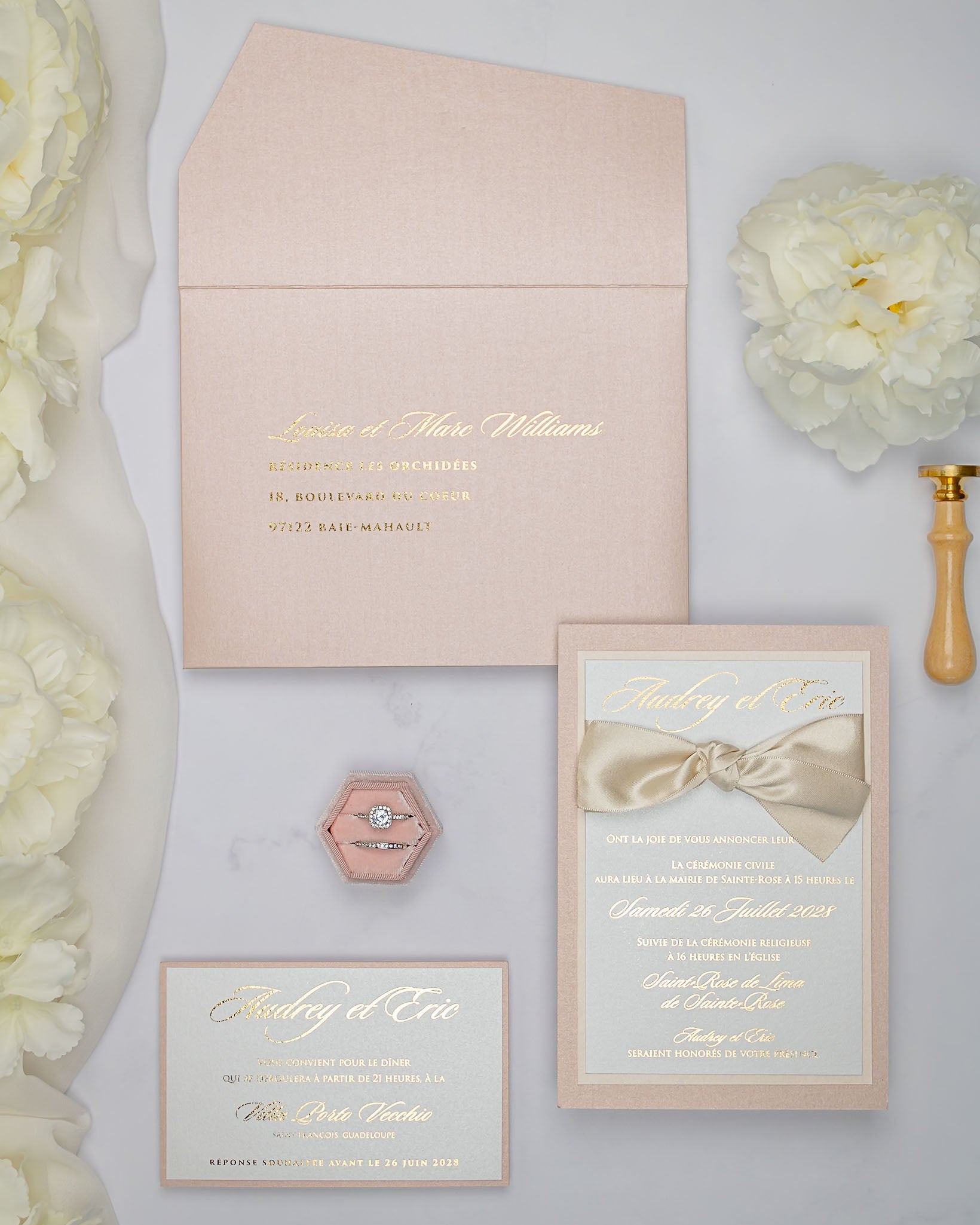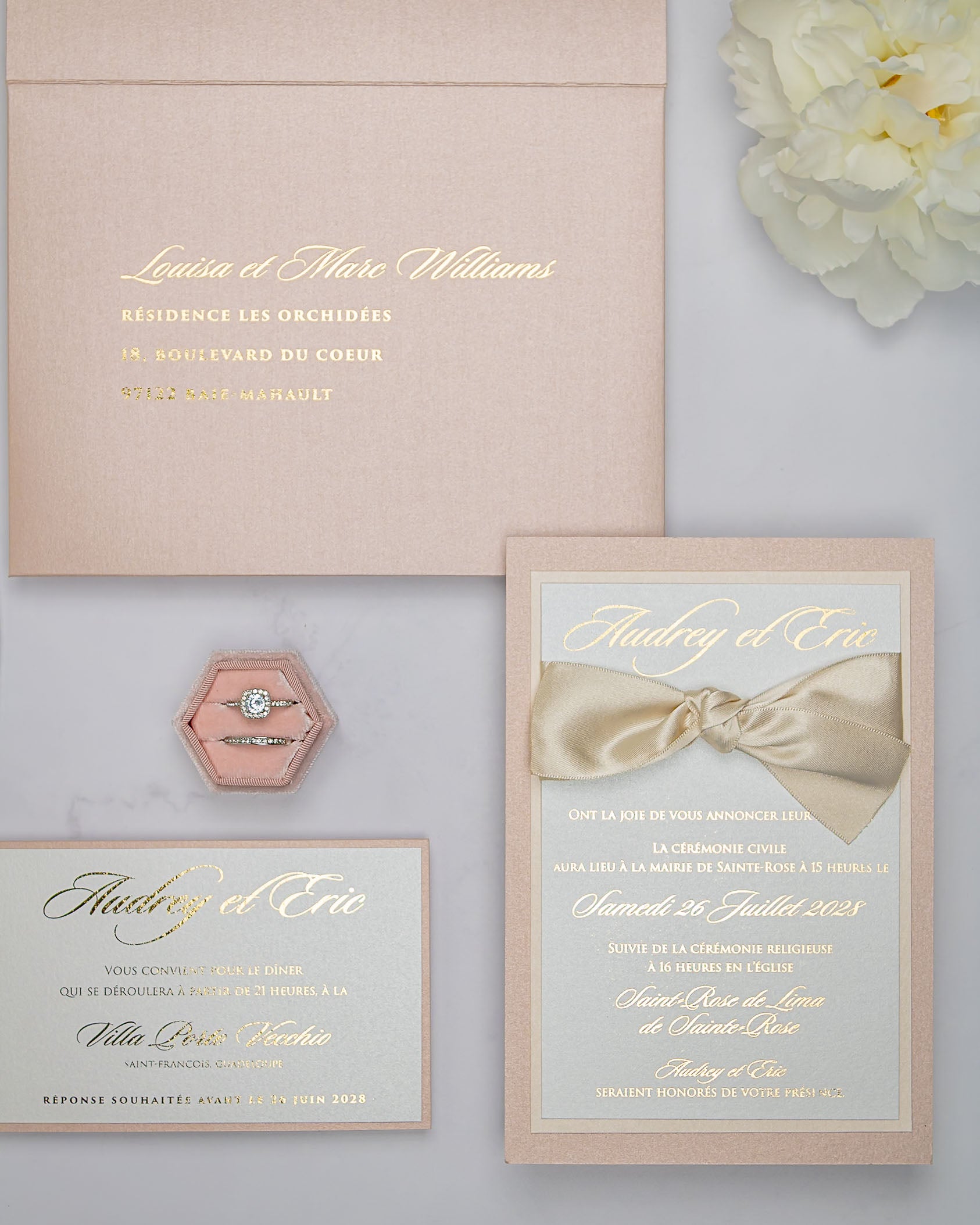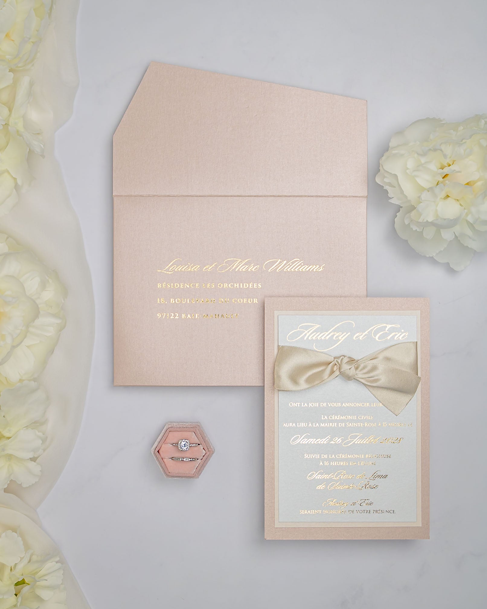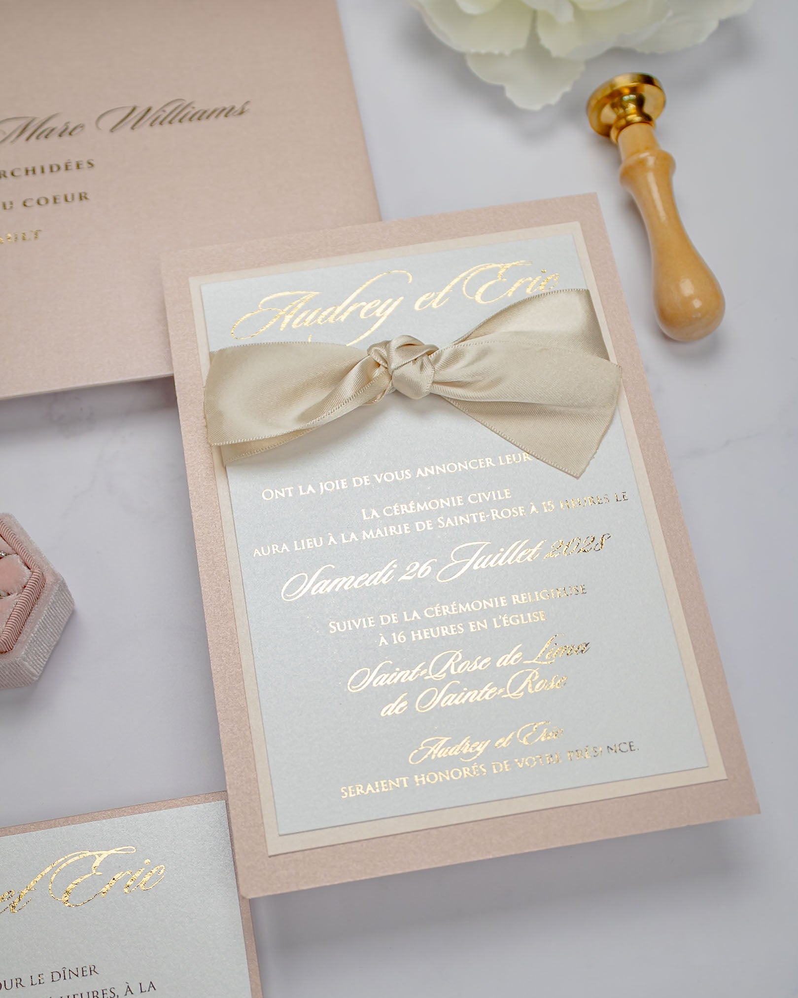 Elégant faire-part de mariage chic et romantique, sublimé par un beau ruban en satin.