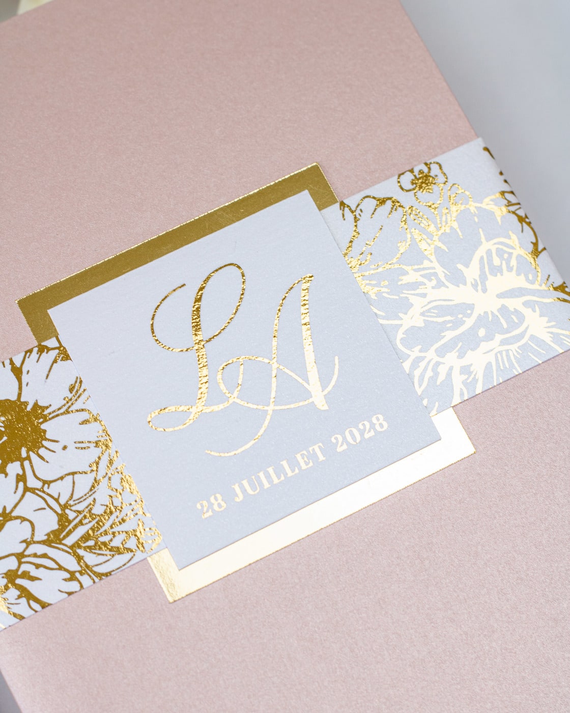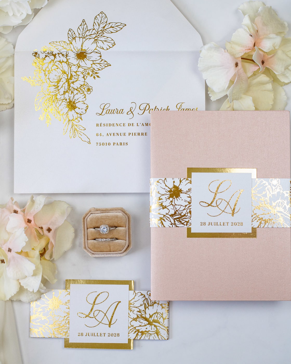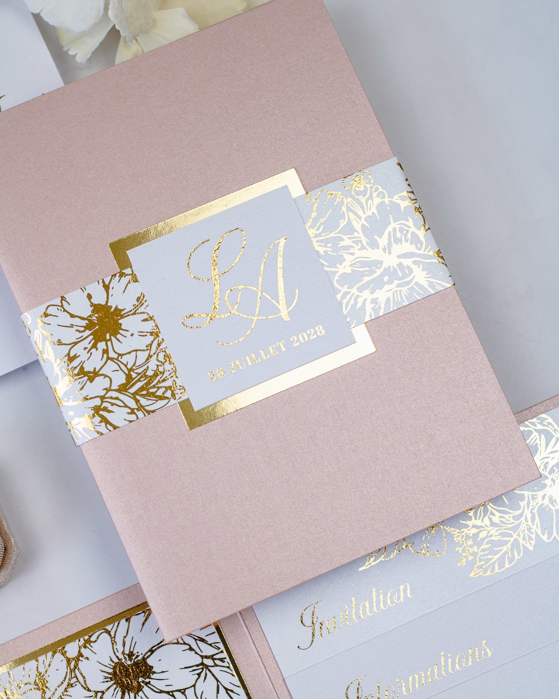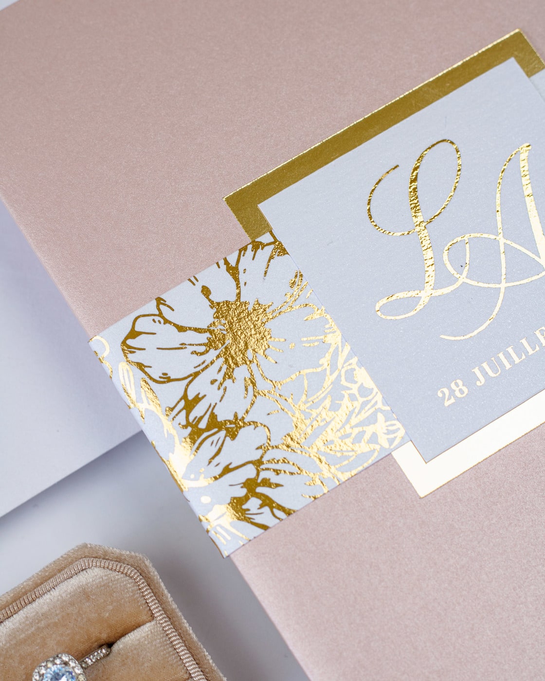 Magnifique faire-part de mariage chic et romantique, sublimé par la finition dorure des motifs floraux, et délicatement fermé avec une ceinture en papier et une carte personnalisée.
