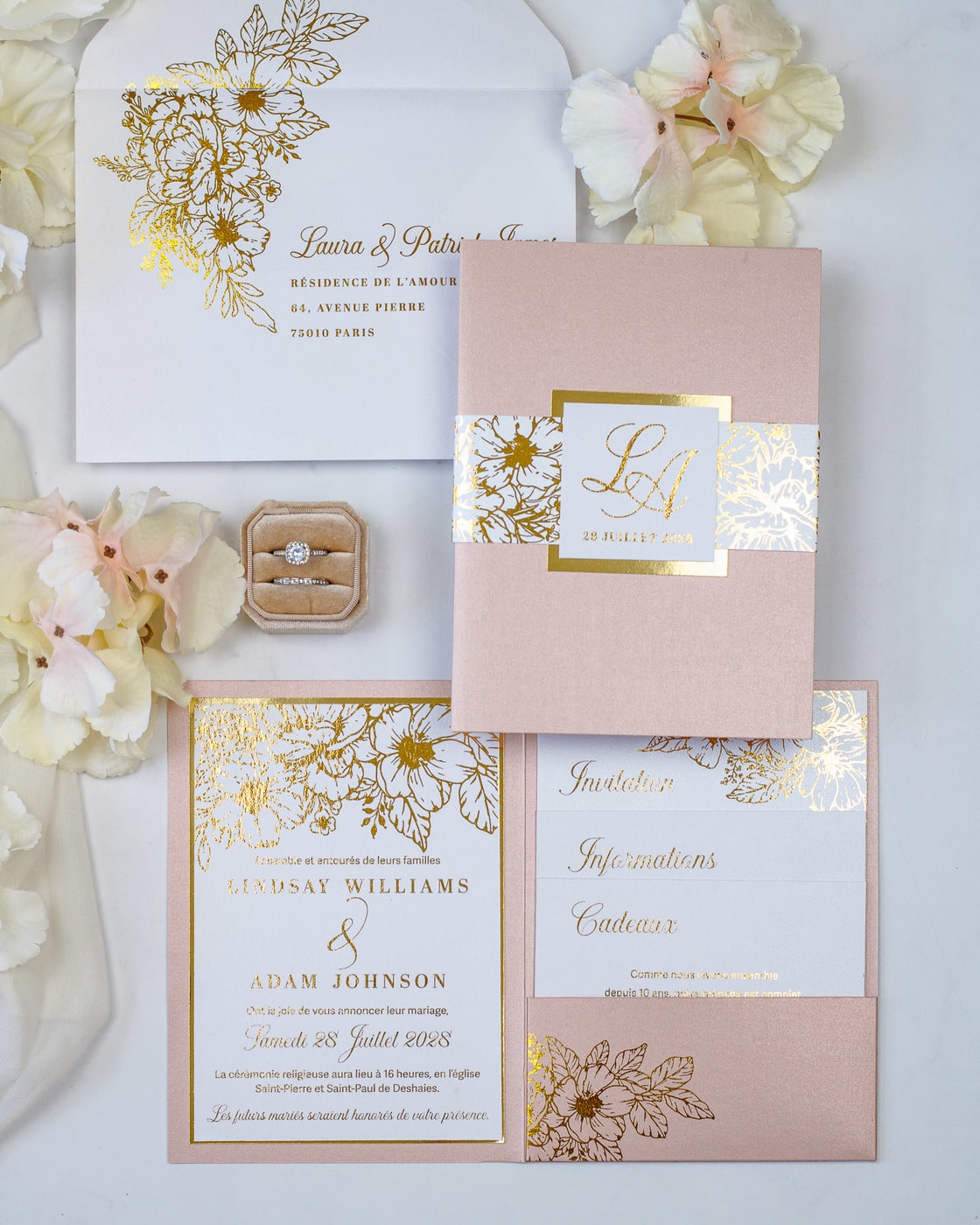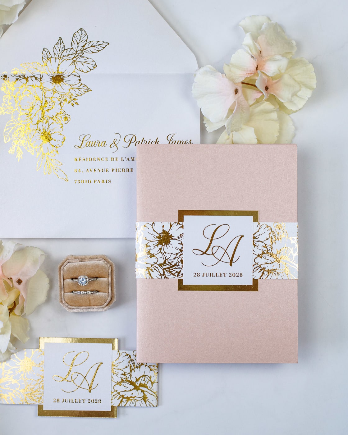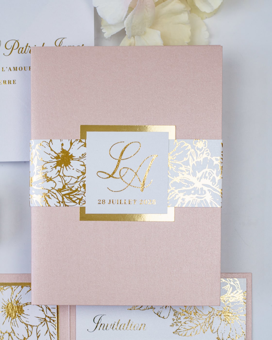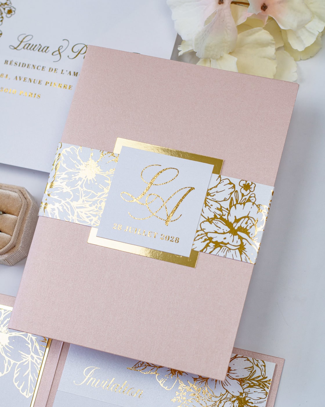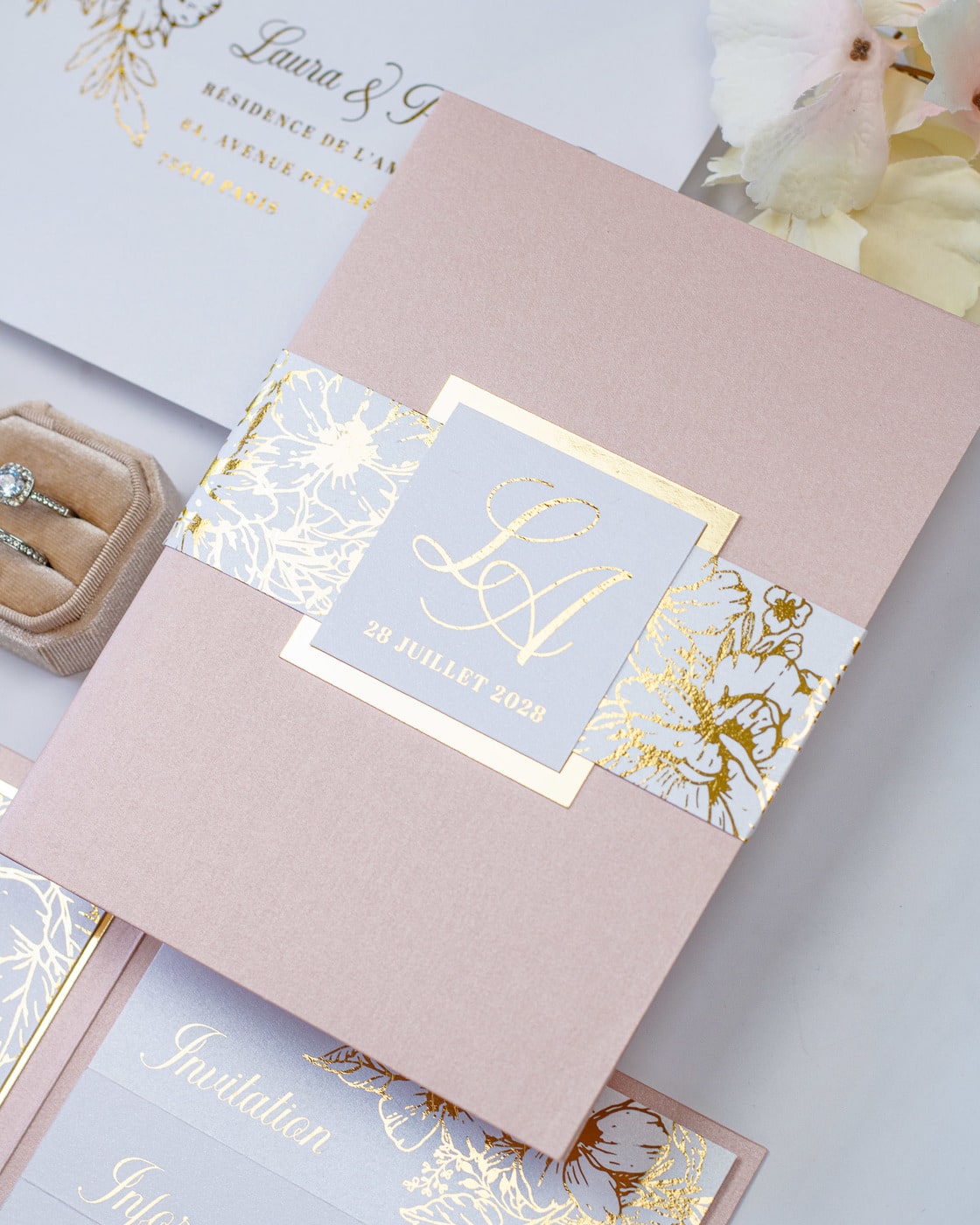 Magnifique faire-part de mariage chic et romantique, sublimé par la finition dorure des motifs floraux, et délicatement fermé avec une ceinture en papier et une carte personnalisée.
