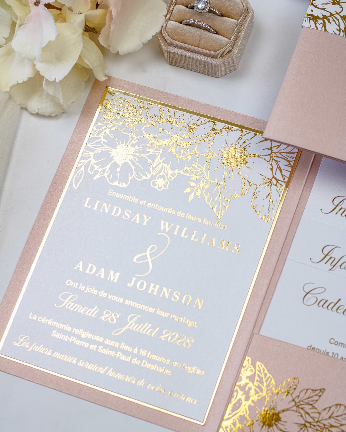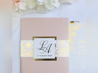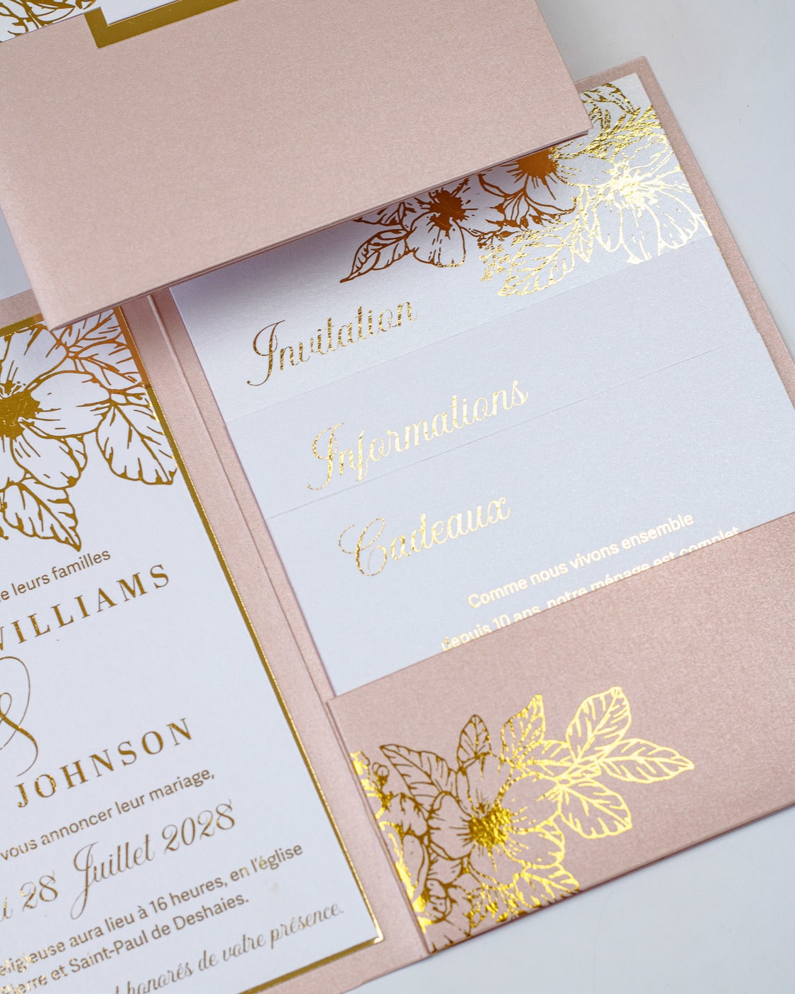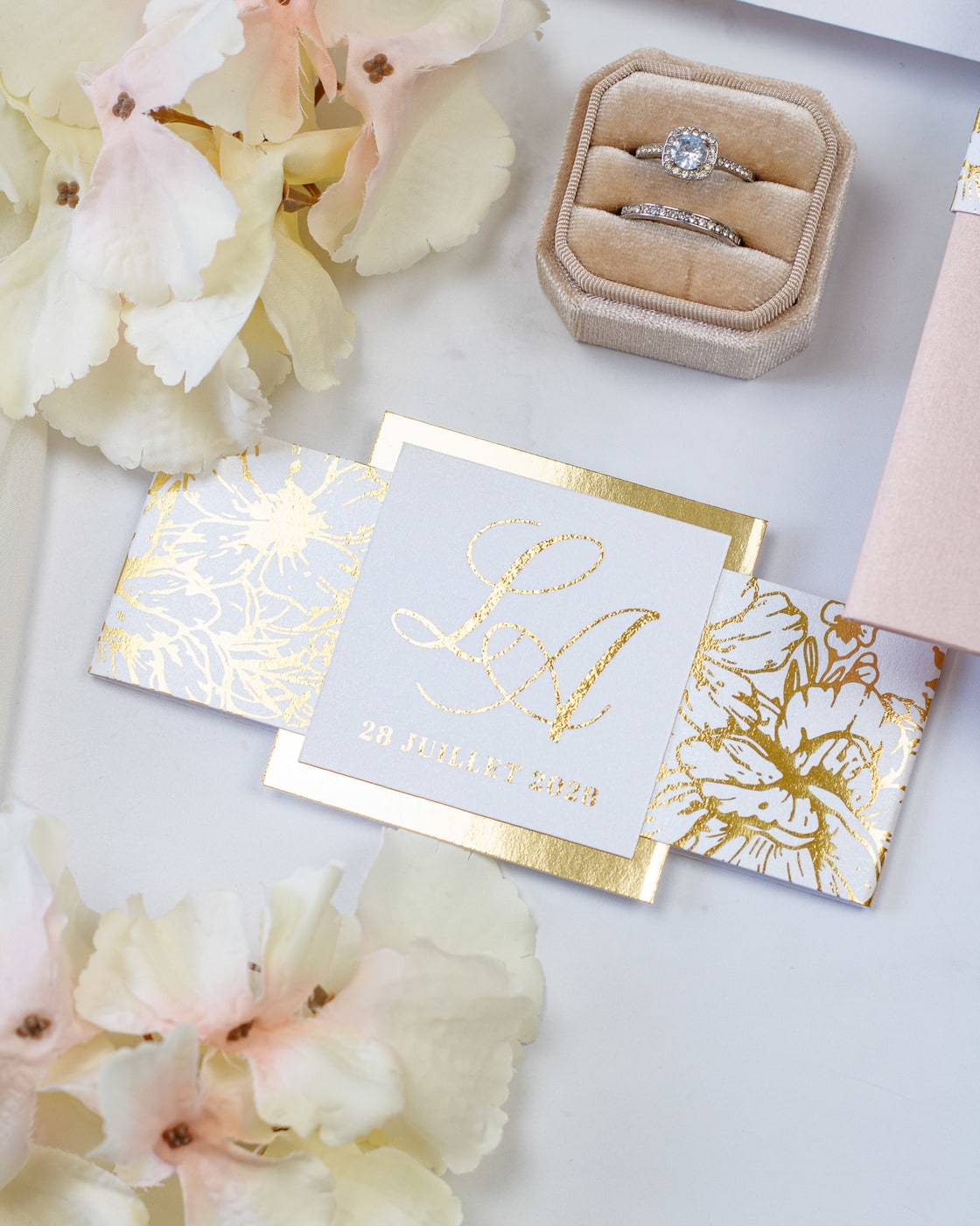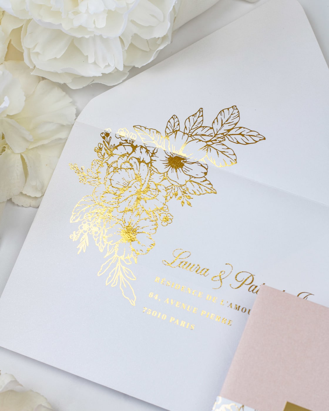 Magnifique faire-part de mariage chic et romantique, sublimé par la finition dorure des motifs floraux, et délicatement fermé avec une ceinture en papier et une carte personnalisée.