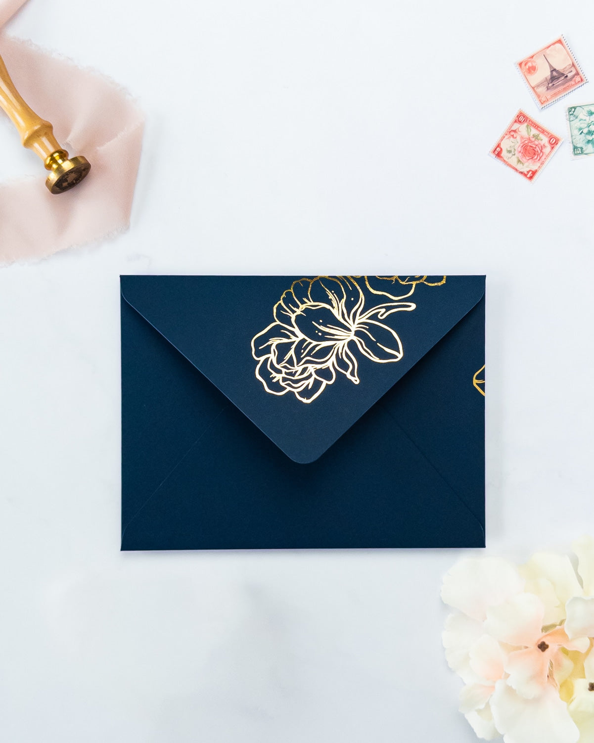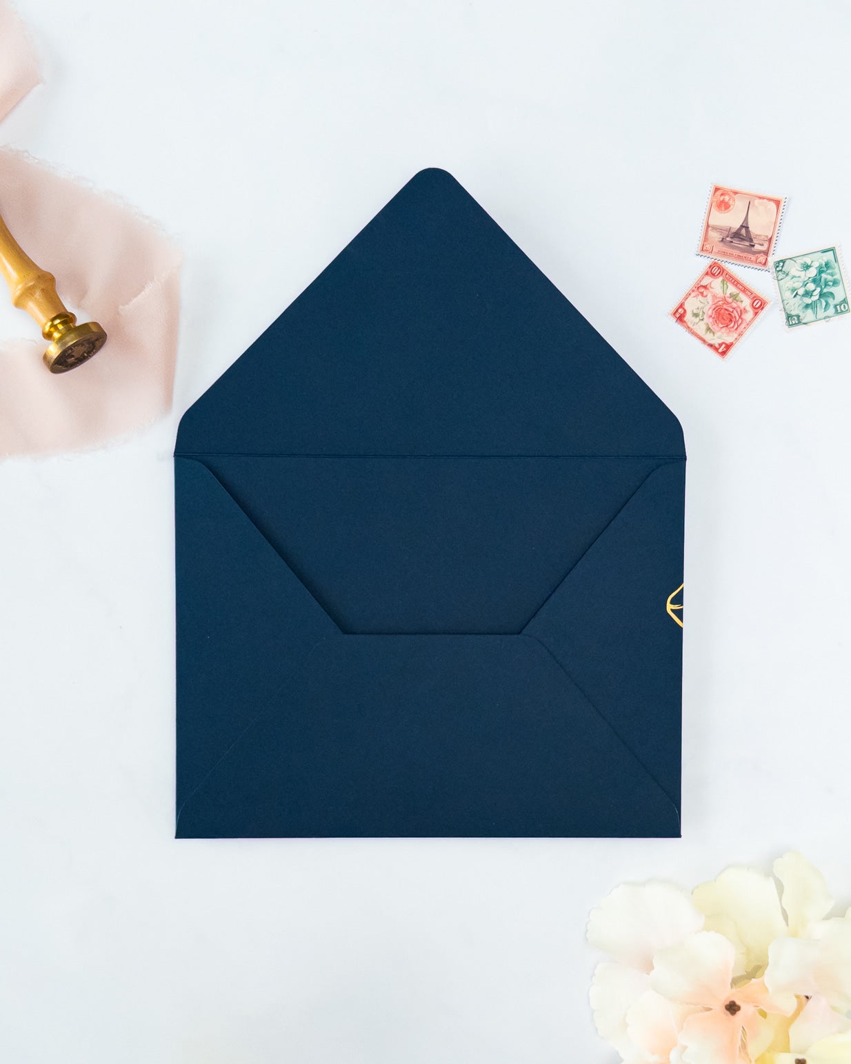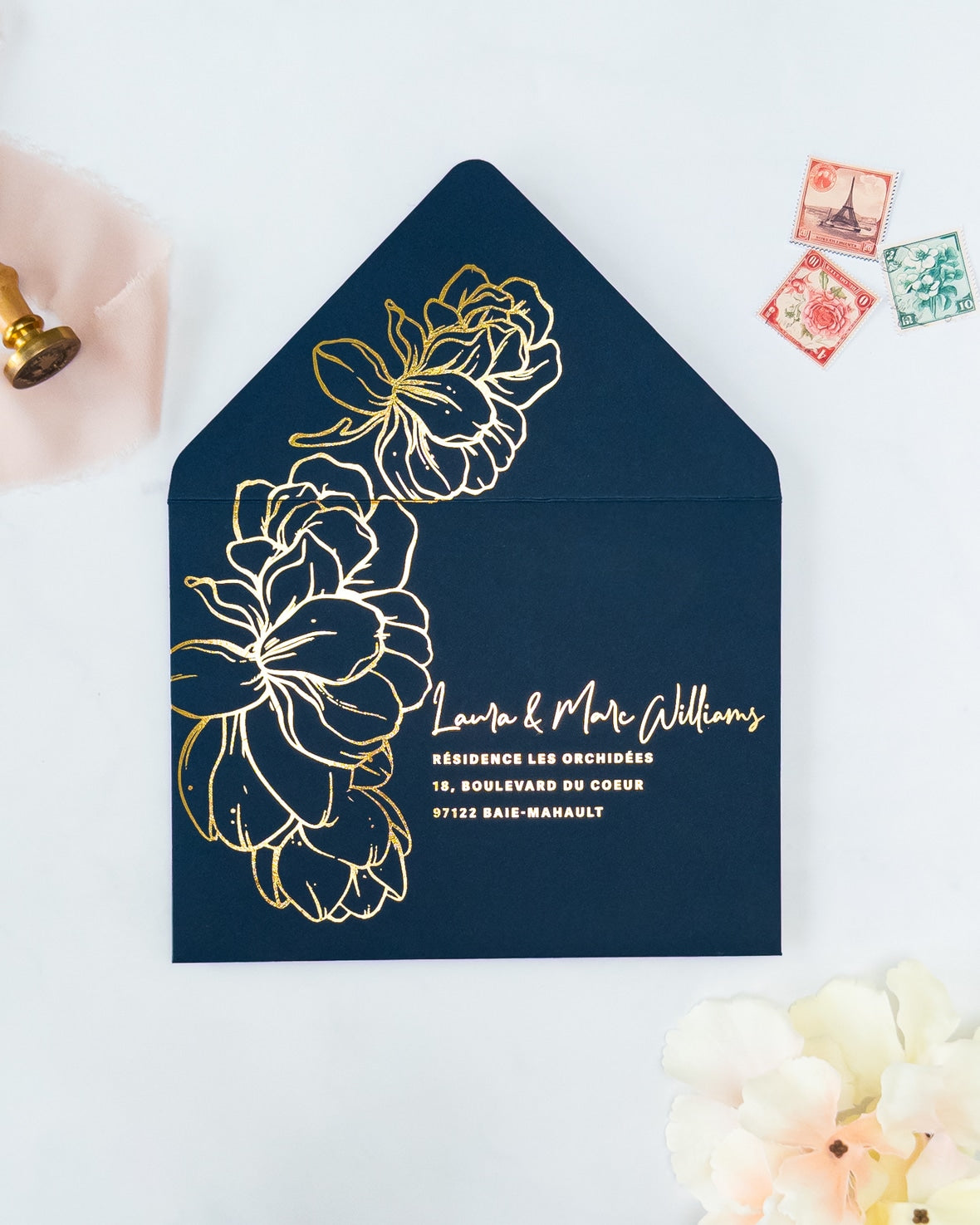 Nos enveloppes chics et élégantes, sont entièrement faites à la main avec amour et soin. Laissez-nous éblouir vos invités pour votre grand jour !