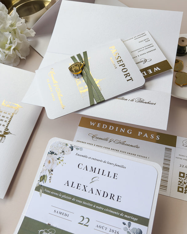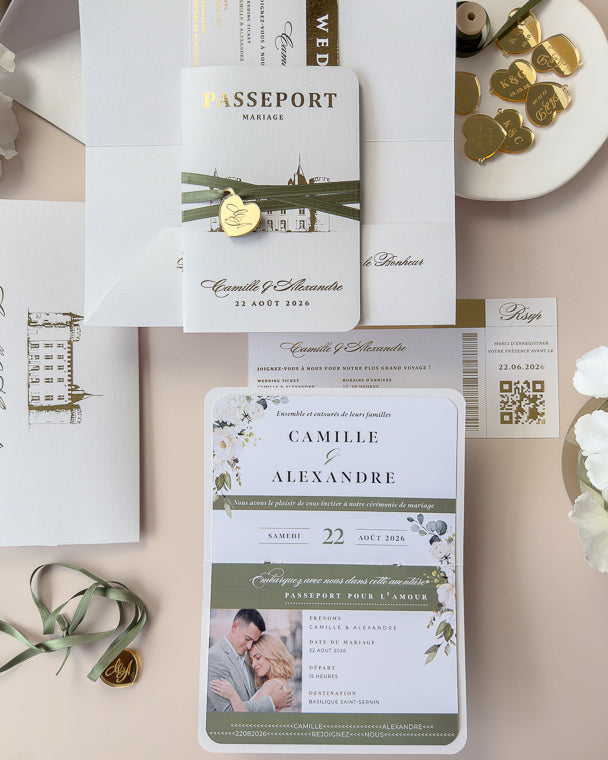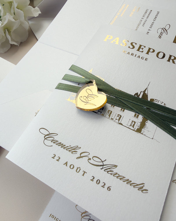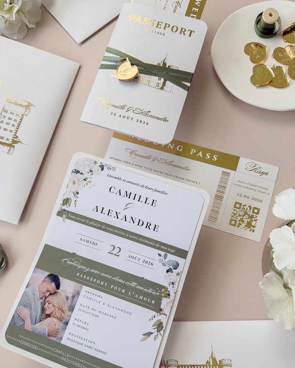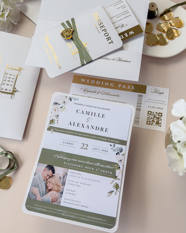 Elégant faire-part de mariage sous forme de Passeport. Un design sophistiqué et intemporel. C’est le choix parfait si vous êtes des mariés à la recherche d’un faire-part moderne et unique.
