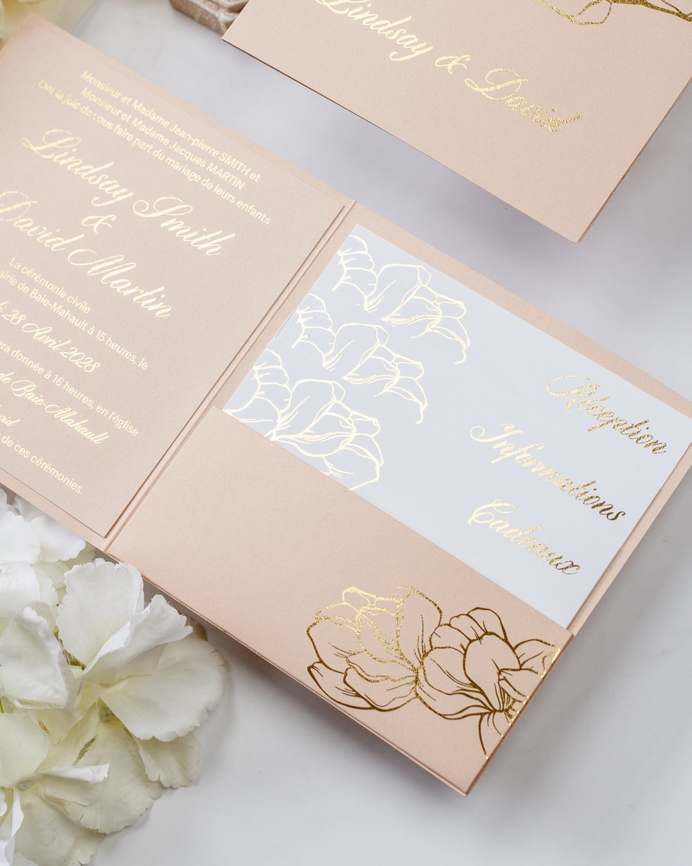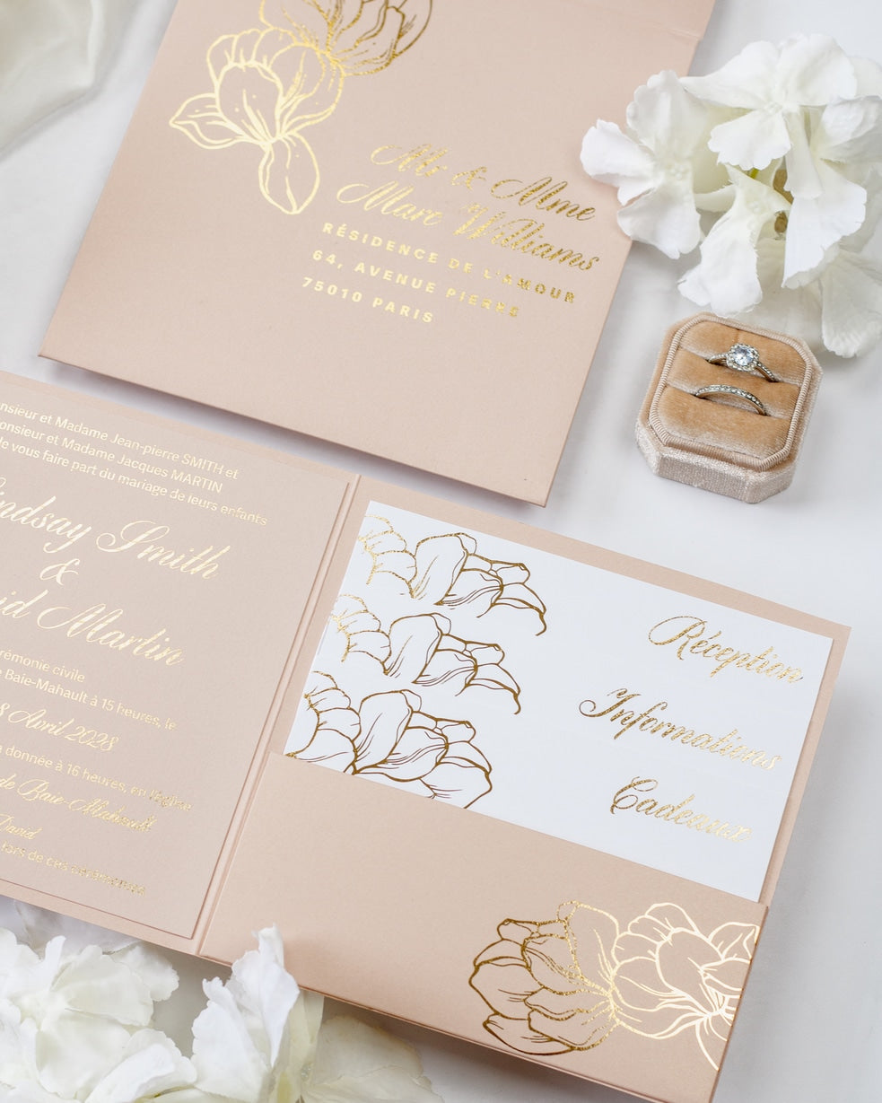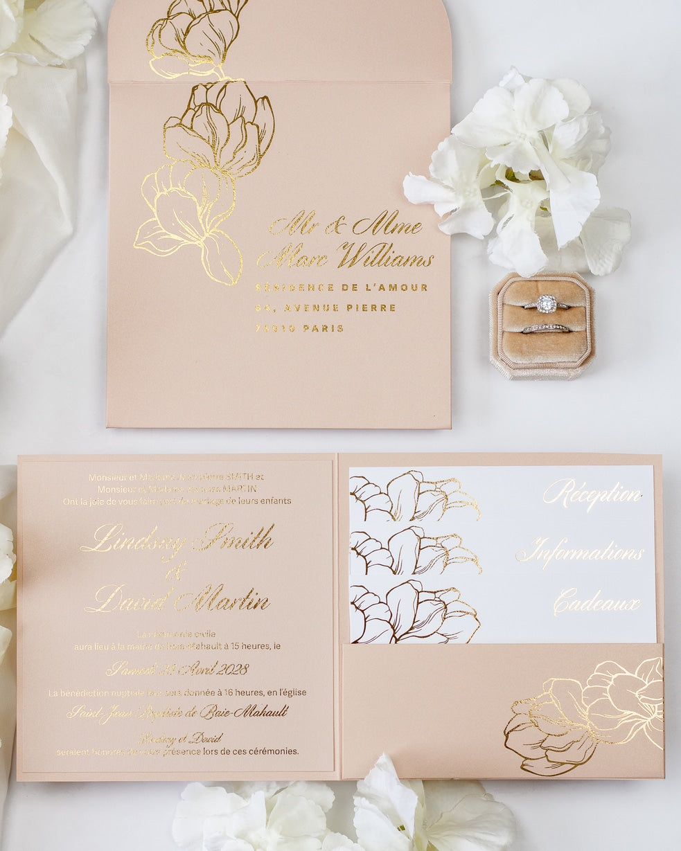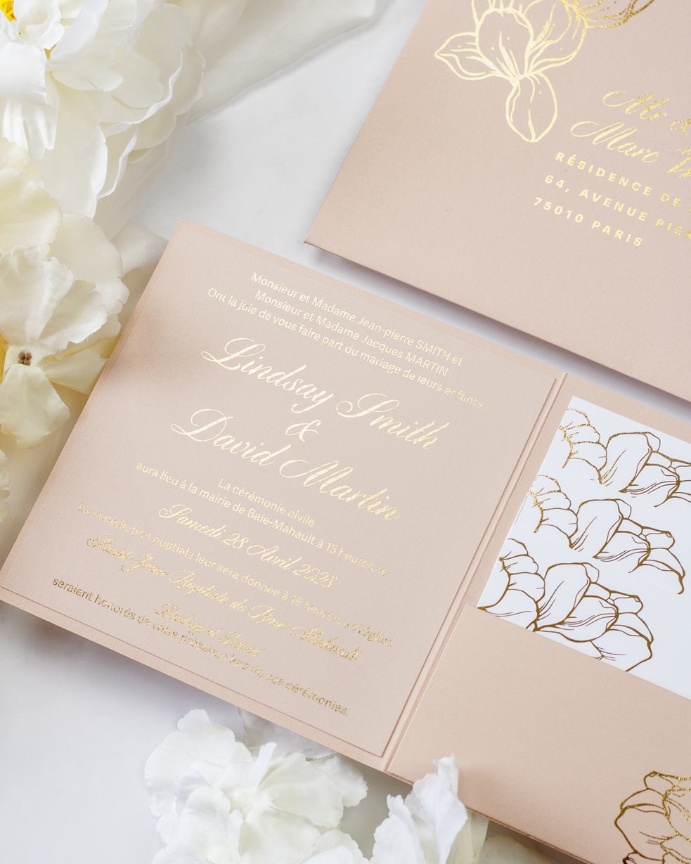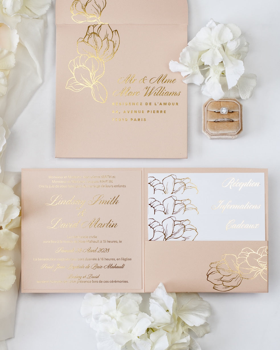 Ce Faire-part de mariage, sobre et romantique, est sublimé par la finition dorure des motifs floraux.