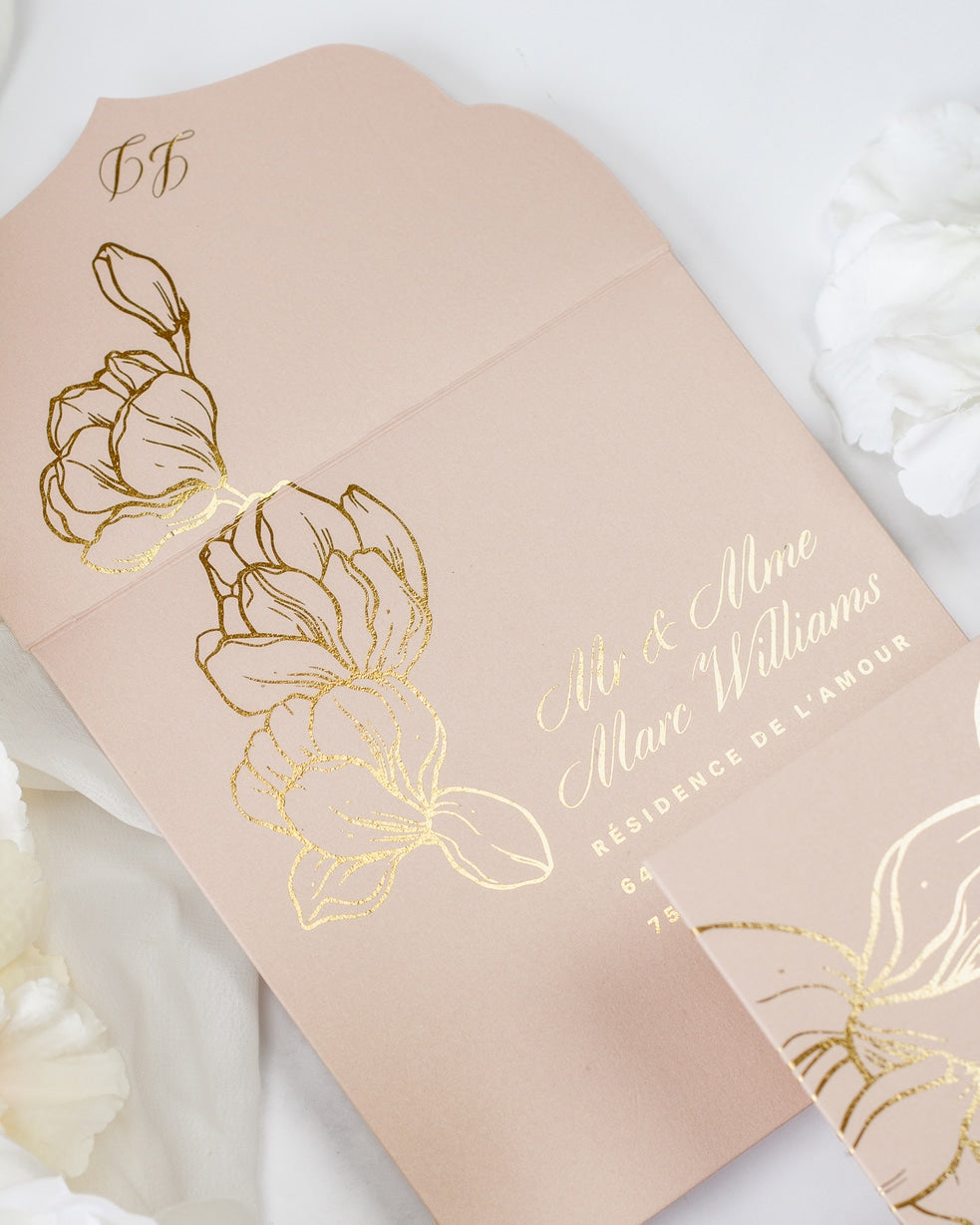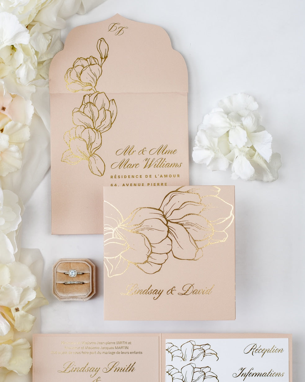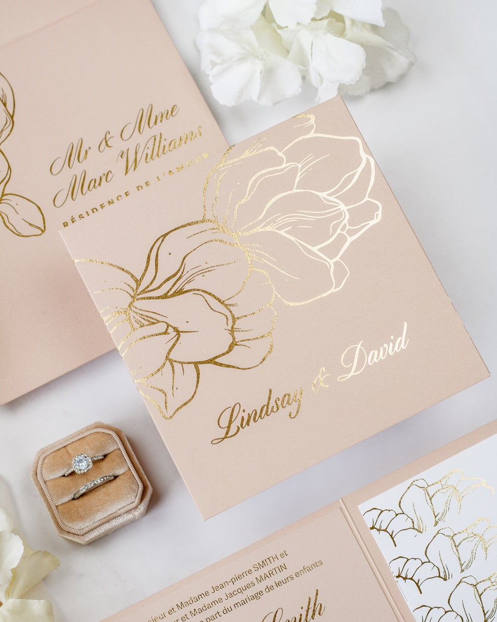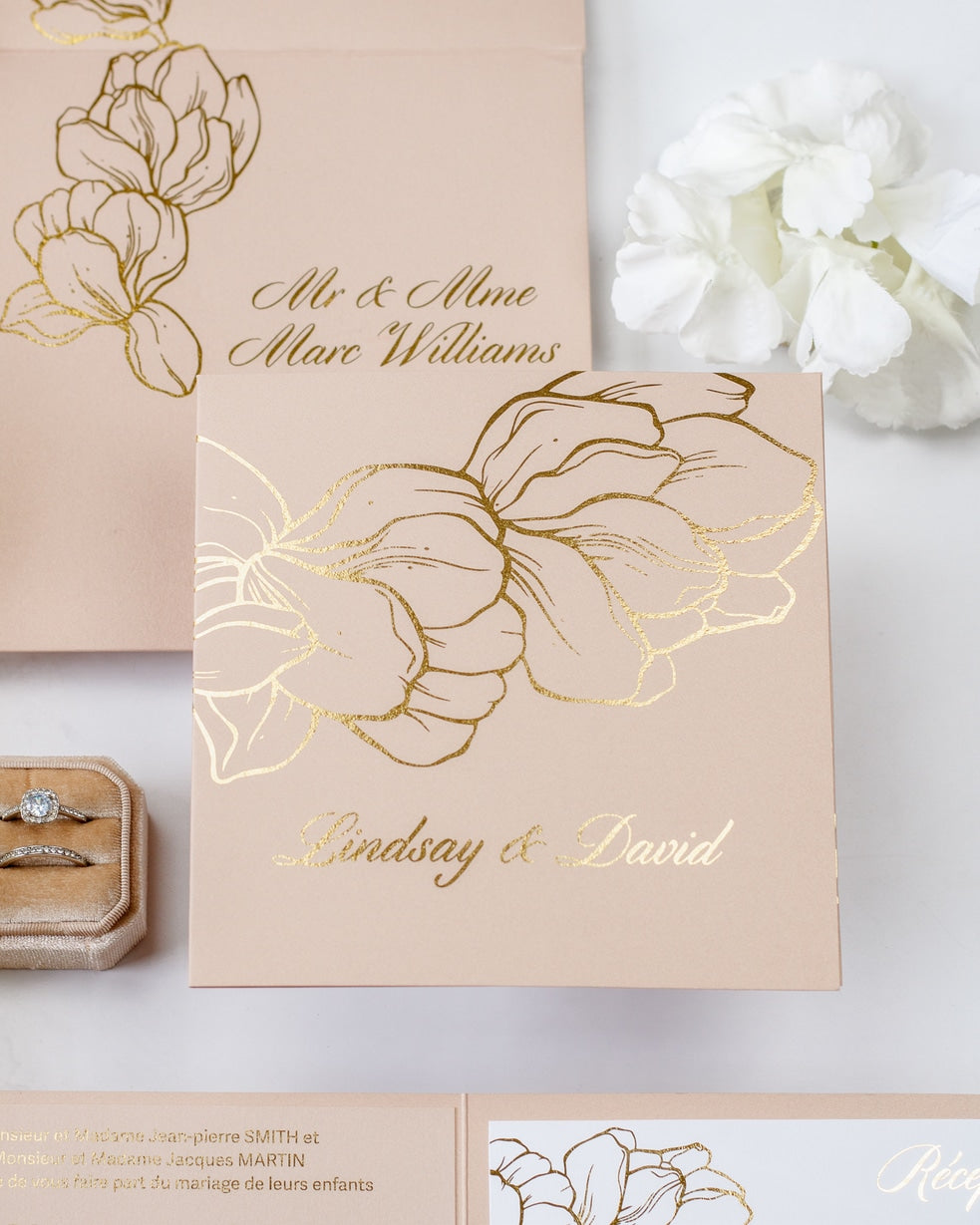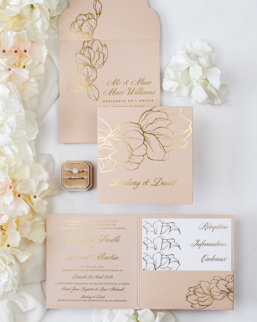 Ce Faire-part de mariage, sobre et romantique, est sublimé par la finition dorure des motifs floraux.