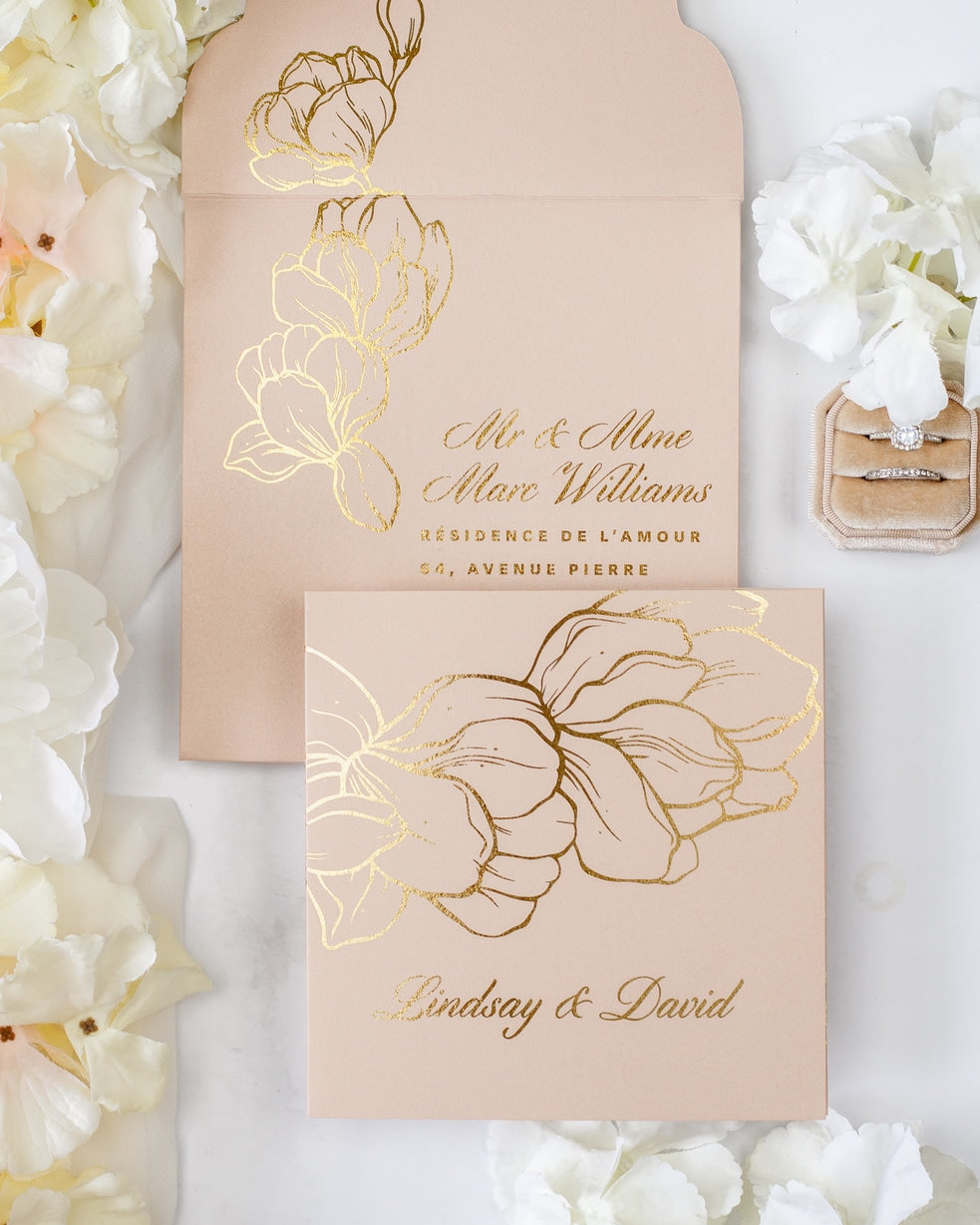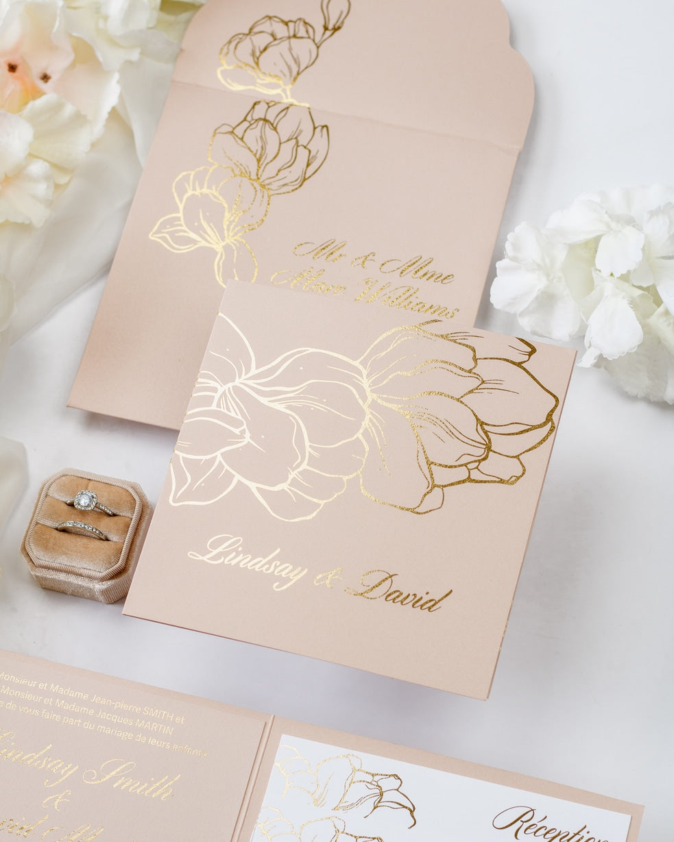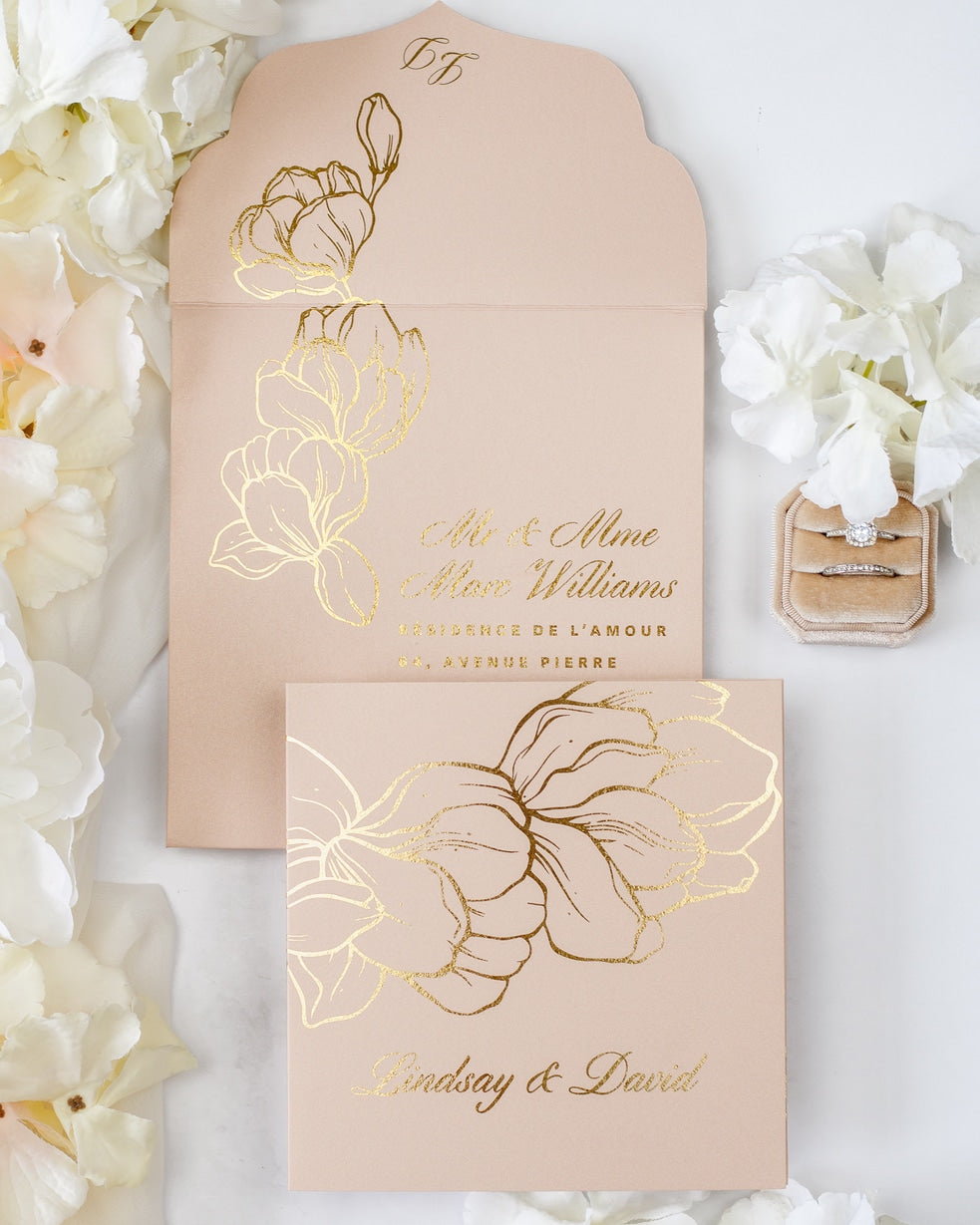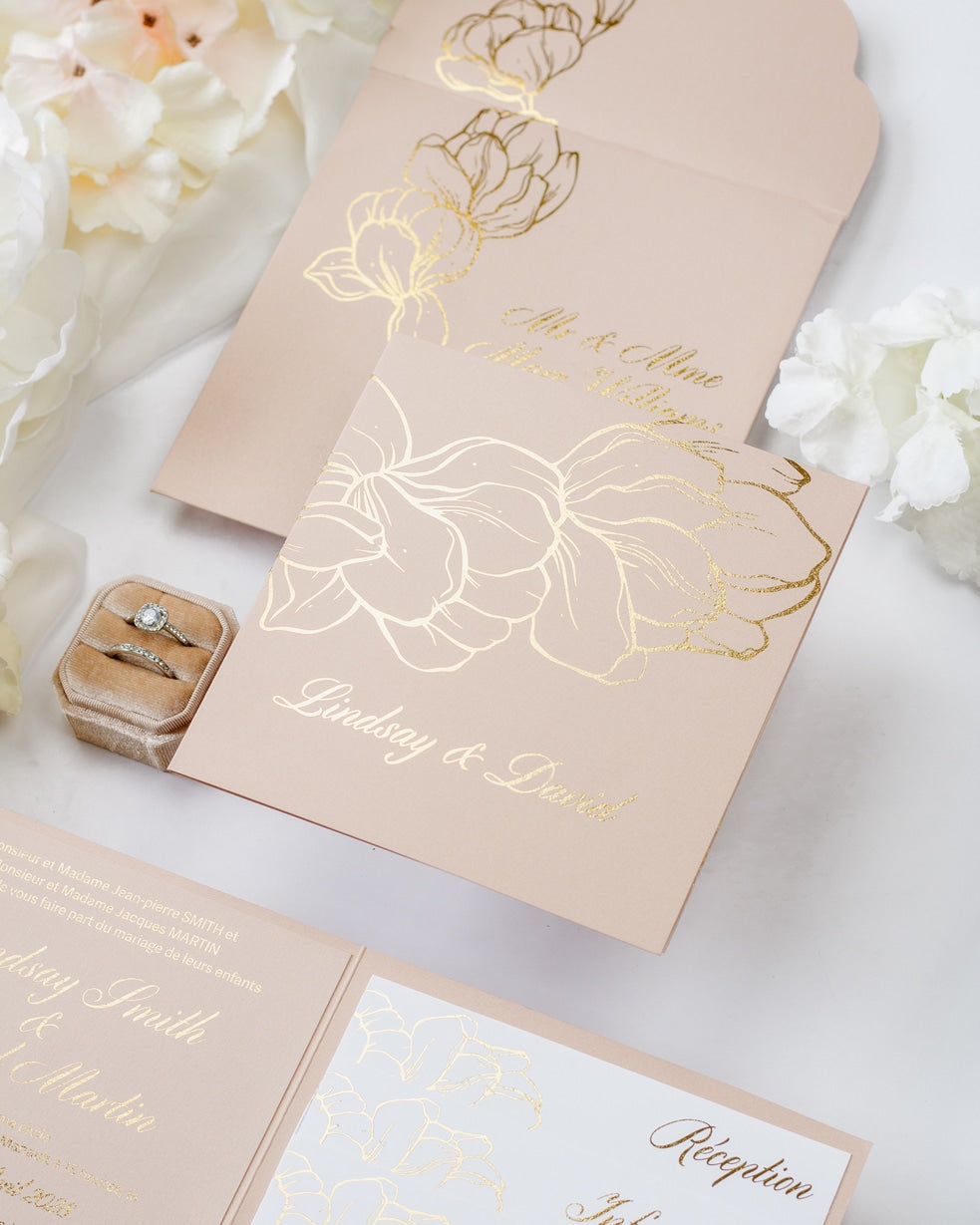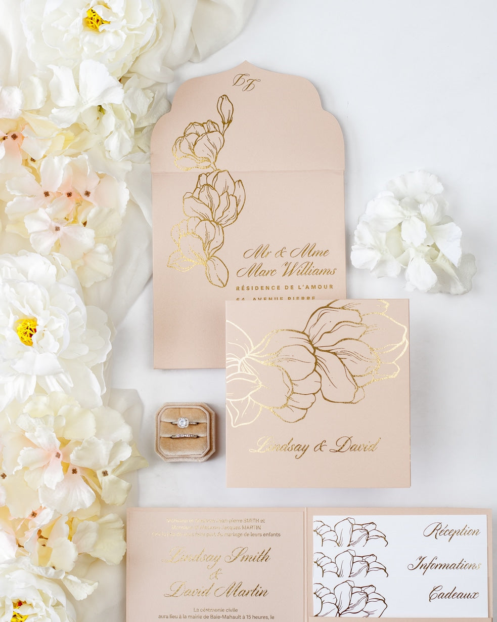 Ce Faire-part de mariage, sobre et romantique, est sublimé par la finition dorure des motifs floraux.