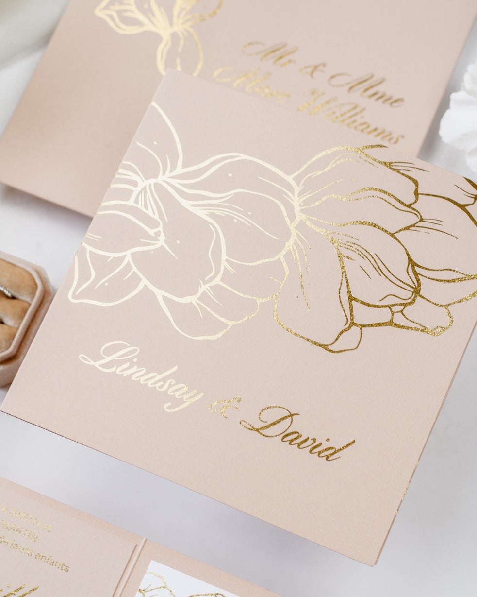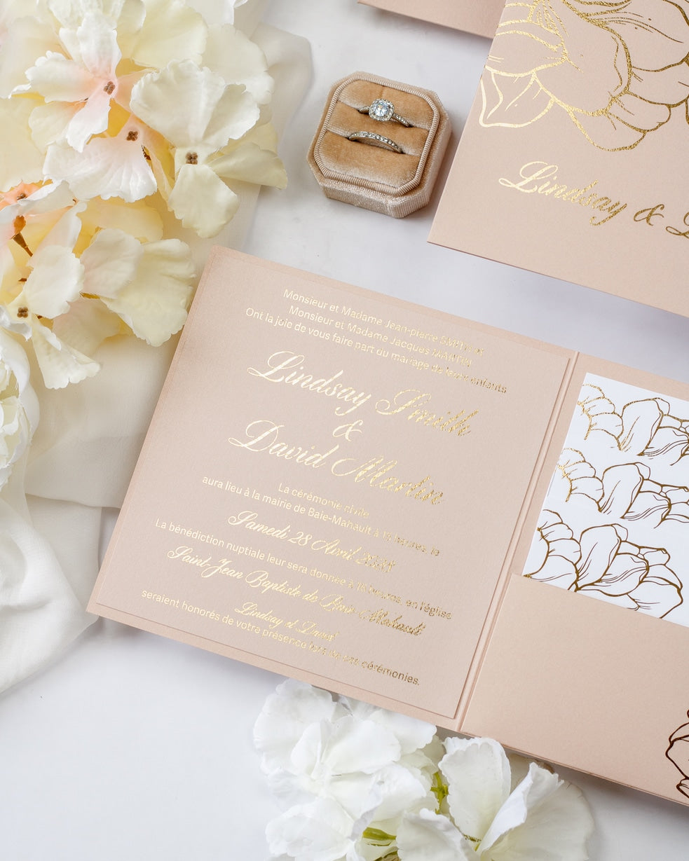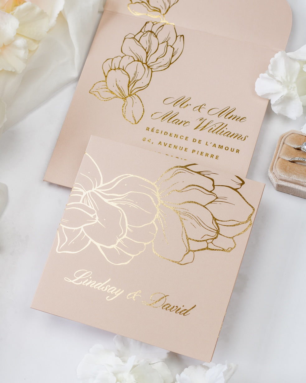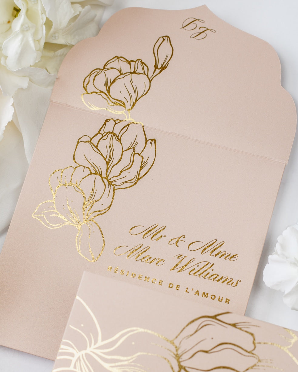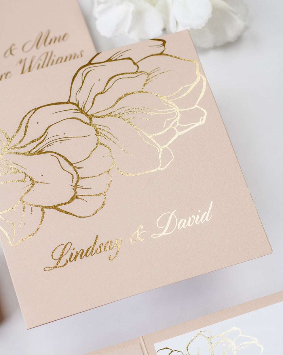 Ce Faire-part de mariage, sobre et romantique, est sublimé par la finition dorure des motifs floraux.