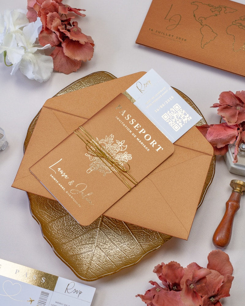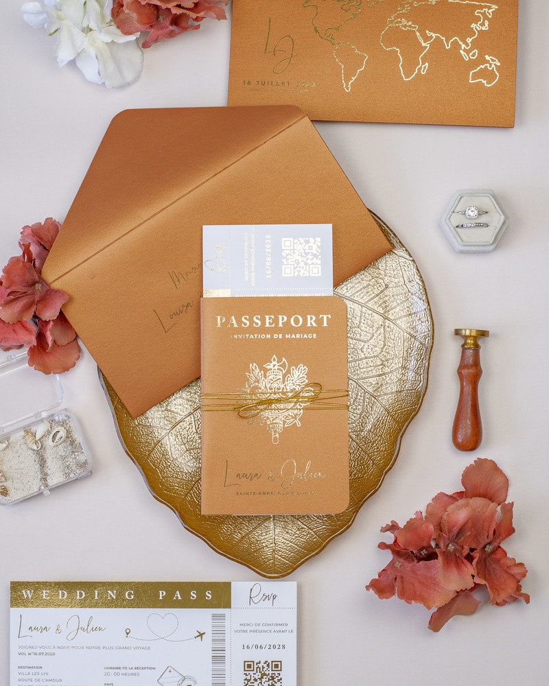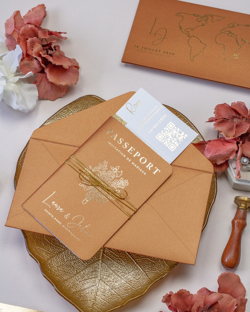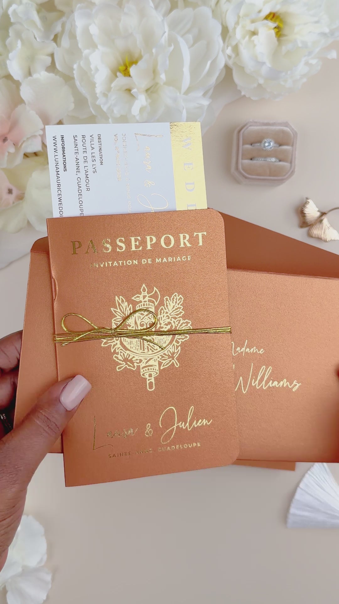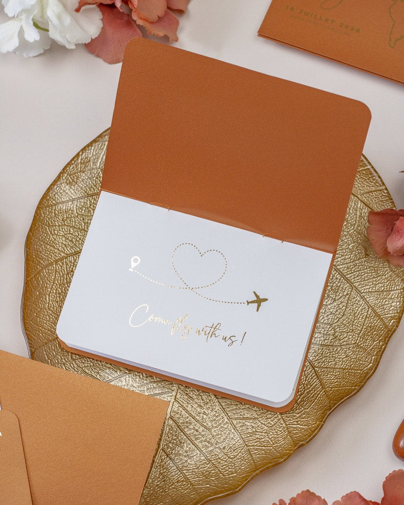 Elégant faire-part de mariage sous forme de Passeport. Un design sophistiqué et intemporel. C’est le choix parfait si vous êtes des mariés à la recherche d’un faire-part moderne et unique. Si vous souhaitez inclure plus d’informations, pensez à l’associer avec la pochette assortie.