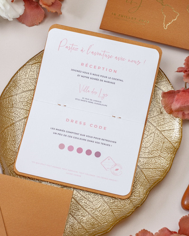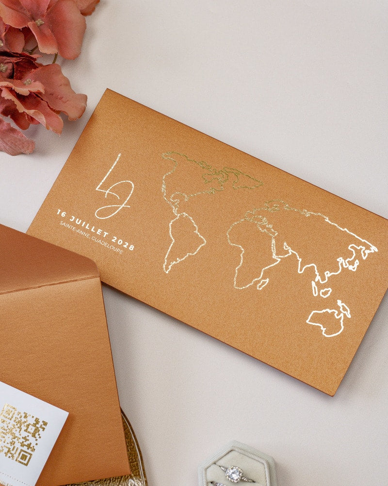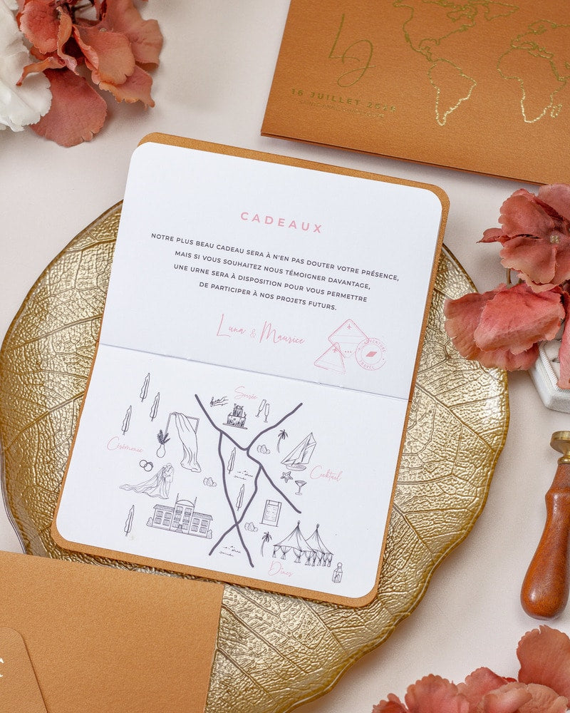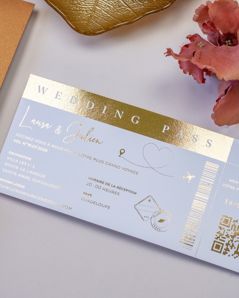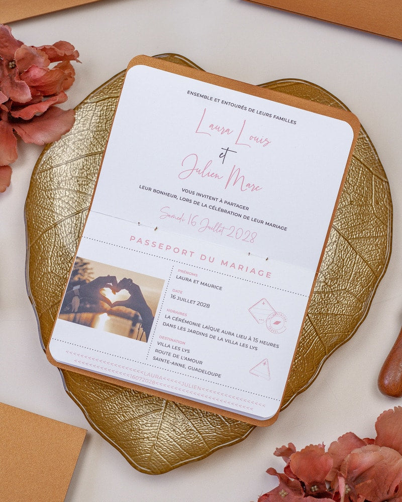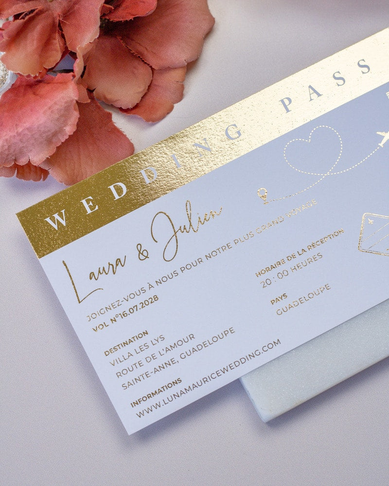 Elégant faire-part de mariage sous forme de Passeport. Un design sophistiqué et intemporel. C’est le choix parfait si vous êtes des mariés à la recherche d’un faire-part moderne et unique. Si vous souhaitez inclure plus d’informations, pensez à l’associer avec la pochette assortie.