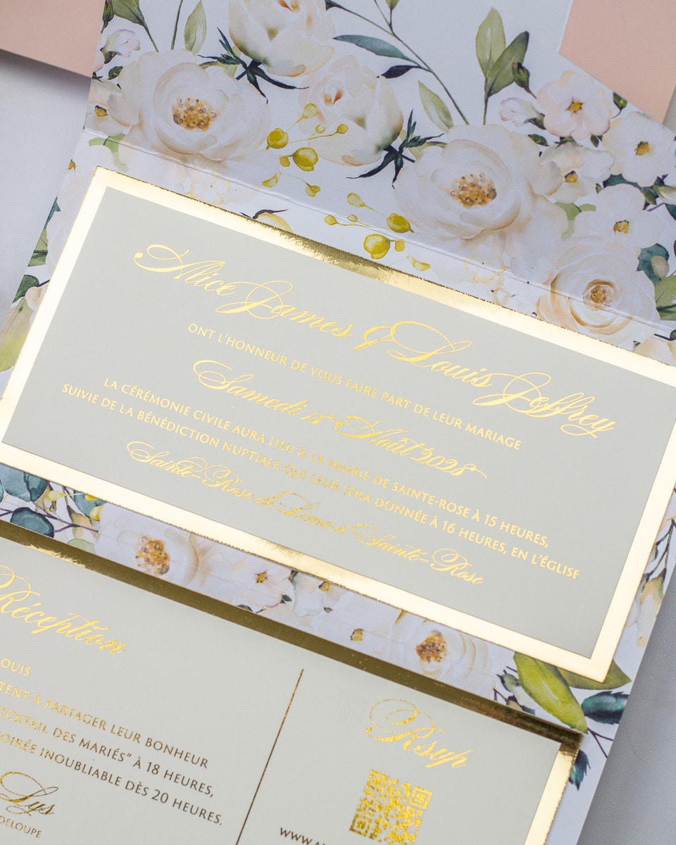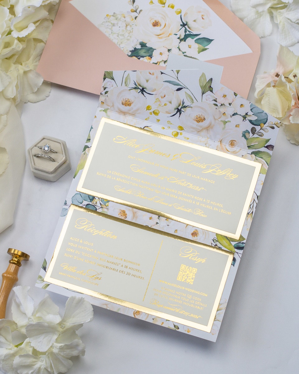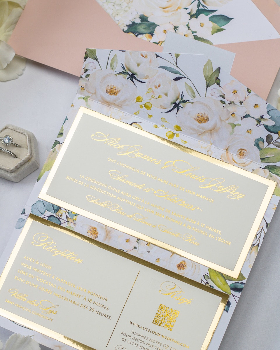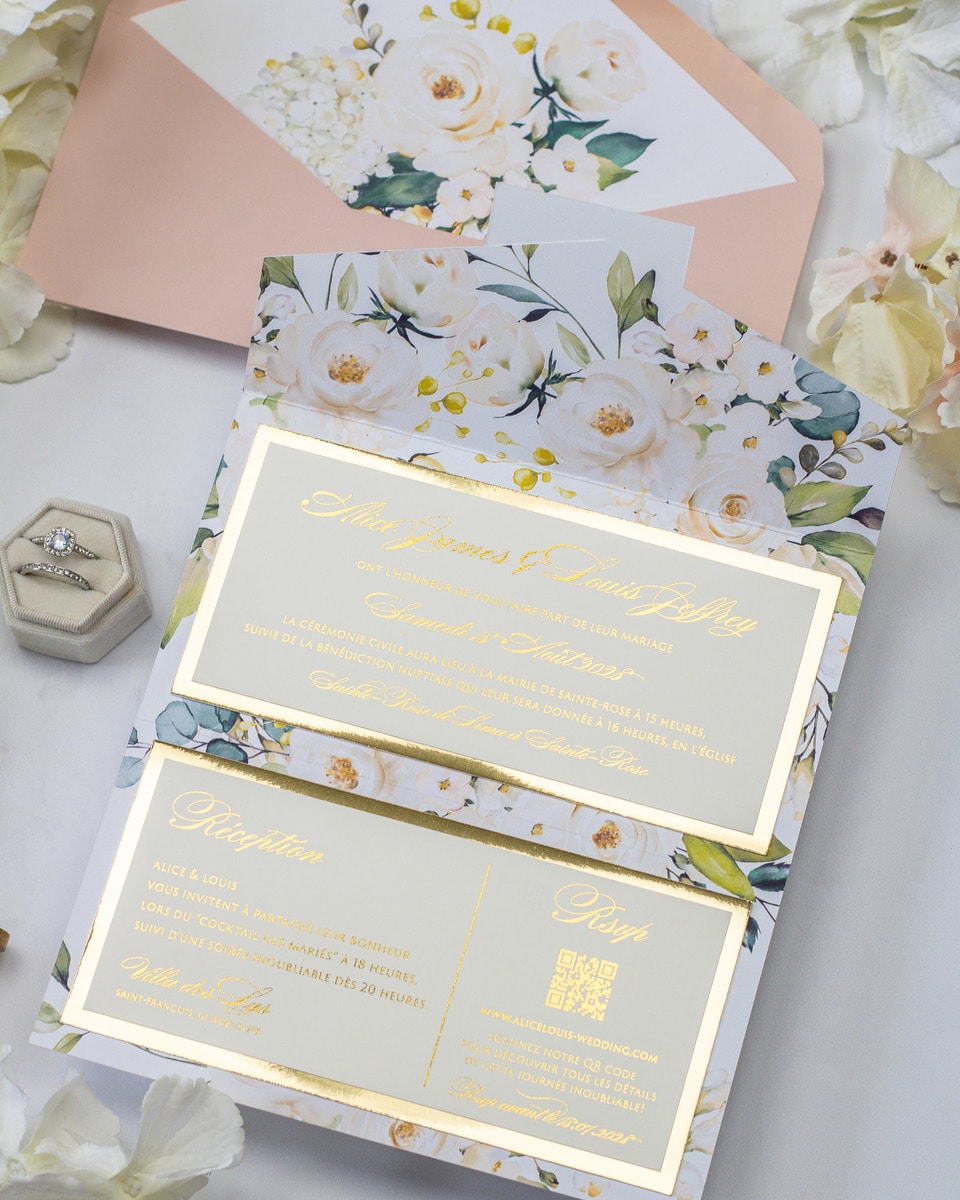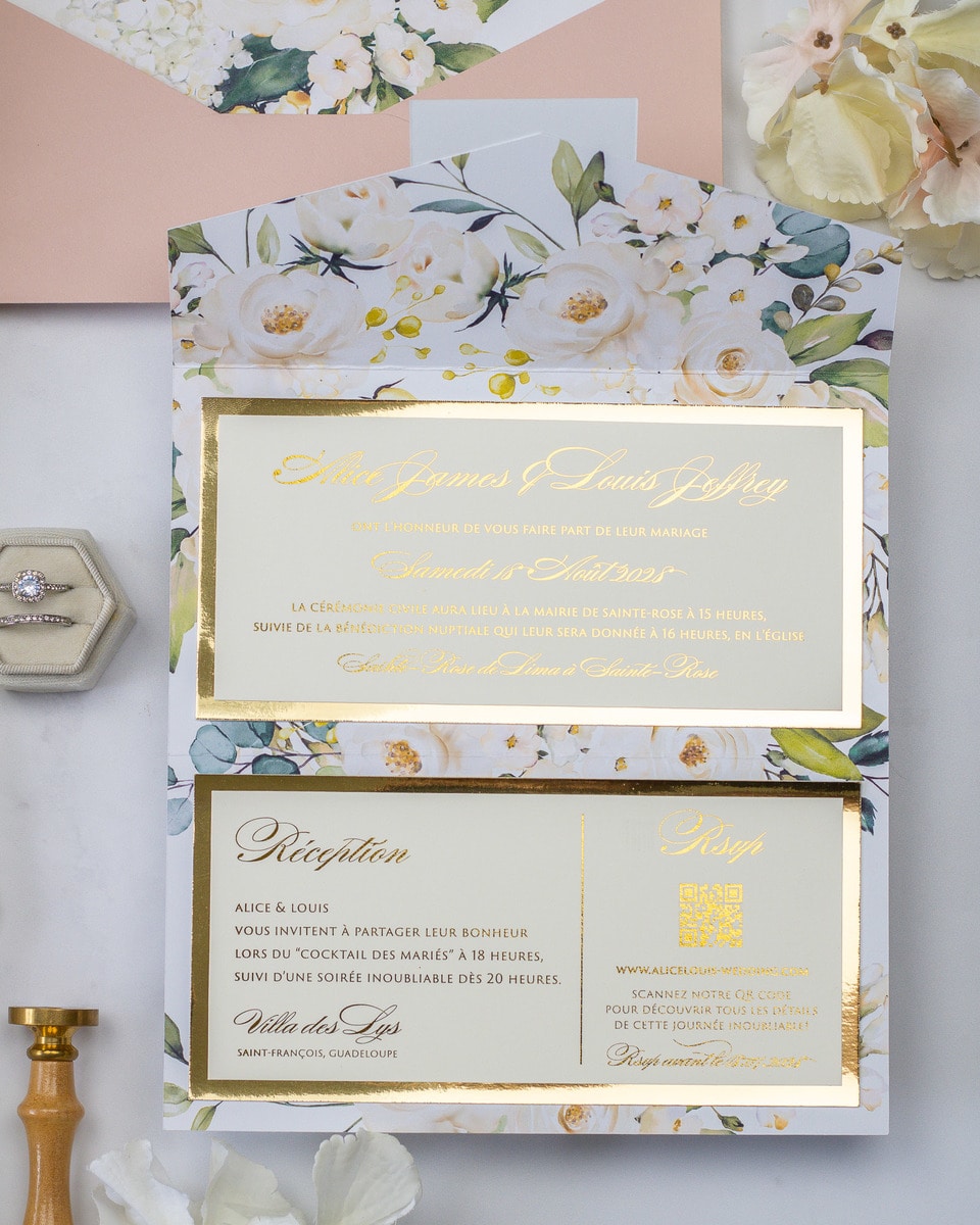 Faire-part fleuris et élégant, fermé par une étiquette personnalisée.