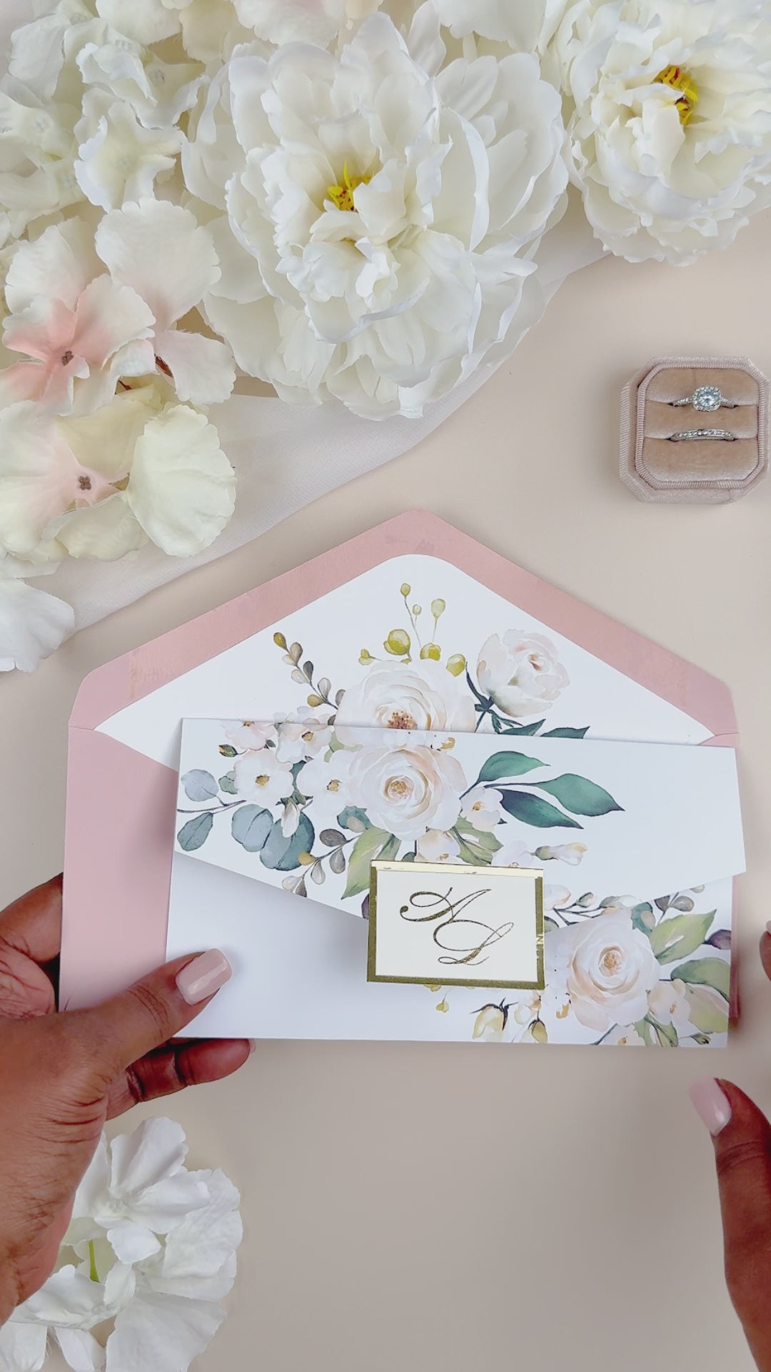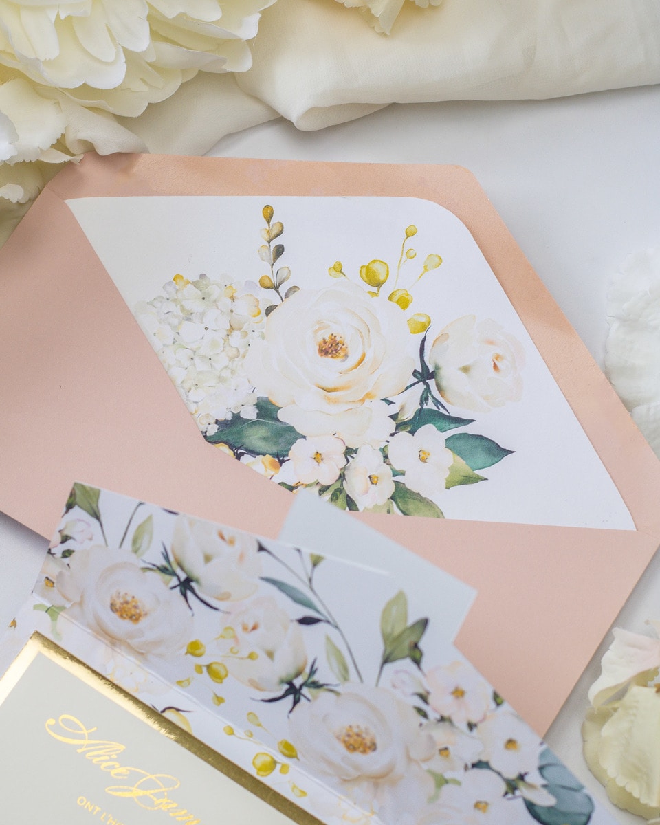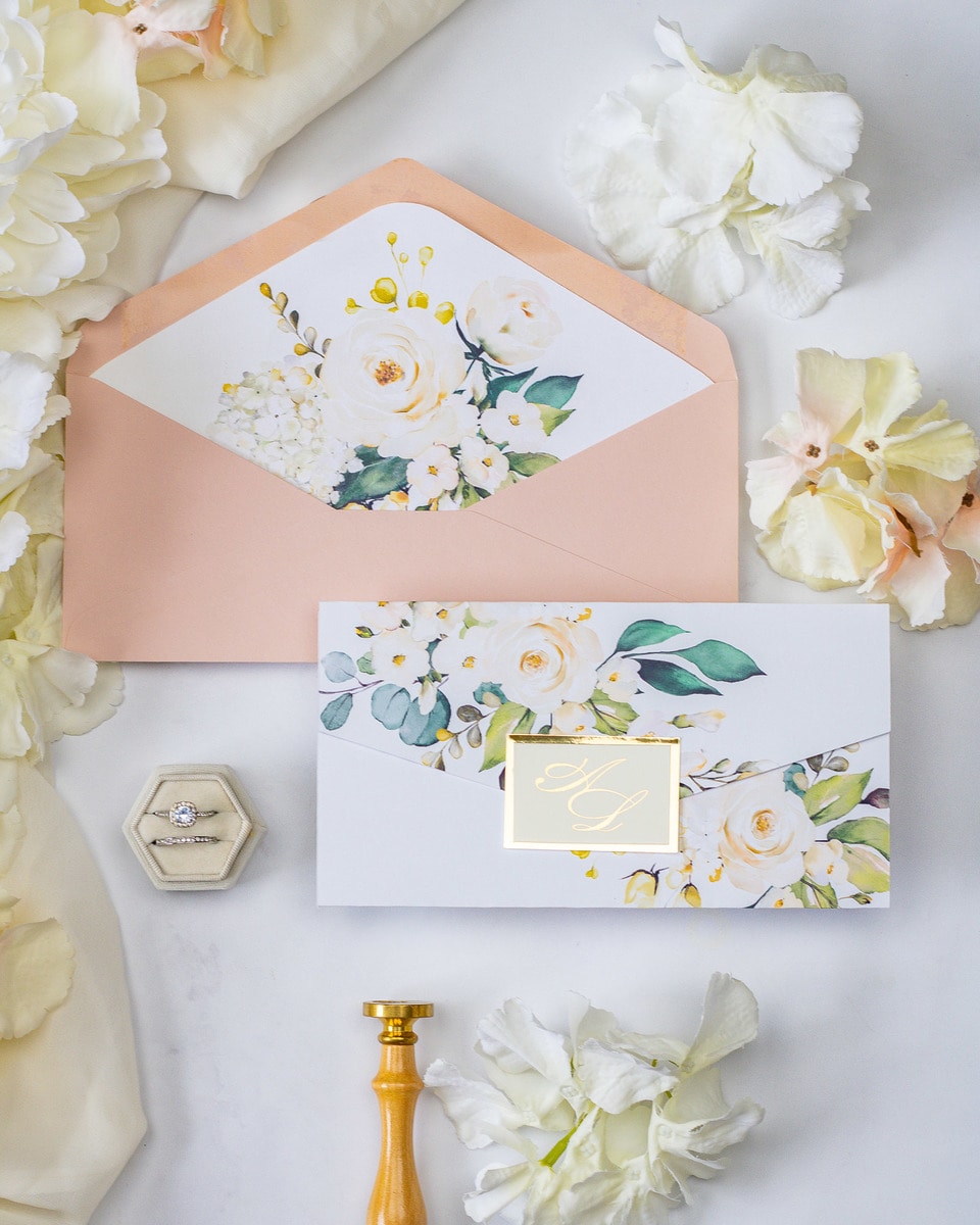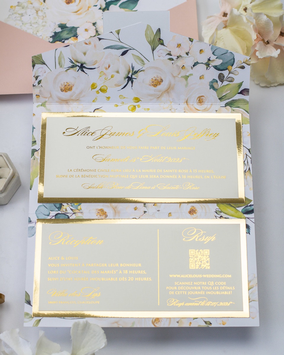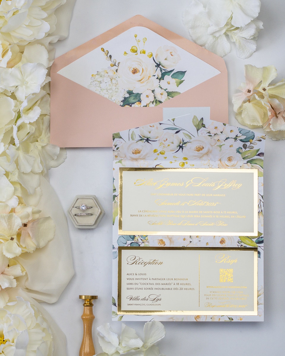 Faire-part fleuris et élégant, fermé par une étiquette personnalisée.